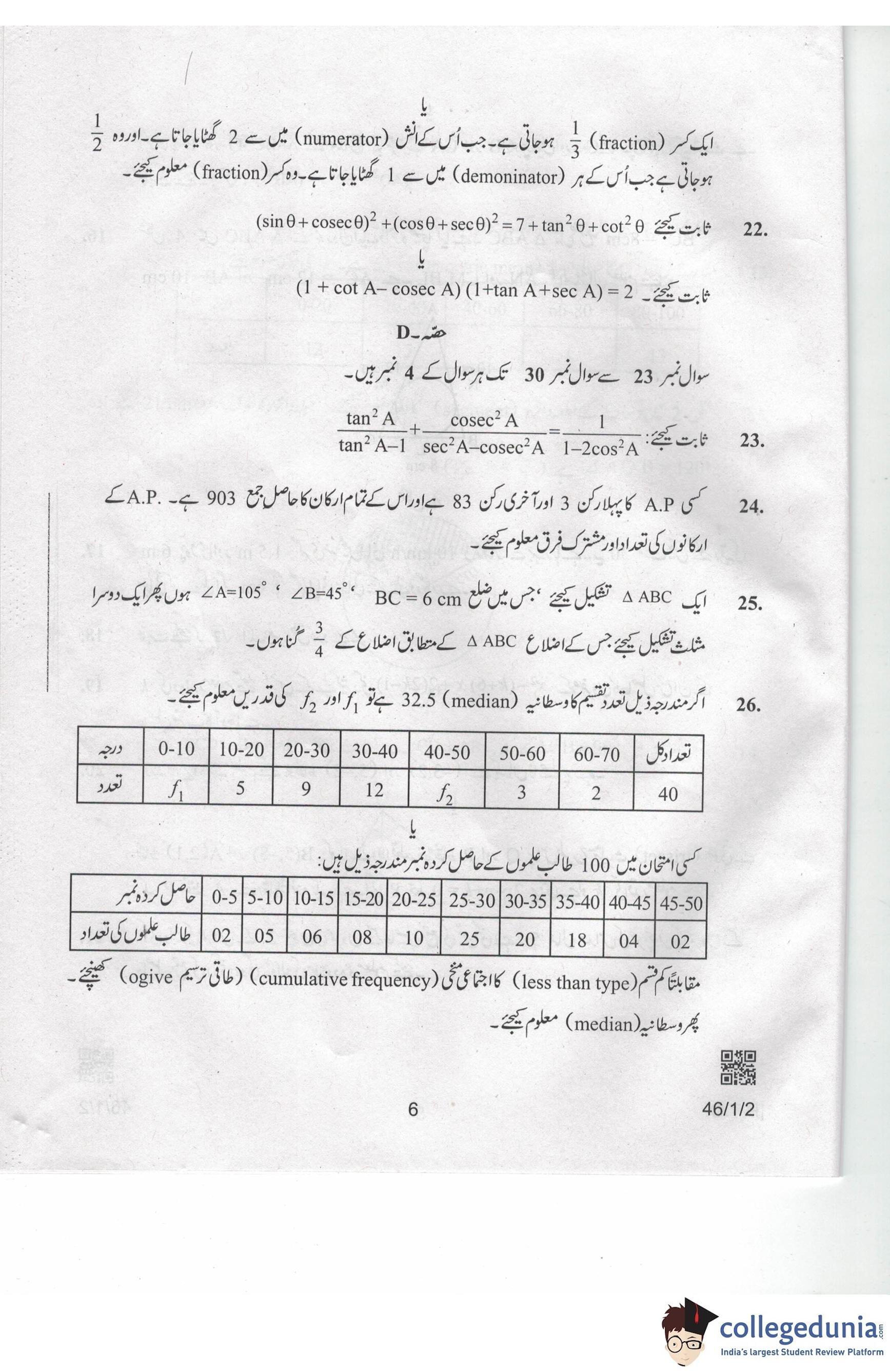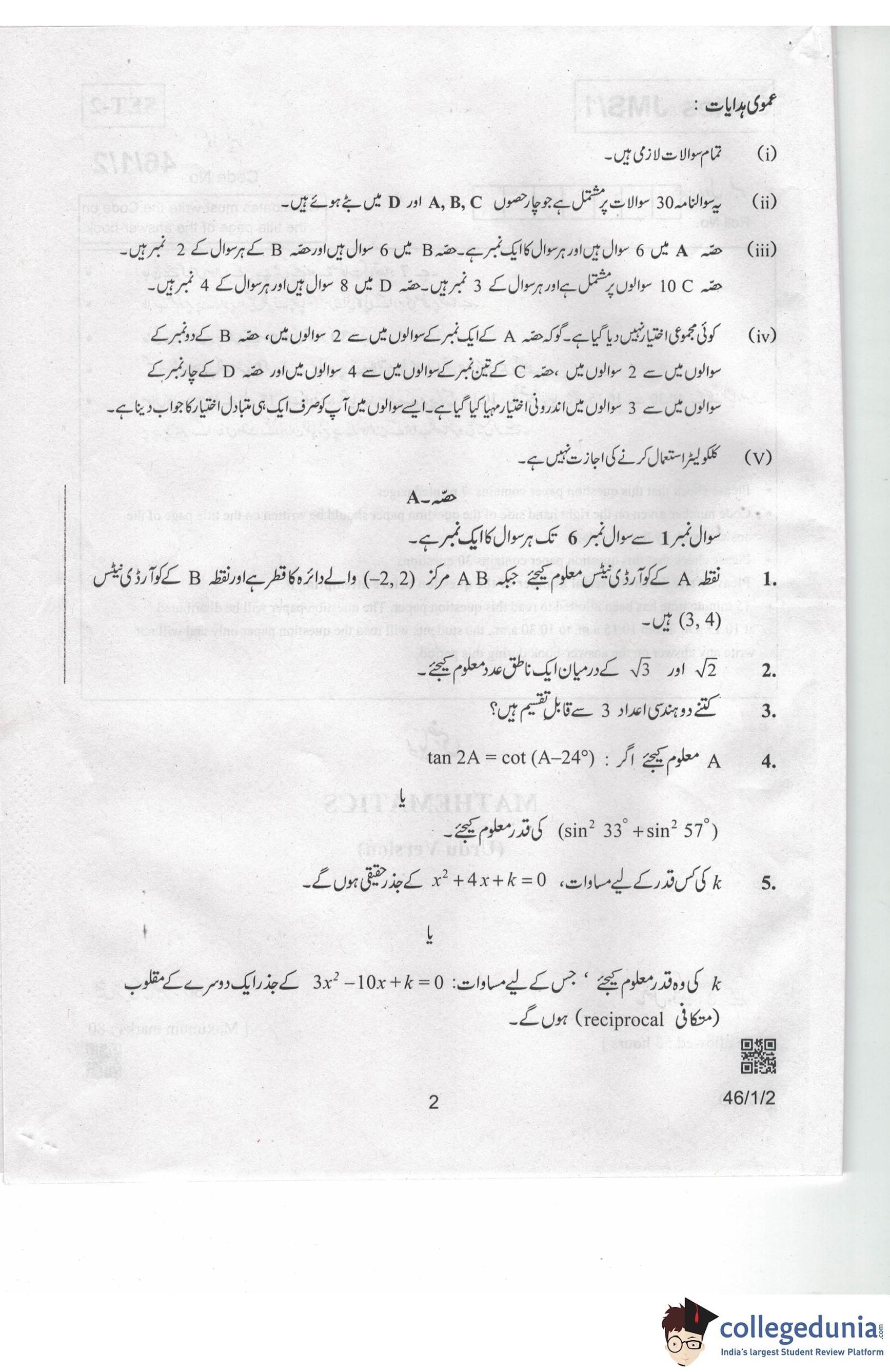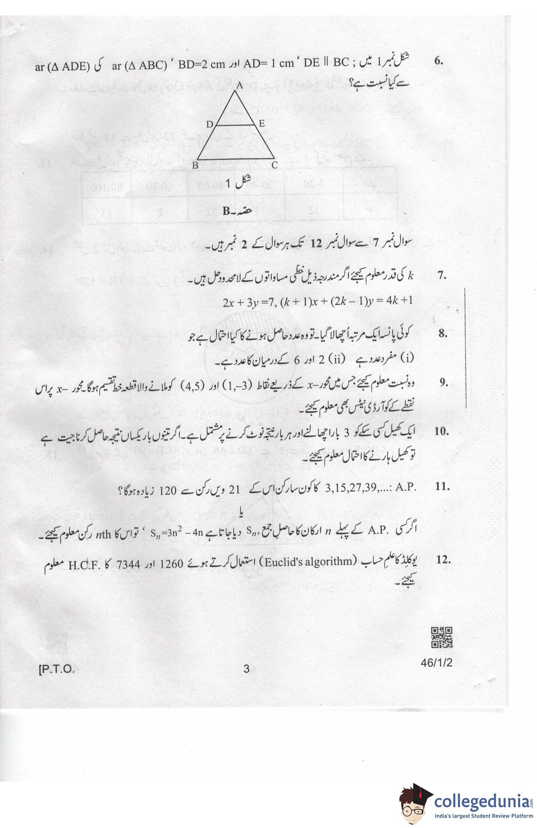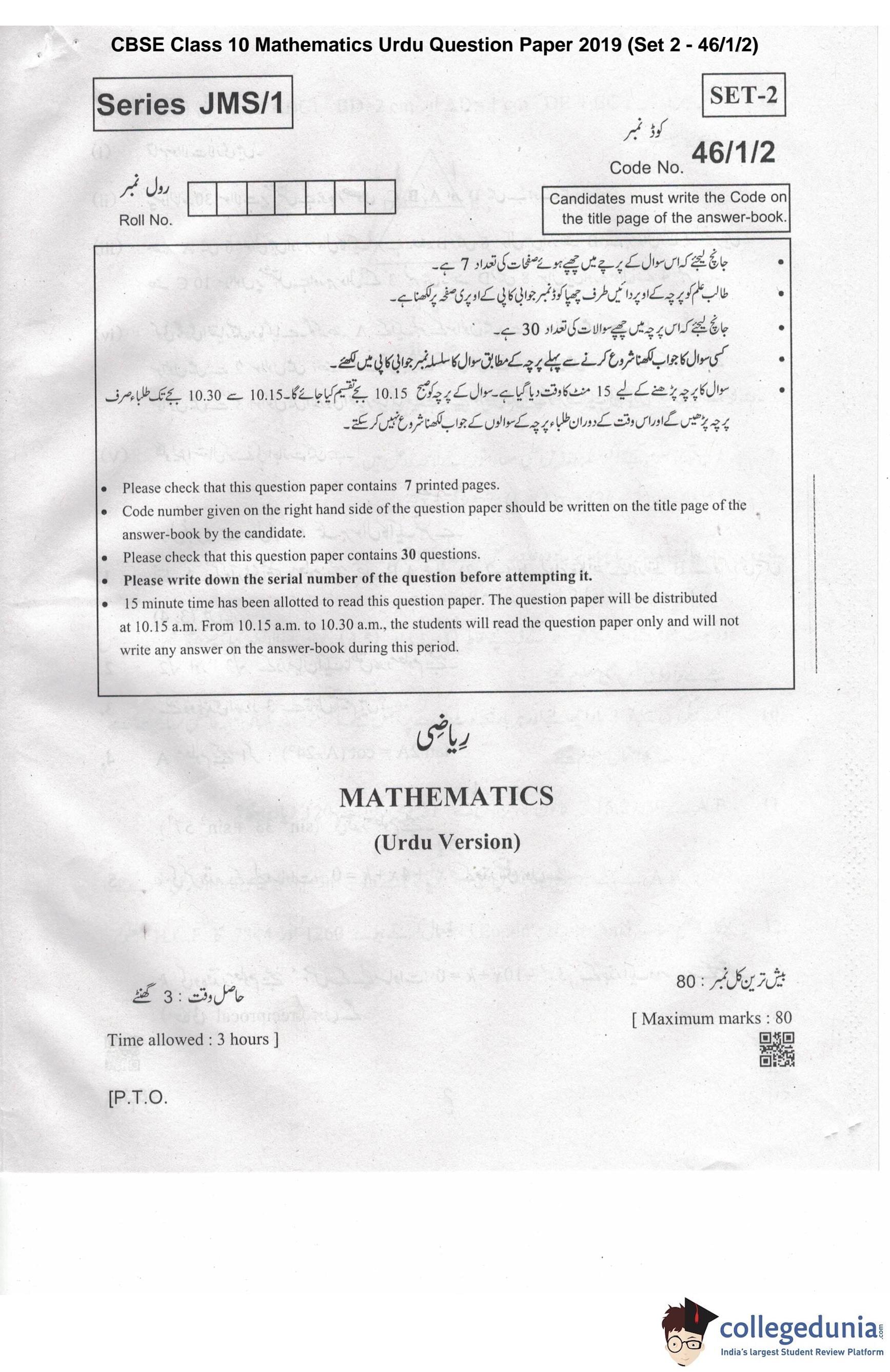 CBSE Class 10 Mathematics Urdu Question Paper 2019 with Answer Key Set 2 - 46/1/2 is available for download. The exam was conducted by the Central Board of Secondary Education on March 7, 2019 in the Morning Session 10:30 AM to 1:30 PM. The medium of paper was Urdu. The question paper comprised a total of 30 questions divided among 4 sections.