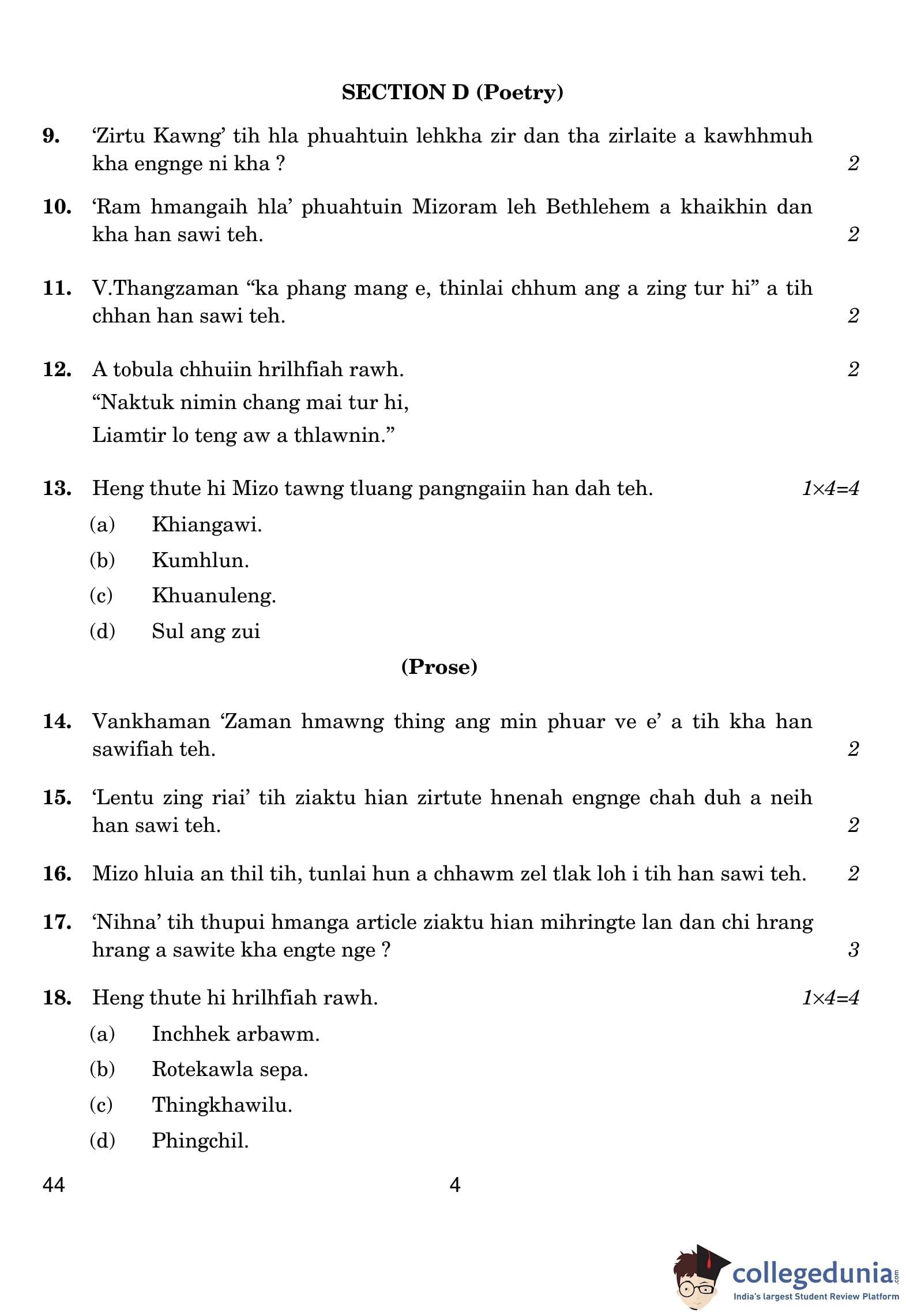 CBSE Class 10 Mizo Question Paper 2019 with Answer Key Set 4 is available for download. The exam was conducted by the Central Board of Secondary Education on March 5, 2019 in the Morning Session 10:30 AM to 1:30 PM. The medium of paper was Mizo. The question paper comprised a total of 18 questions divided among 4 sections.