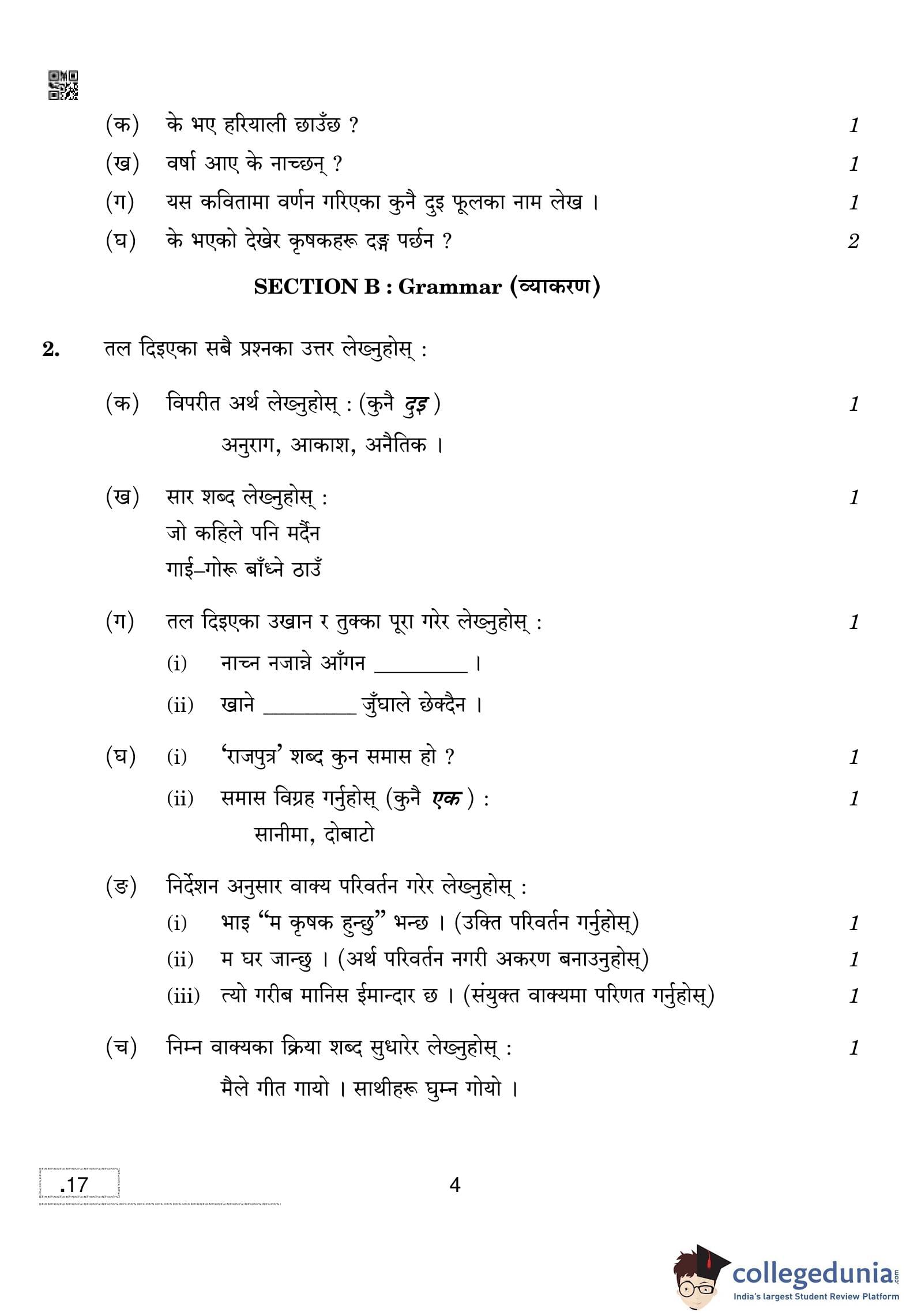 CBSE Class 10 Nepali Question Paper 2020 with Answer Key Set 4 is available for download. The exam was conducted by the Central Board of Secondary Education on February 24, 2020 in the Morning Session 10:30 AM to 1:30 PM. The medium of paper was Nepali. The question paper comprised a total of 9 questions divided among 4 sections.