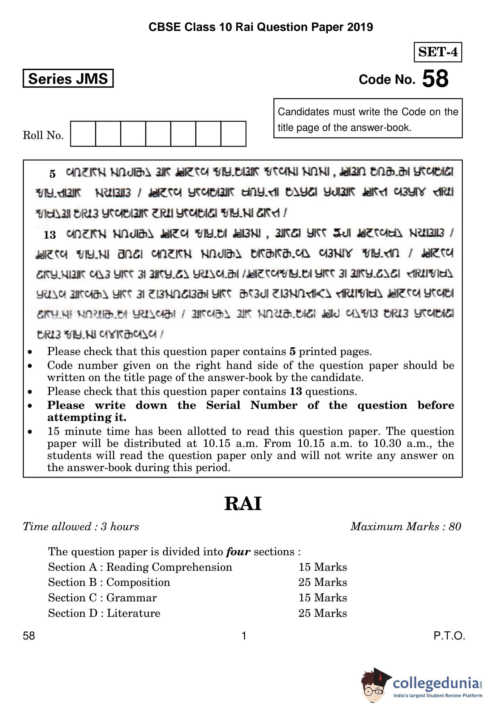CBSE Class 10 Rai Question Paper 2019 with Answer Key Set 4 is available for download. The exam was conducted by the Central Board of Secondary Education on March 5, 2019 in the Morning Session 10:30 AM to 1:30 PM. The medium of paper was Rai. The question paper comprised a total of 13 questions divided among 4 sections.