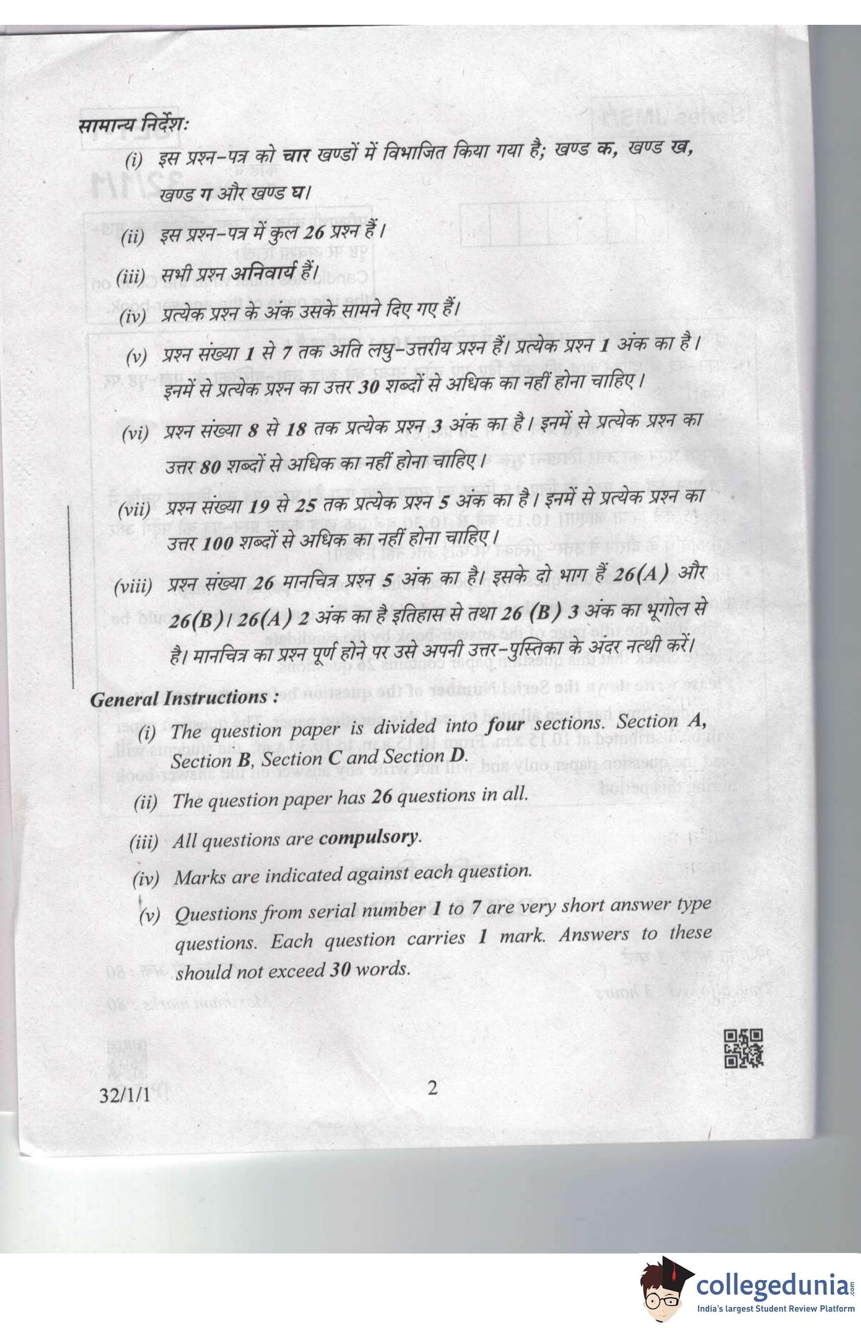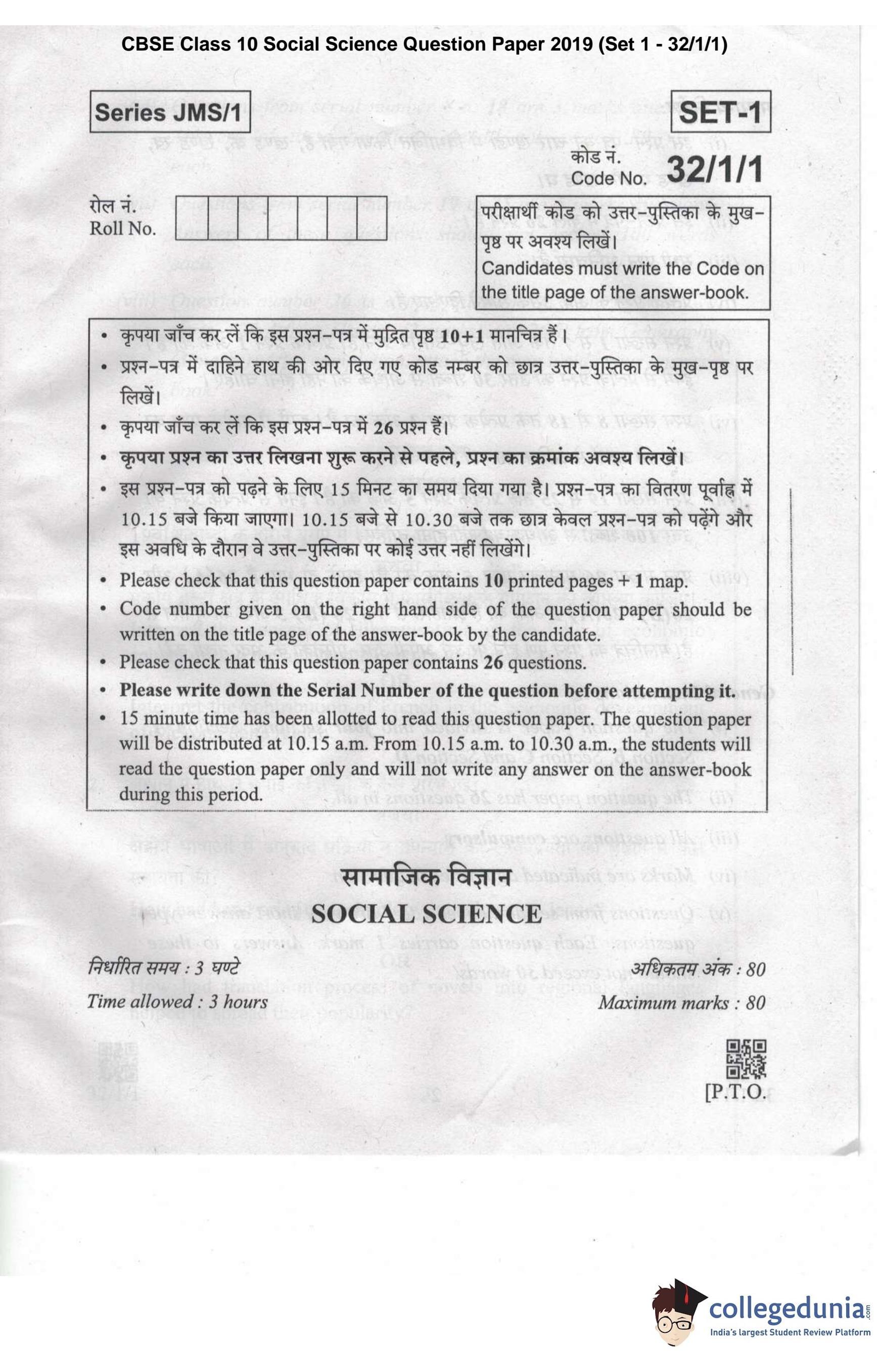 CBSE Class 10 Social Science Question Paper 2019 with Answer Key Set 1 - 32/1/1 is available for download. The exam was conducted by the Central Board of Secondary Education on March 29, 2019 in the Morning Session 10:30 AM to 1:30 PM. The medium of paper was English and Hindi. The question paper comprised a total of 26 questions divided among 4 sections.