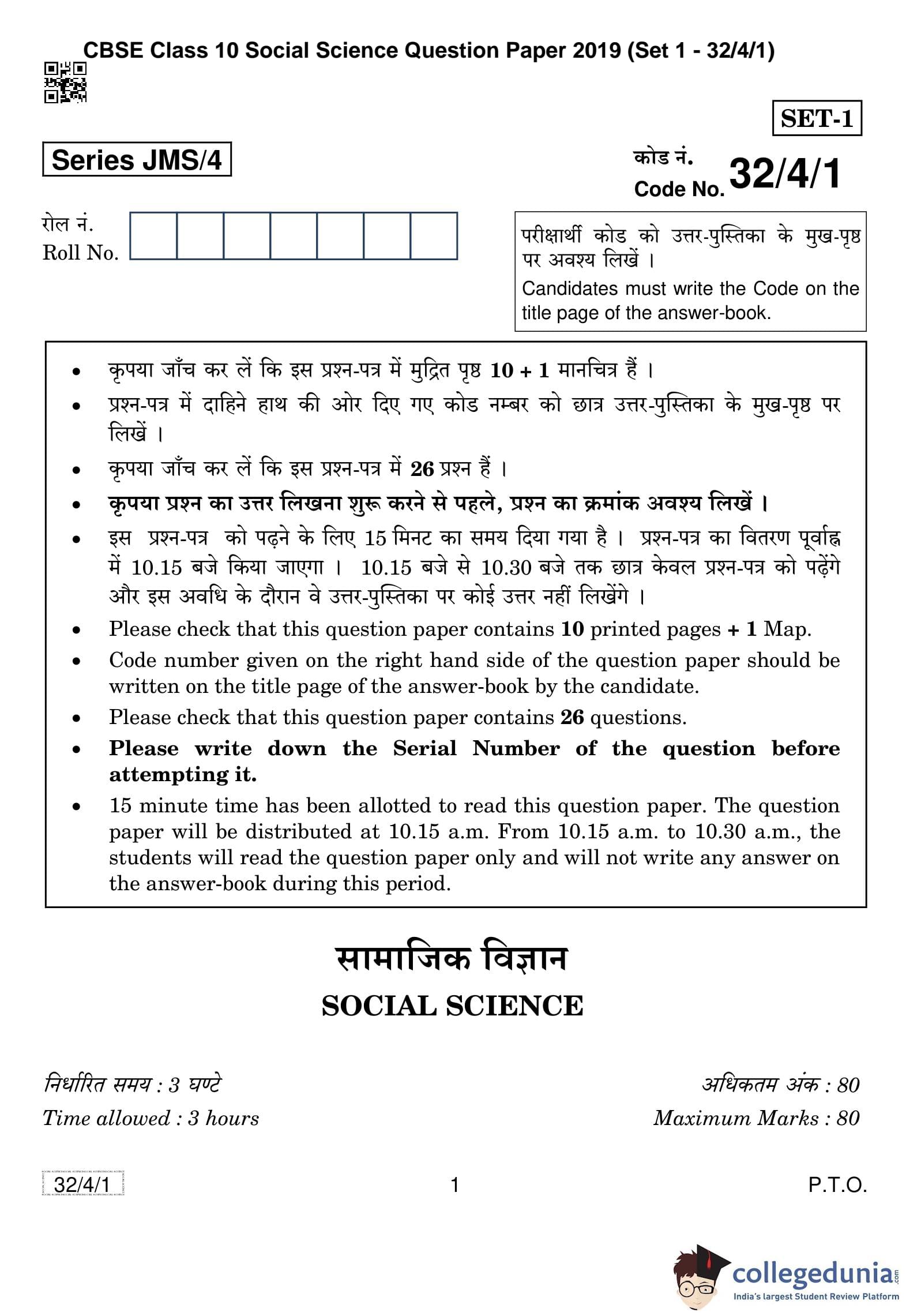 CBSE Class 10 Social Science Question Paper 2019 with Answer Key Set 1 - 32/4/1 is available for download. The exam was conducted by the Central Board of Secondary Education on March 29, 2019 in the Morning Session 10:30 AM to 1:30 PM. The medium of paper was English and Hindi. The question paper comprised a total of 26 questions divided among 4 sections.