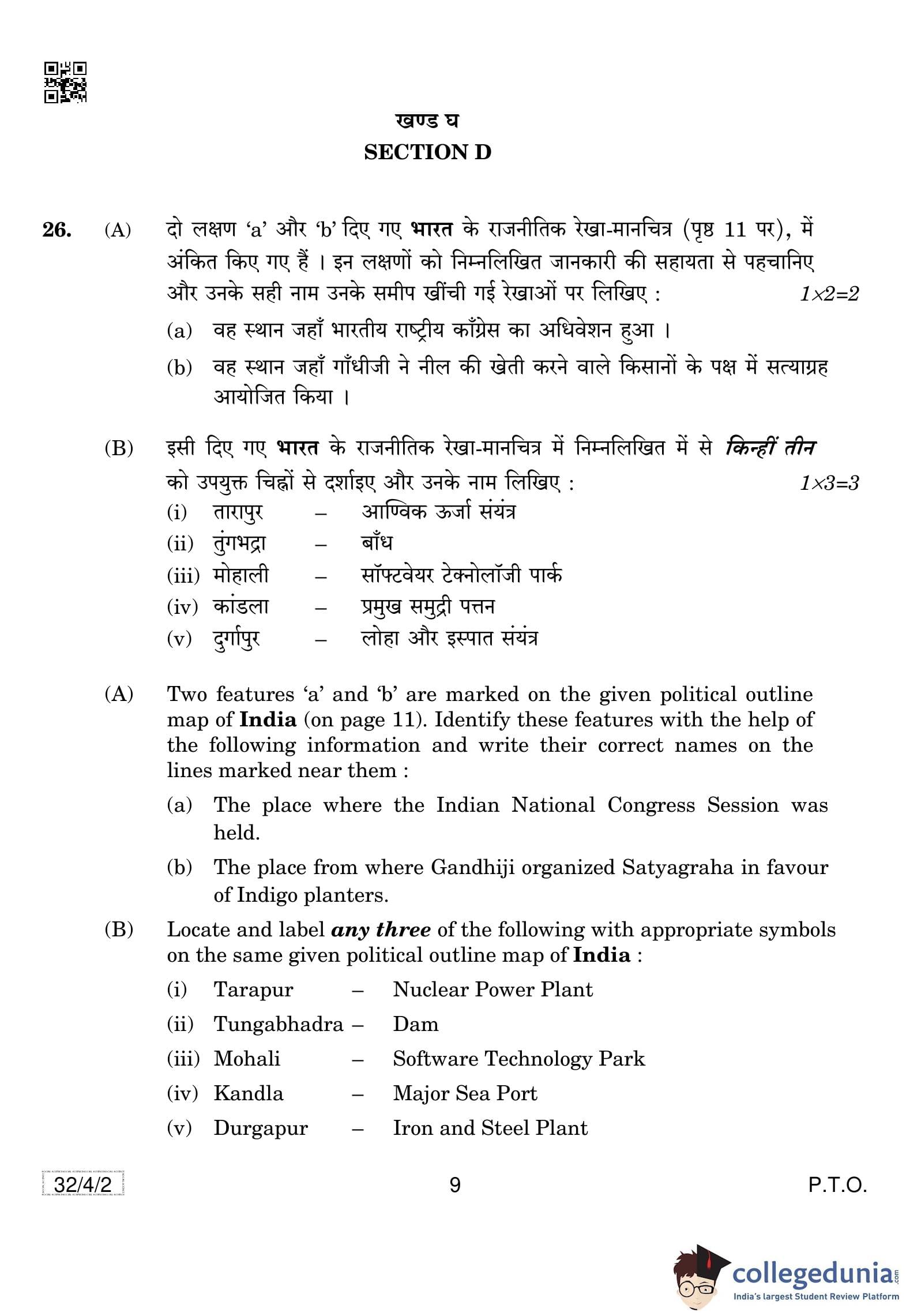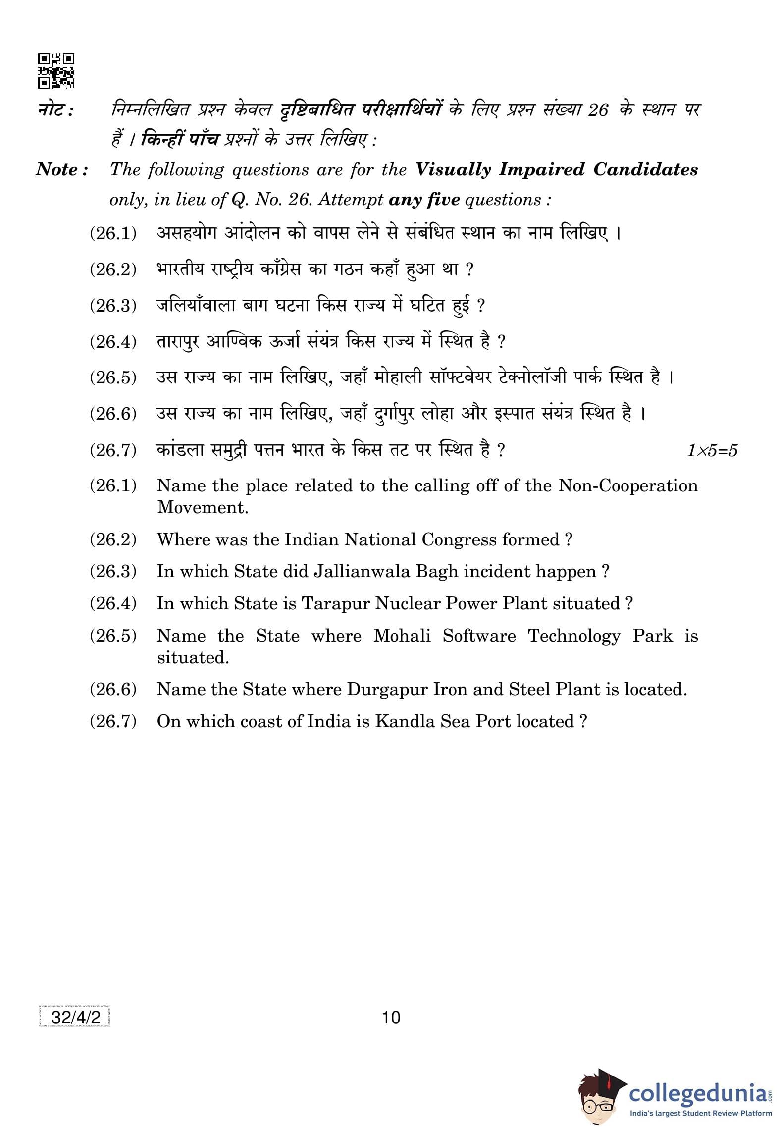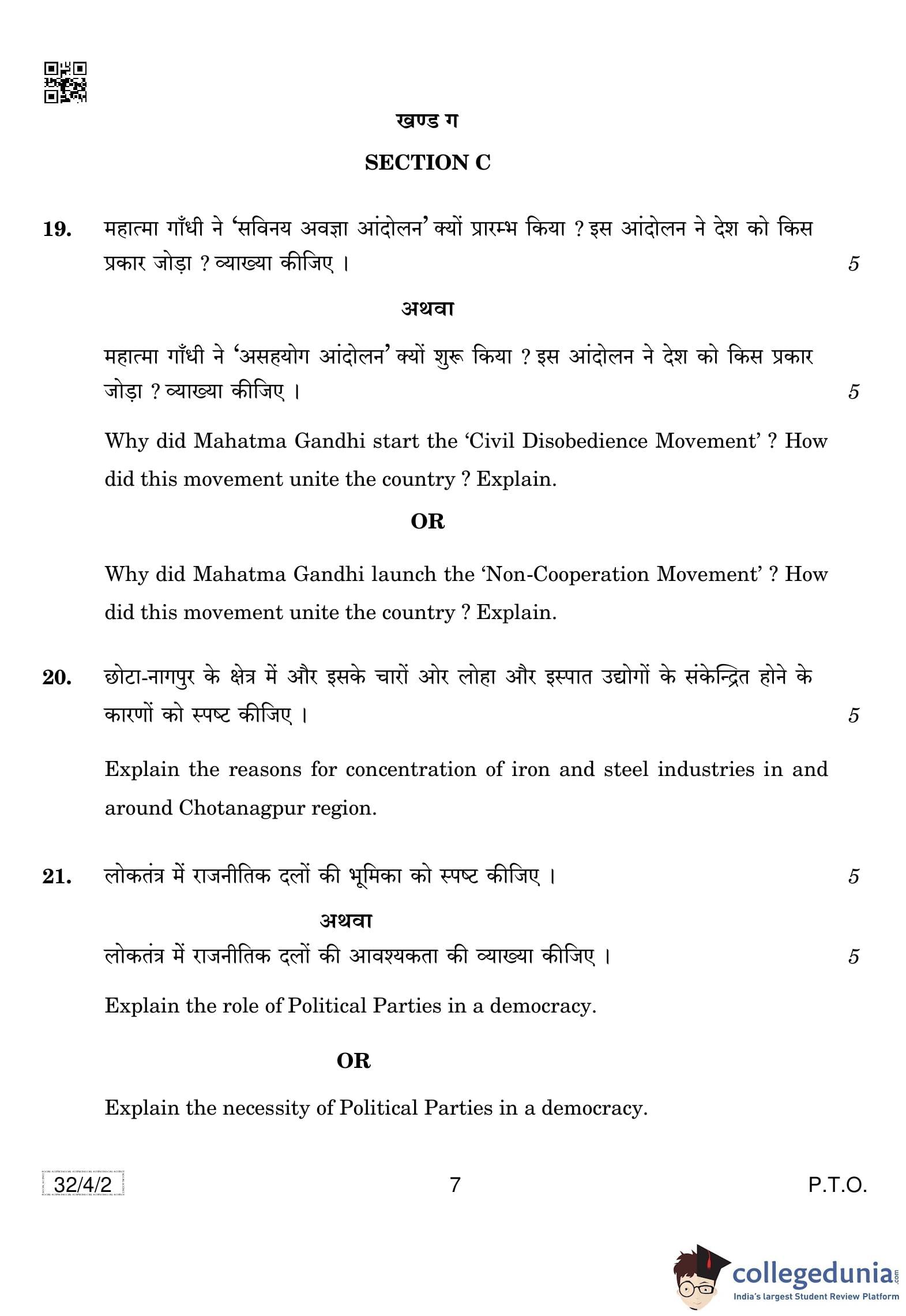 CBSE Class 10 Social Science Question Paper 2019 with Answer Key Set 2 - 32/4/2 is available for download. The exam was conducted by the Central Board of Secondary Education on March 29, 2019 in the Morning Session 10:30 AM to 1:30 PM. The medium of paper was English and Hindi. The question paper comprised a total of 26 questions divided among 4 sections.
