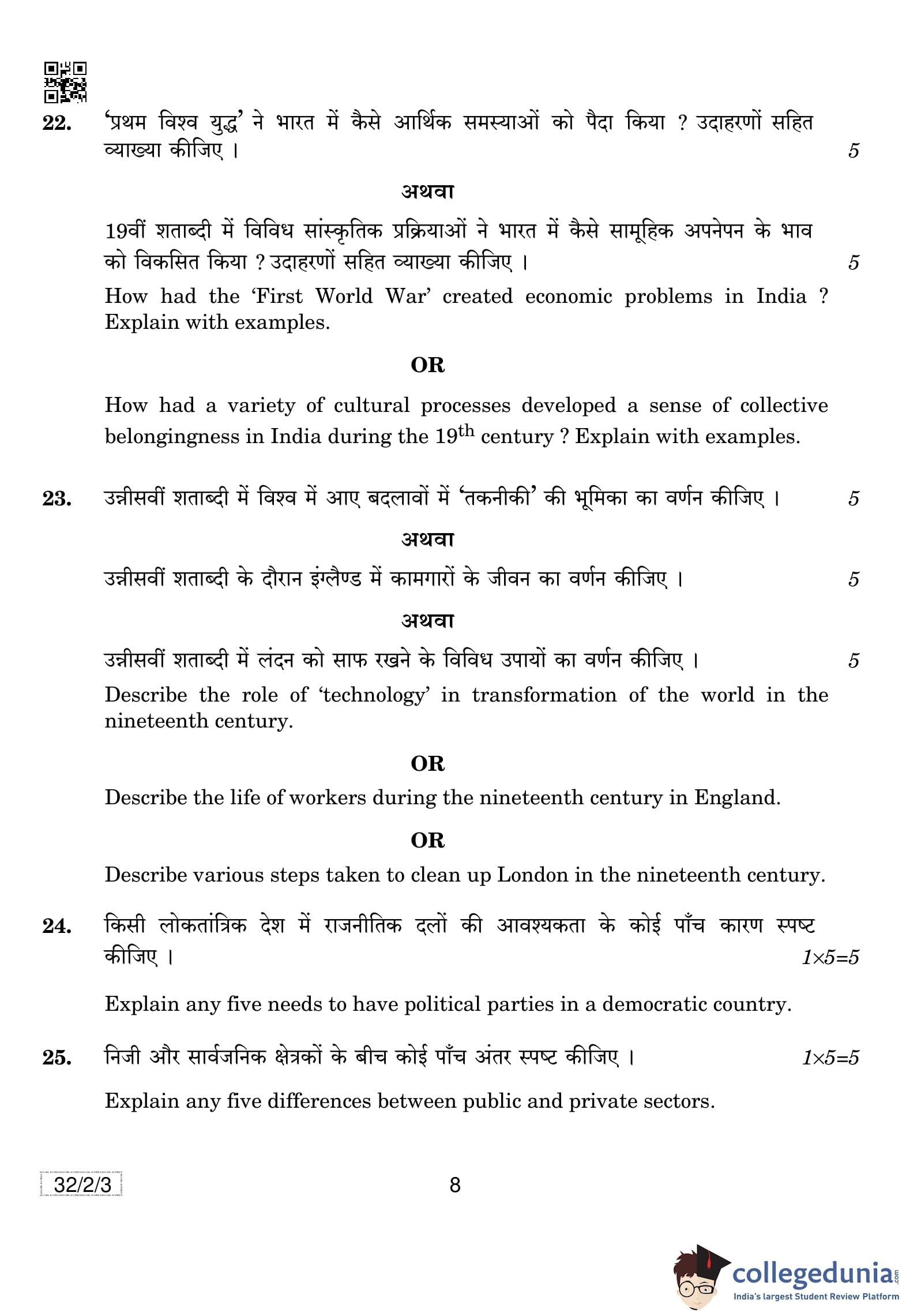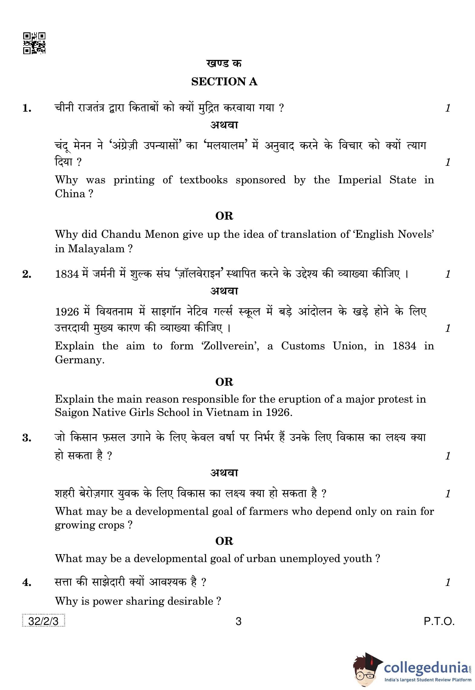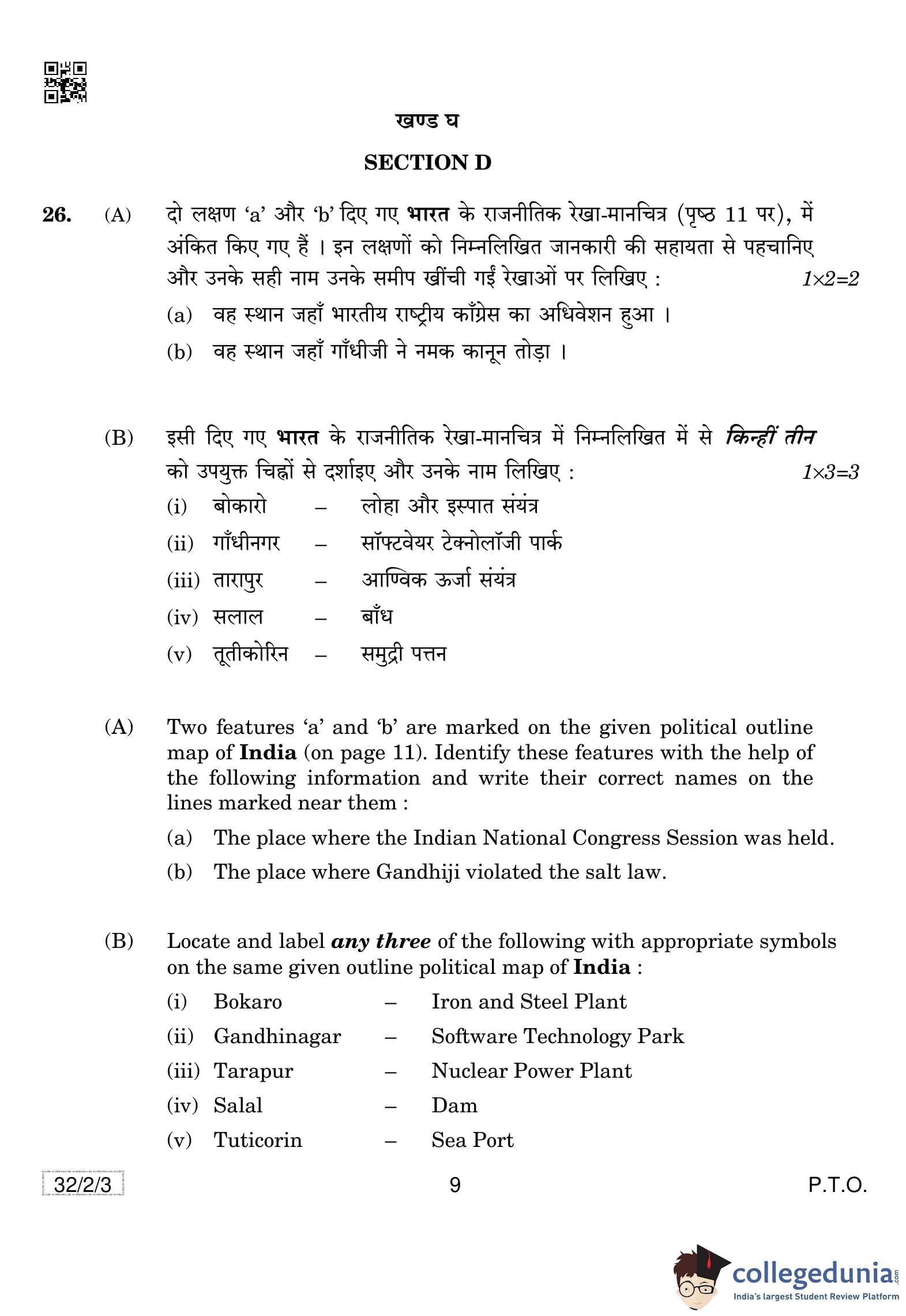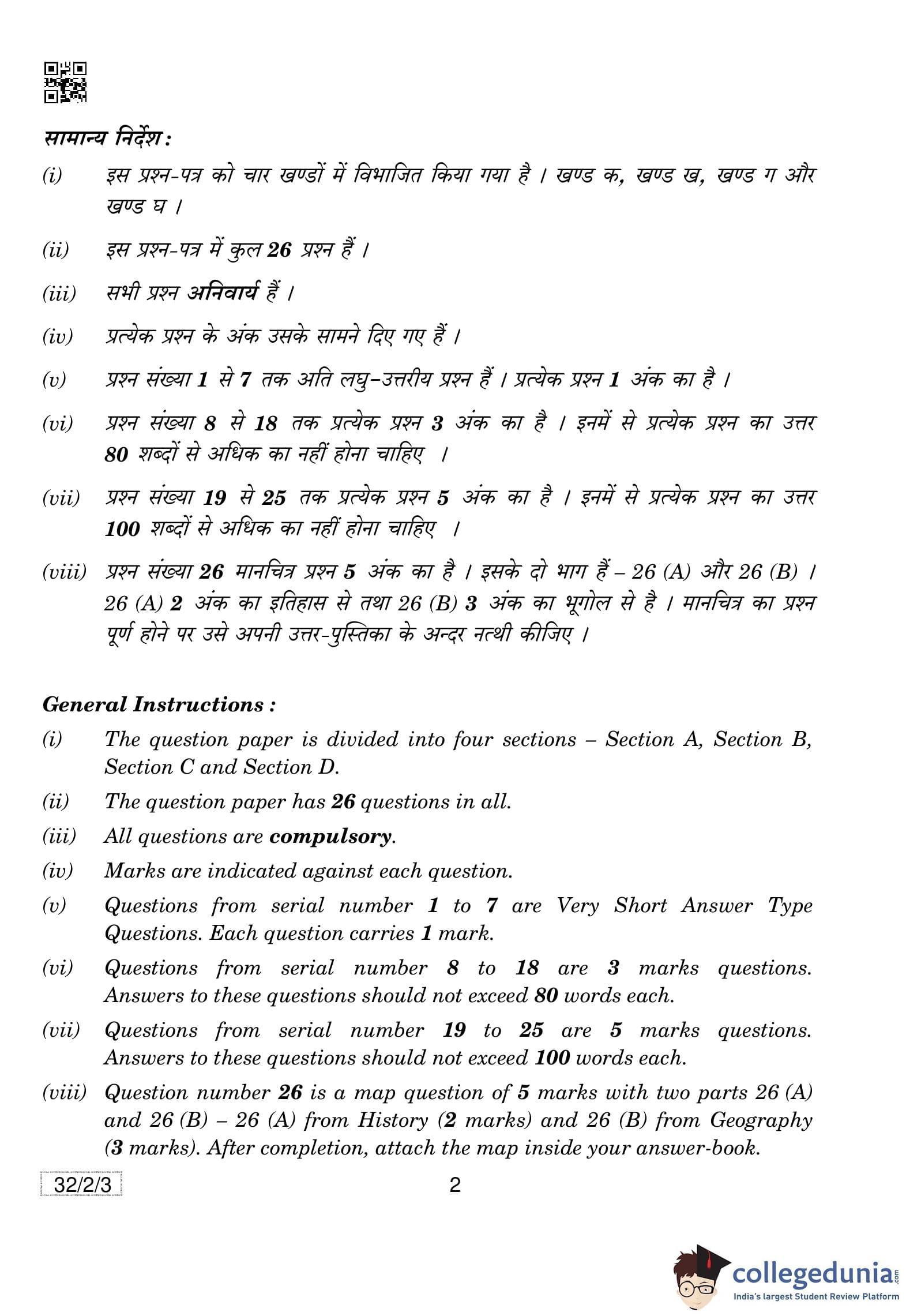 CBSE Class 10 Social Science Question Paper 2019 with Answer Key Set 3 - 32/2/3 is available for download. The exam was conducted by the Central Board of Secondary Education on March 29, 2019 in the Morning Session 10:30 AM to 1:30 PM. The medium of paper was English and Hindi. The question paper comprised a total of 26 questions divided among 4 sections.