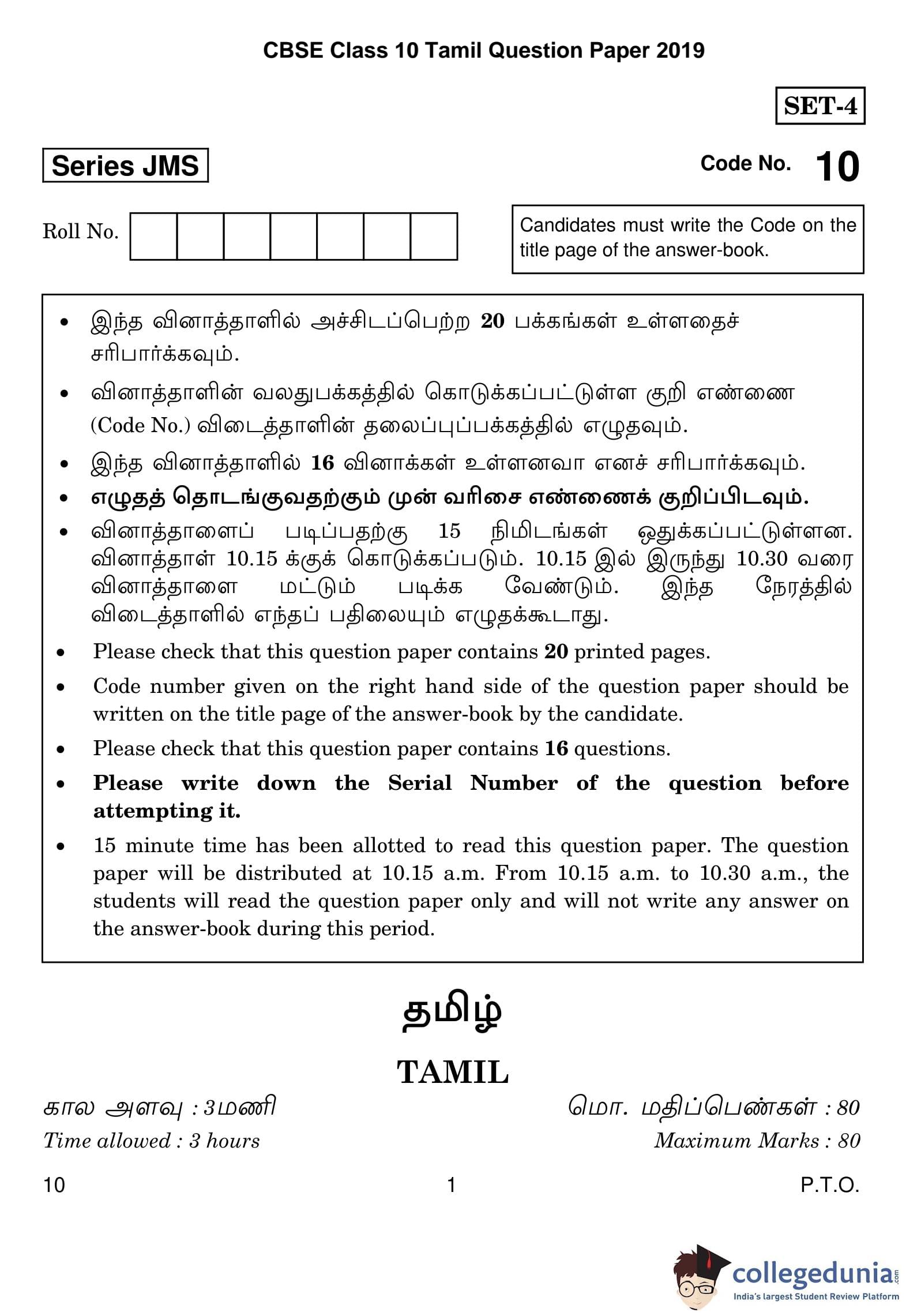 CBSE Class 10 Tamil Question Paper 2019 with Answer Key Set 4 is available for download. The exam was conducted by the Central Board of Secondary Education on March 5, 2019 in the Morning Session 10:30 AM to 1:30 PM. The medium of paper was Tamil. The question paper comprised a total of 16 questions divided among 4 sections.