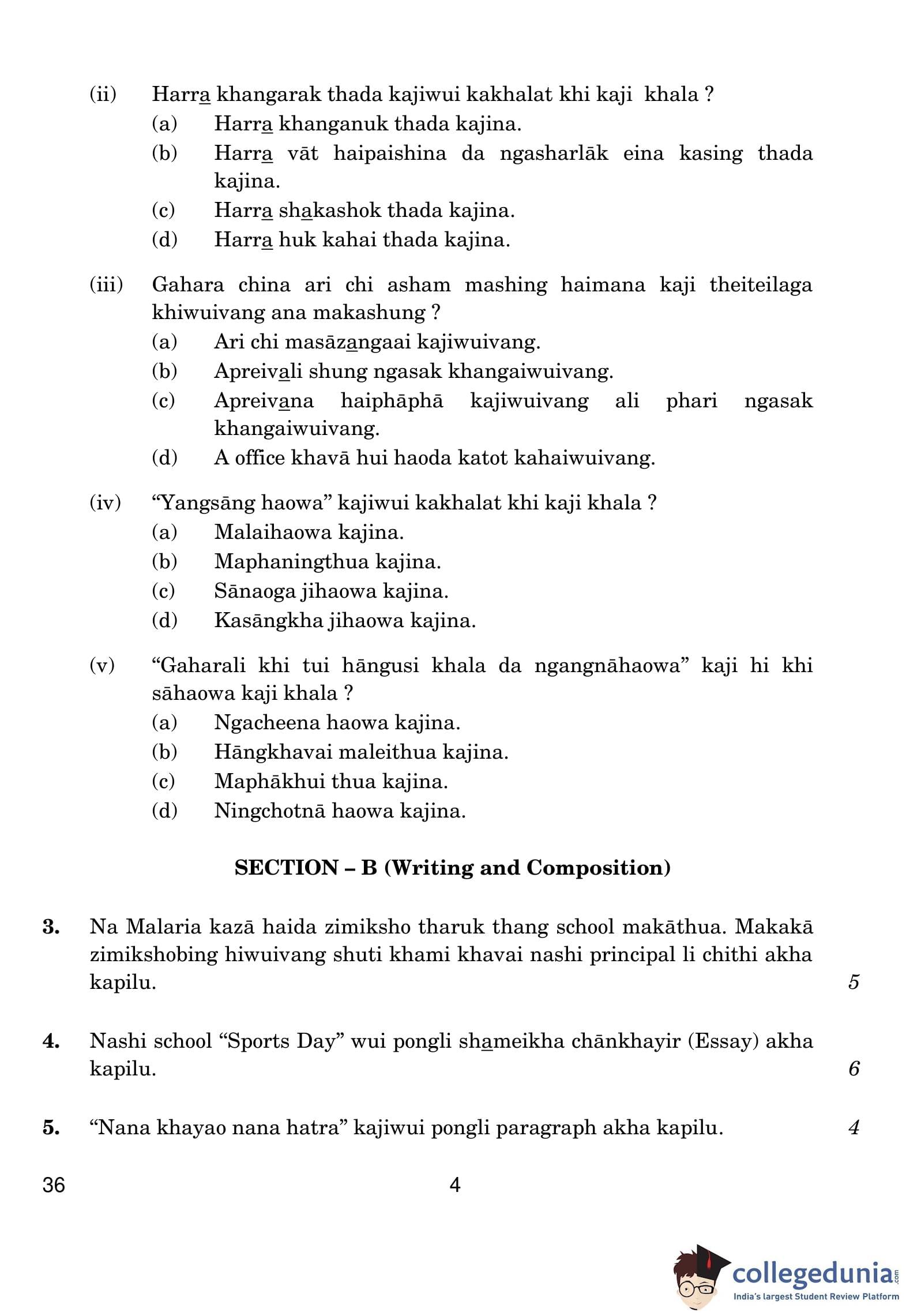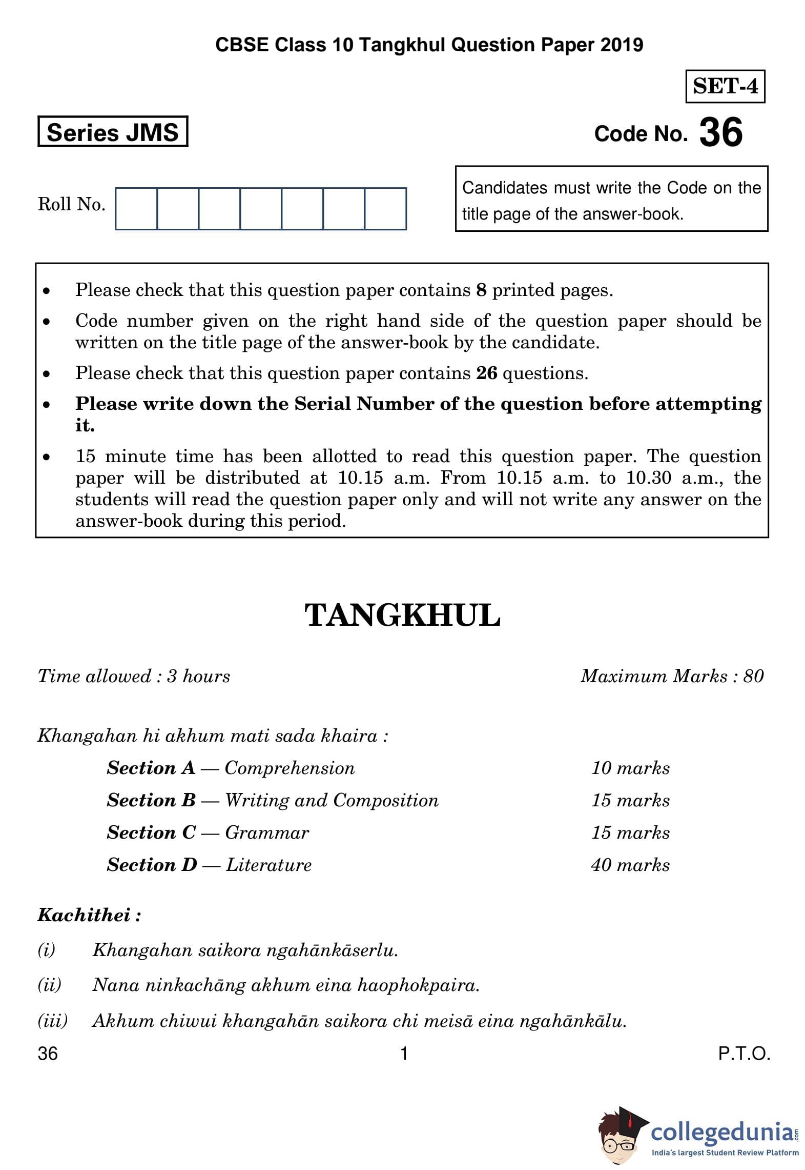 CBSE Class 10 Tangkhul Question Paper 2019 with Answer Key Set 4 is available for download. The exam was conducted by the Central Board of Secondary Education on March 5, 2019 in the Morning Session 10:30 AM to 1:30 PM. The medium of paper was Tangkhul. The question paper comprised a total of 26 questions divided among 4 sections.