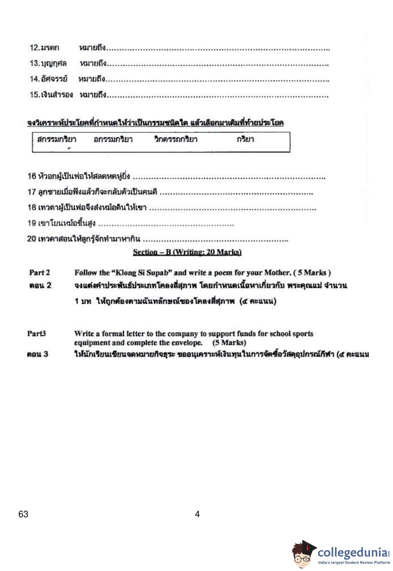 CBSE Class 10 Thai Question Paper 2019 with Answer Key Set 4 is available for download. The exam was conducted by the Central Board of Secondary Education on March 5, 2019 in the Morning Session 10:30 AM to 1:30 PM. The medium of paper was Thai. The question paper comprised a total of 9 questions divided among 4 sections.