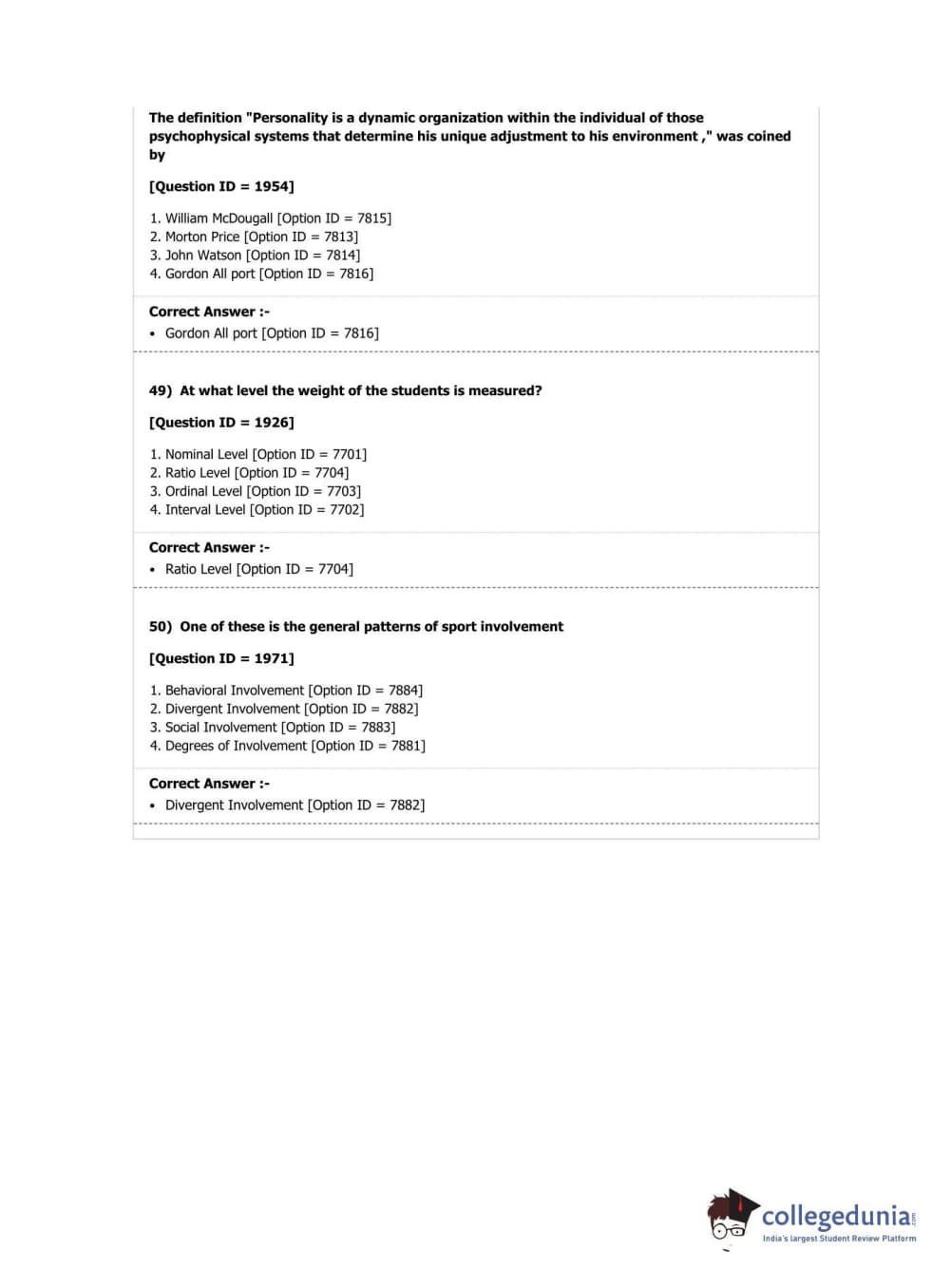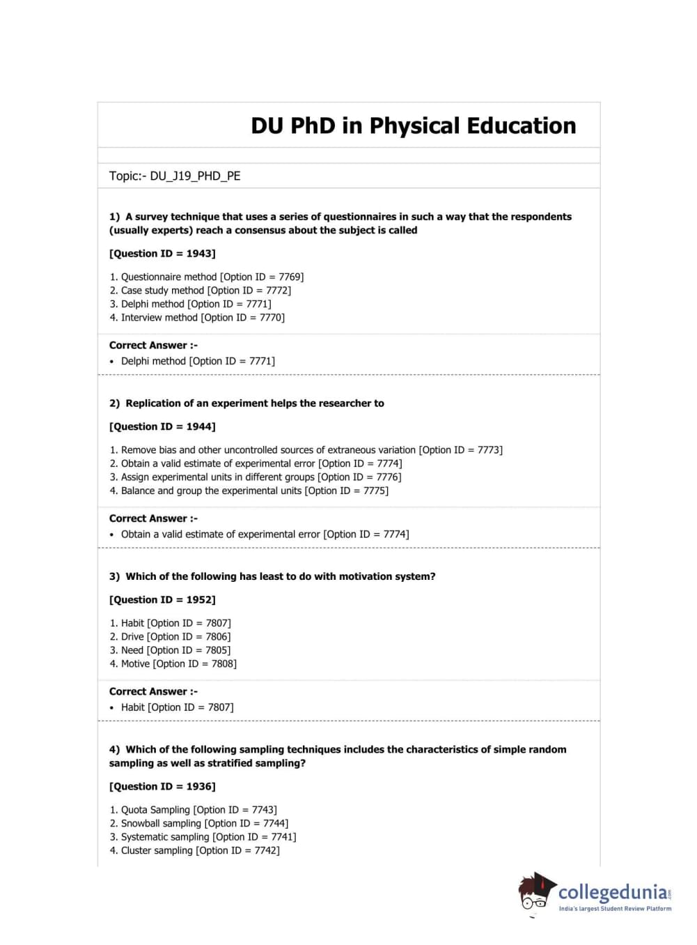 DUET 2018 Ph.D. in Physical Education (Department of Physical Education & Sports Sciences) Question paper with answer key pdf conducted on June 17, 2018 in Shift 2 is available for download. The exam was successfully organized by University of Delhi. The question paper comprised a total of 50 questions.