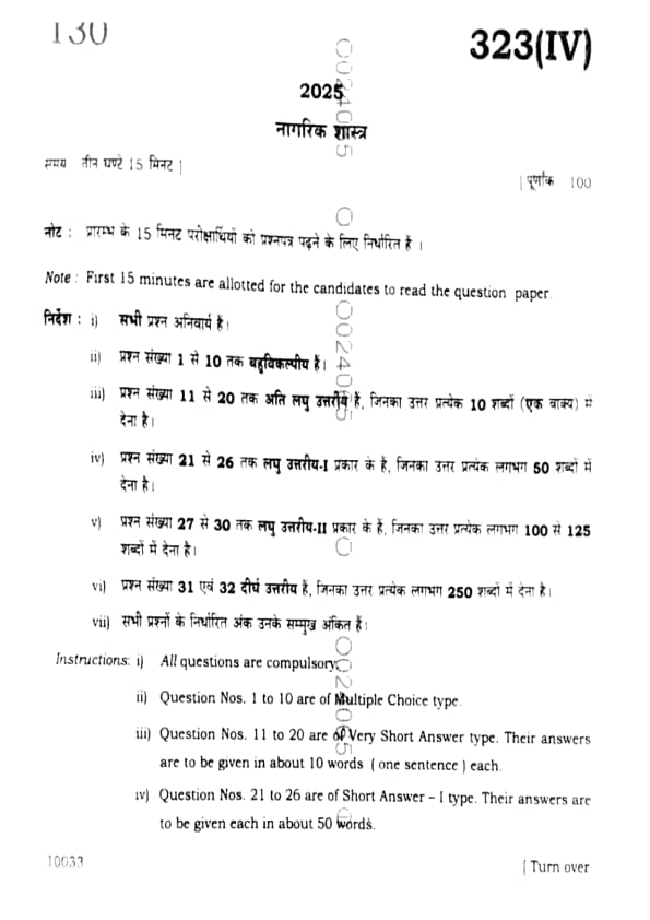 UP Board Class 12 Civics Question Paper 2025 PDF (Code 323 IV) is available for download here. The Mathematics exam was conducted on March 1, 2025 in the Evening Shift from 2:00 PM to 5:15 PM. The total marks for the theory paper are 100. Students reported the paper to be easy to moderate.