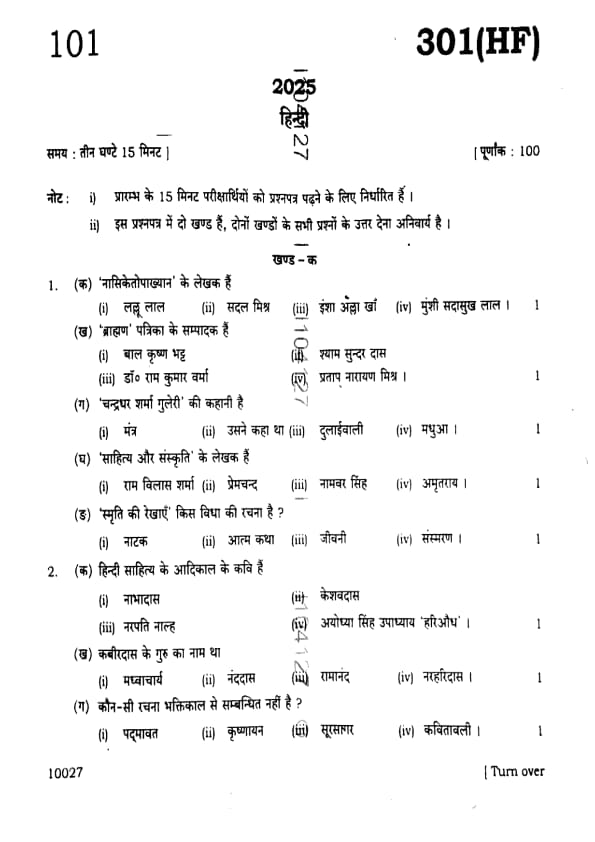 UP Board Class 12 Hindi Question Paper 2025 (Code 301 HF) with Solutions