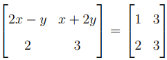 Equating the elements of the matrices: \[ 2x - y = 1 \quad and \quad x + 2y = 3. \]