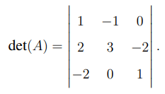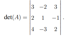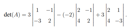 Substitute these values: \[ det(A) = 3(-1) - (-2)(8) + 3(-10) = -3 + 16 - 30 = -17. \]