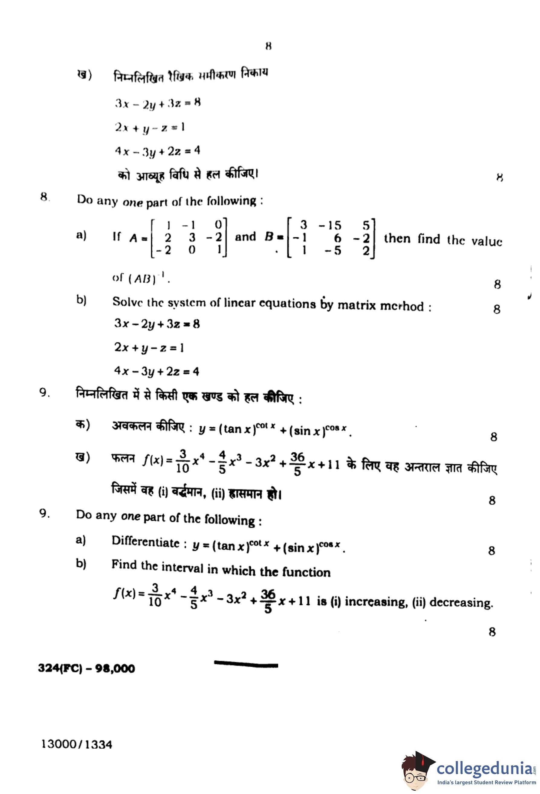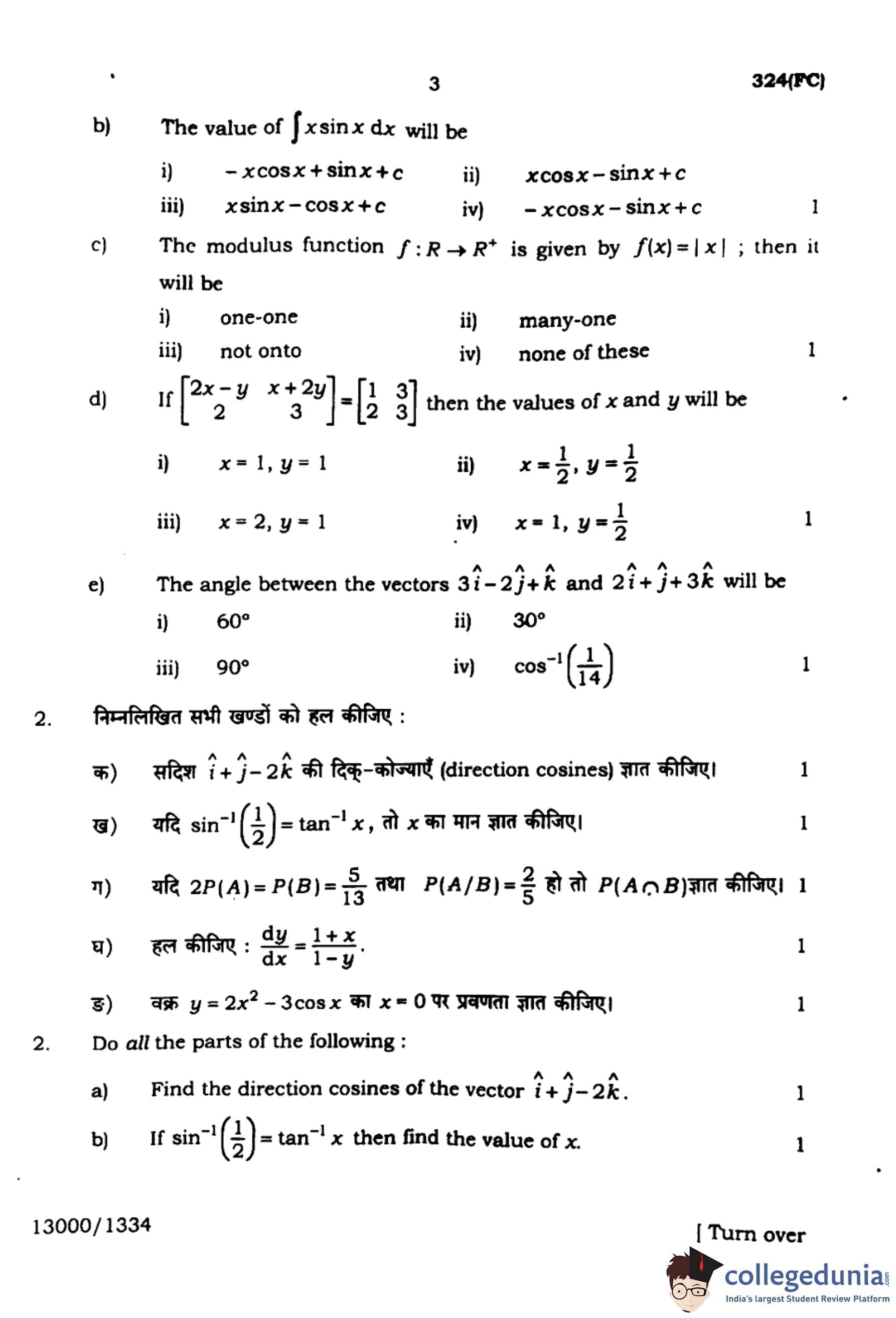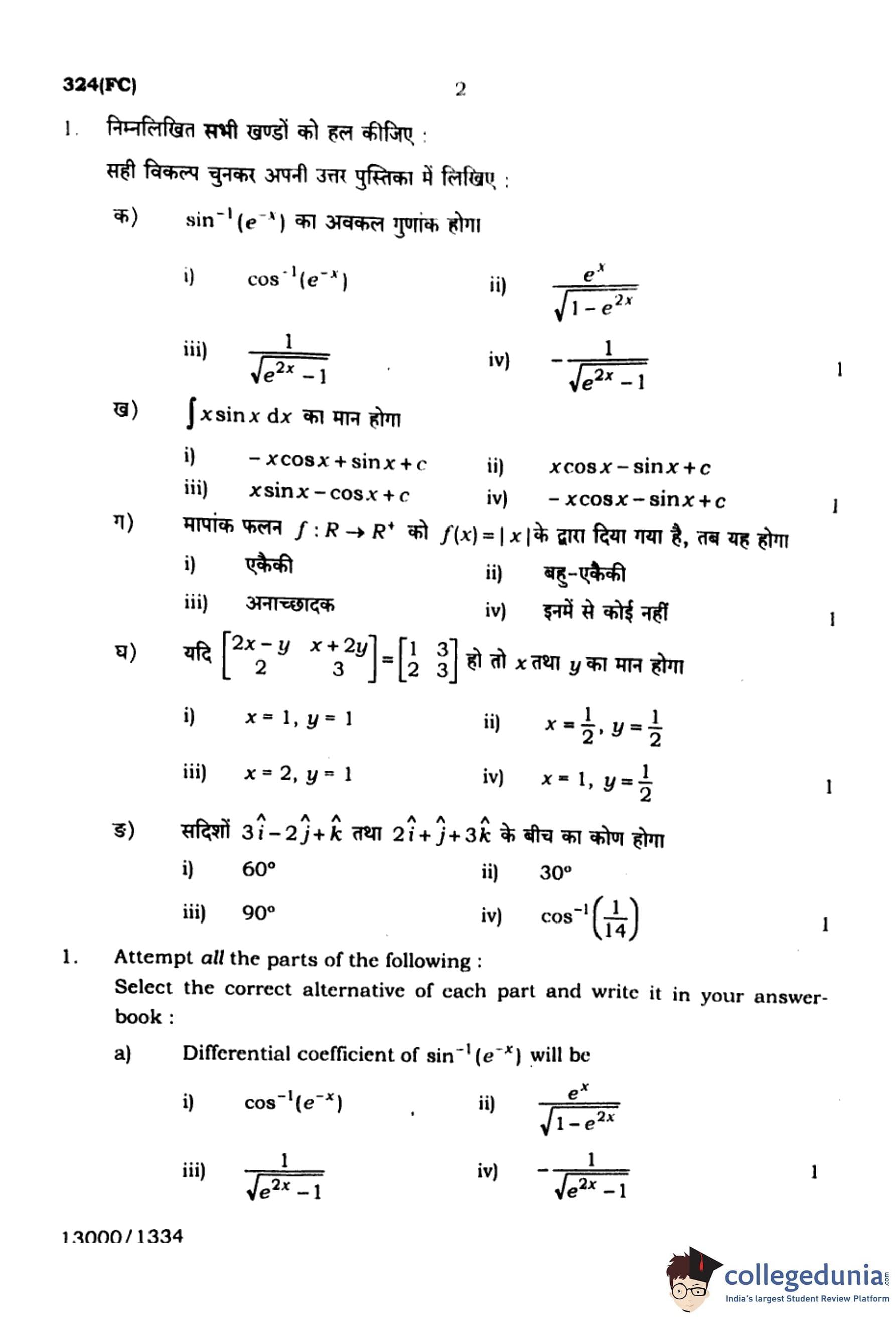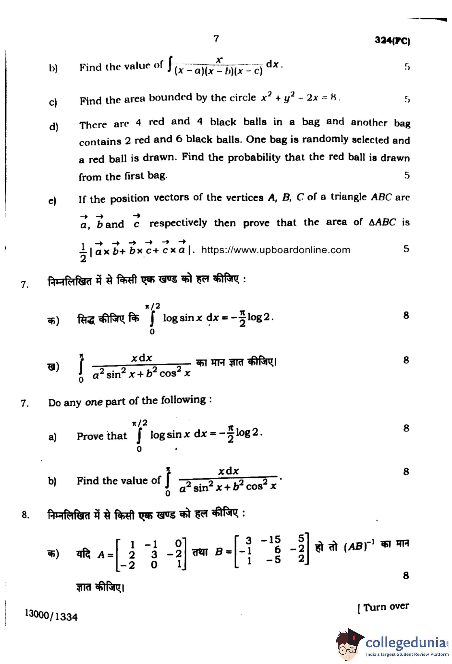 UP Board Class 12 Mathematics Question Paper 2024 (Code 324 FC) with Solutions