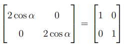 Equating elements: \[ 2\cos\alpha = 1 \quad \Rightarrow \quad \cos\alpha = \frac{1}{2}. \]