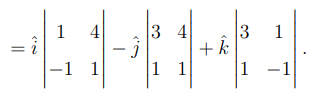\[ = \hat{i} (1 \times 1 - (-1) \times 4) - \hat{j} (3 \times 1 - 4 \times 1) + \hat{k} (3 \times (-1) - 1 \times 1). \] \[ = \hat{i} (1 + 4) - \hat{j} (3 - 4) + \hat{k} (-3 -1). \] \[ = 5\hat{i} + \hat{j} - 4\hat{k}. \] \[ |\vec{a} \times \vec{b}| = \sqrt{(5)^2 + (1)^2 + (-4)^2} = \sqrt{25 + 1 + 16} = \sqrt{42}. \] Quick Tip: The magnitude of the cross product of two vectors gives the area of the parallelogram they form.