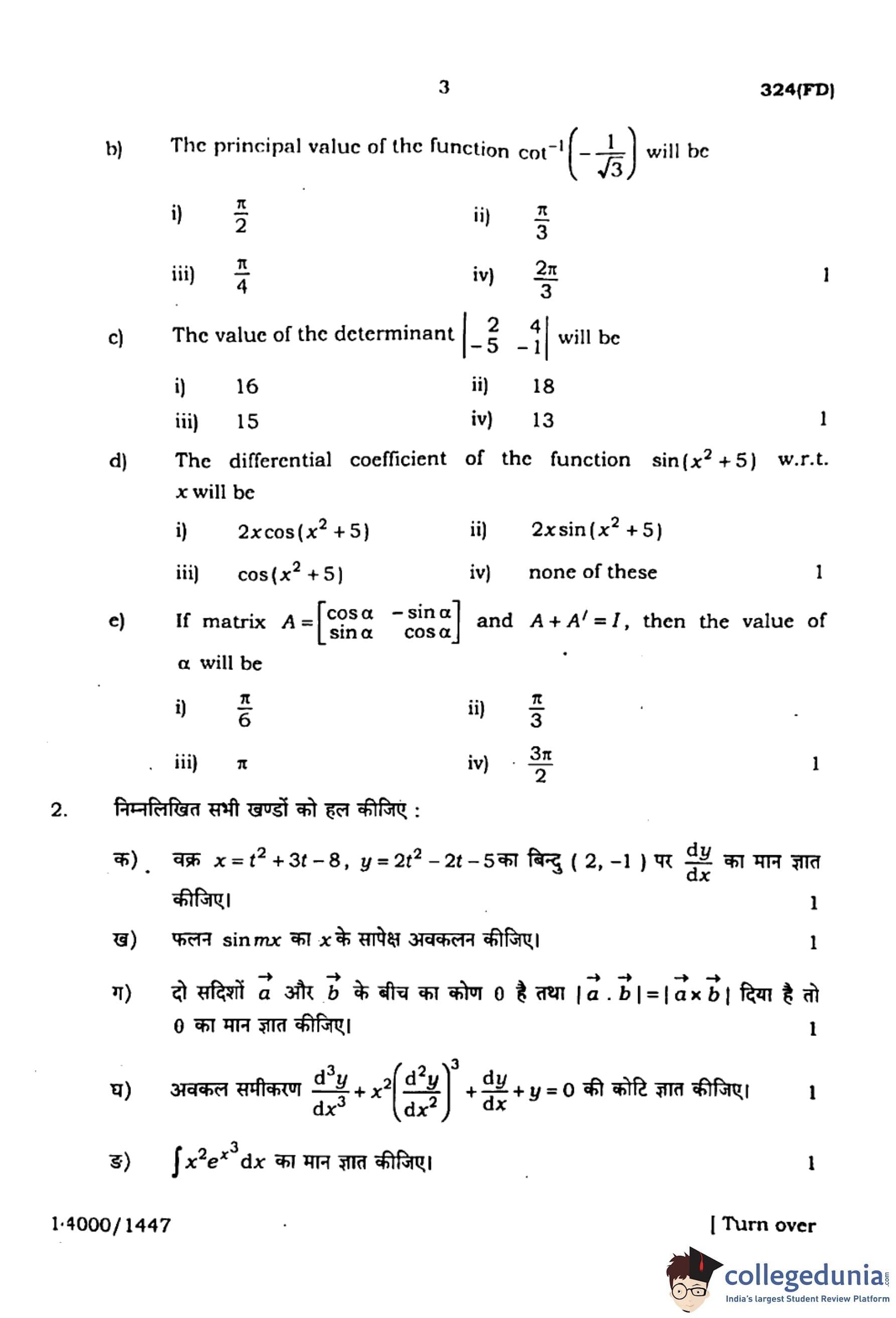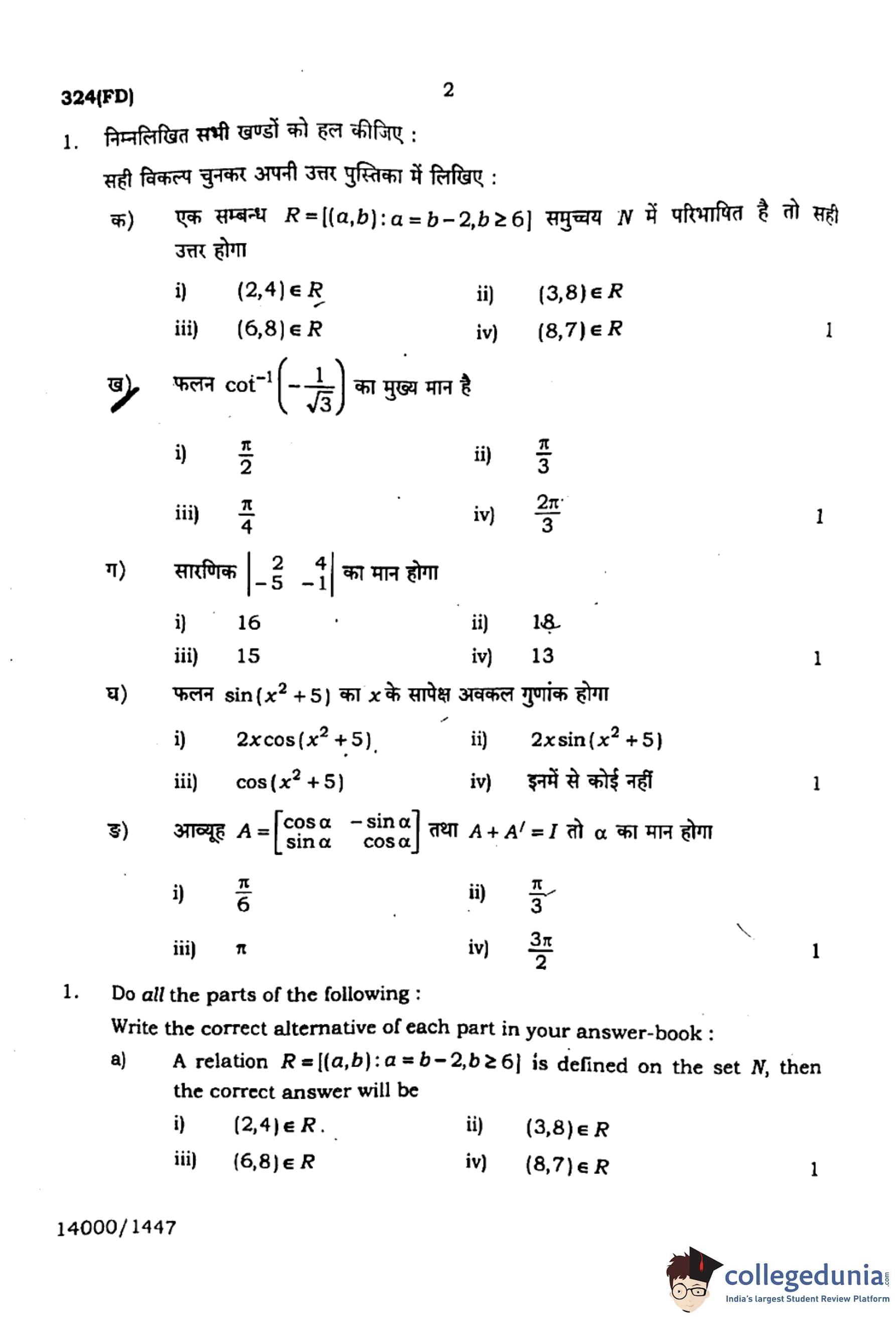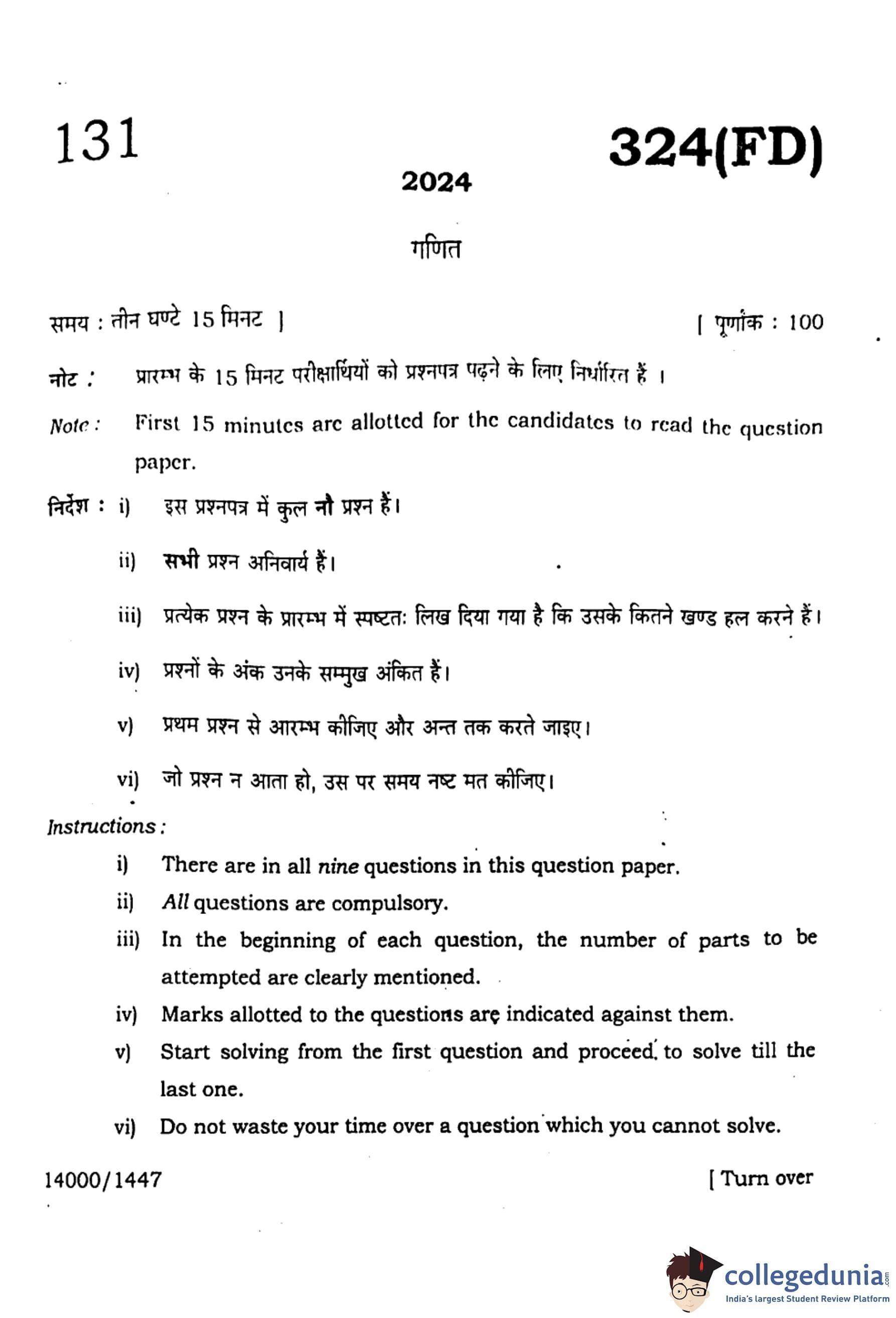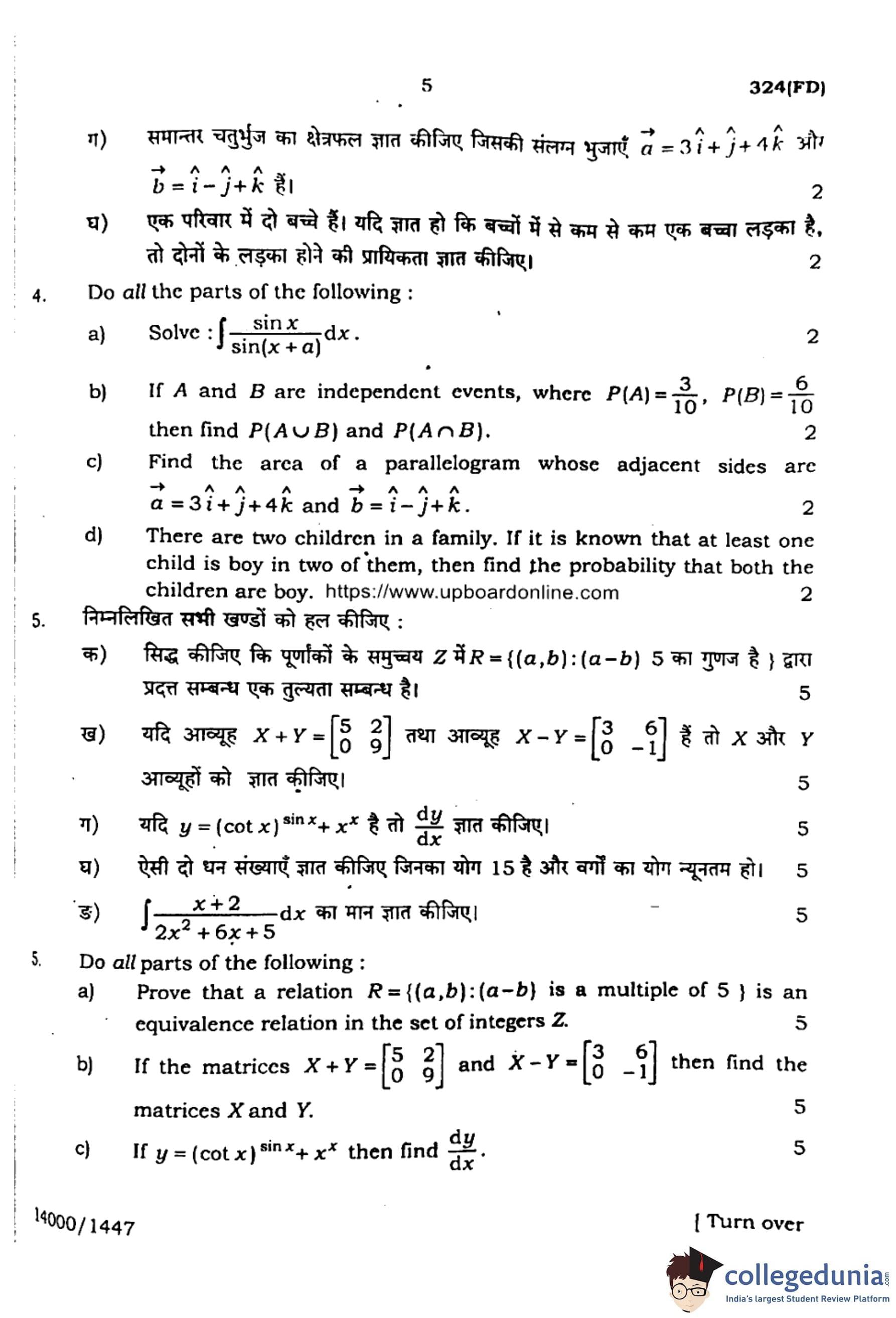 UP Board Class 12 Mathematics Question Paper 2024 (Code 324 FD) with Solutions