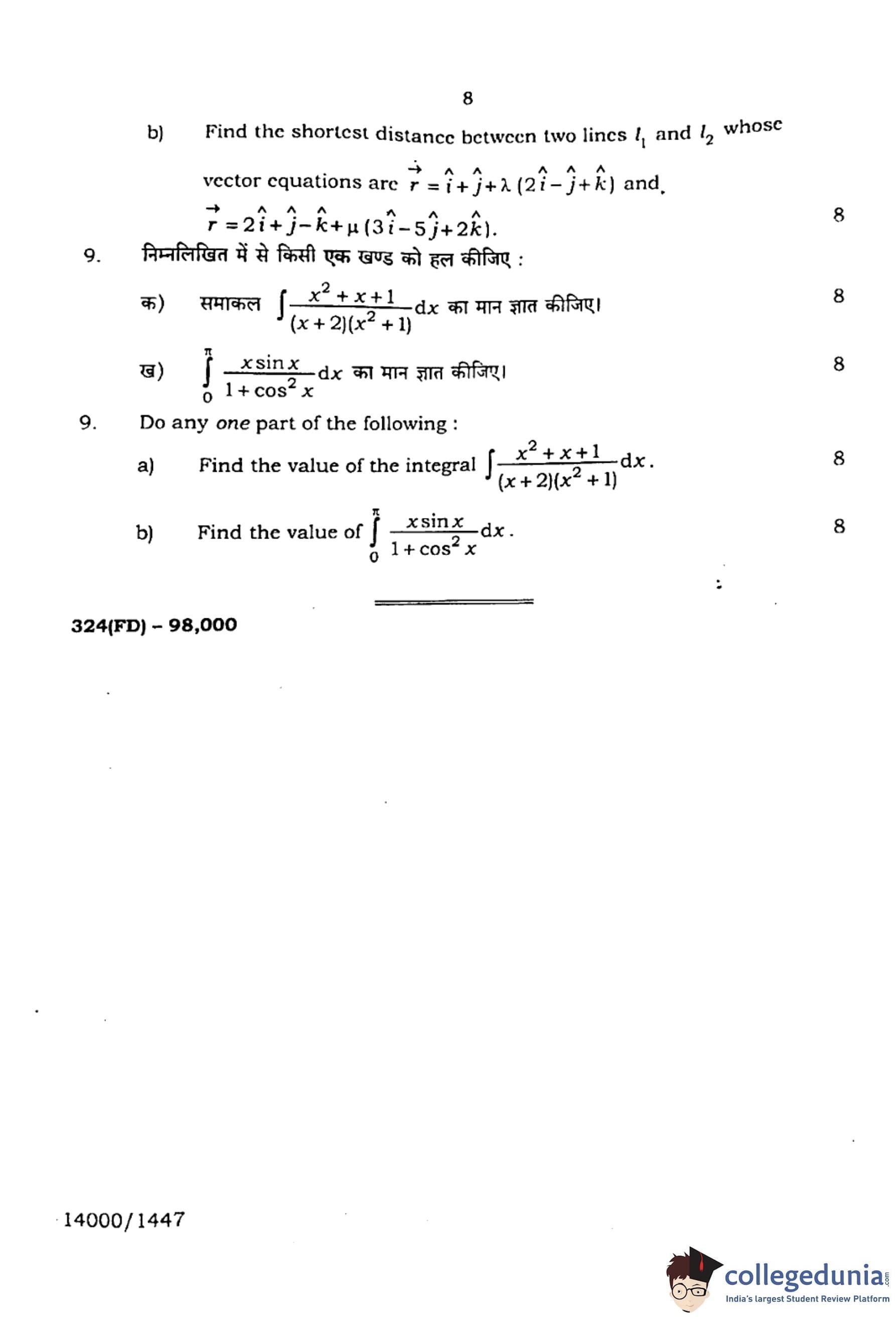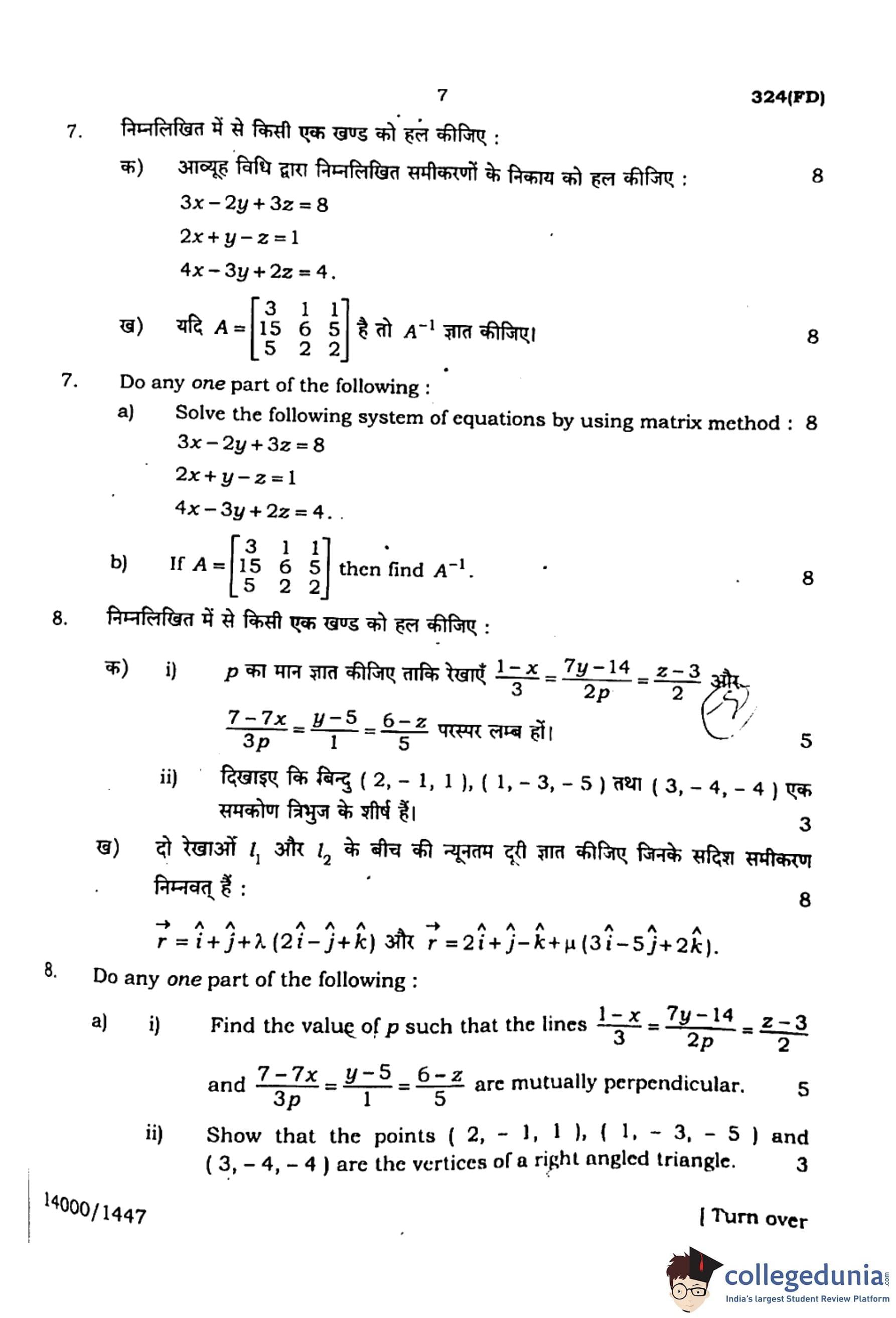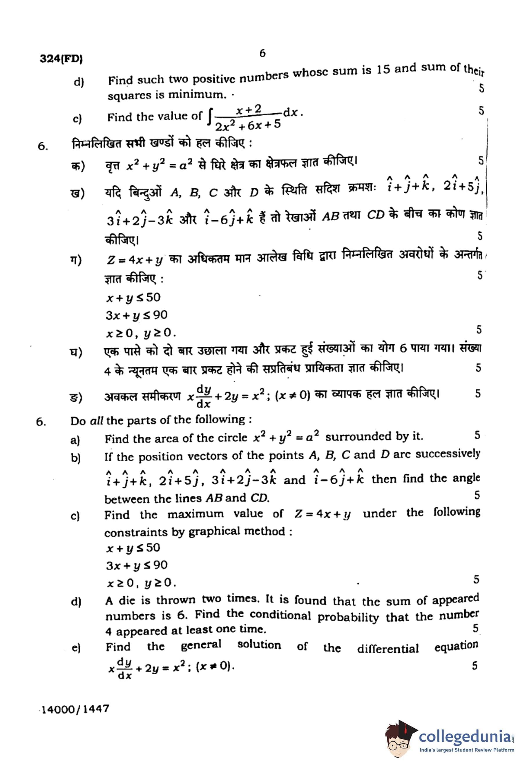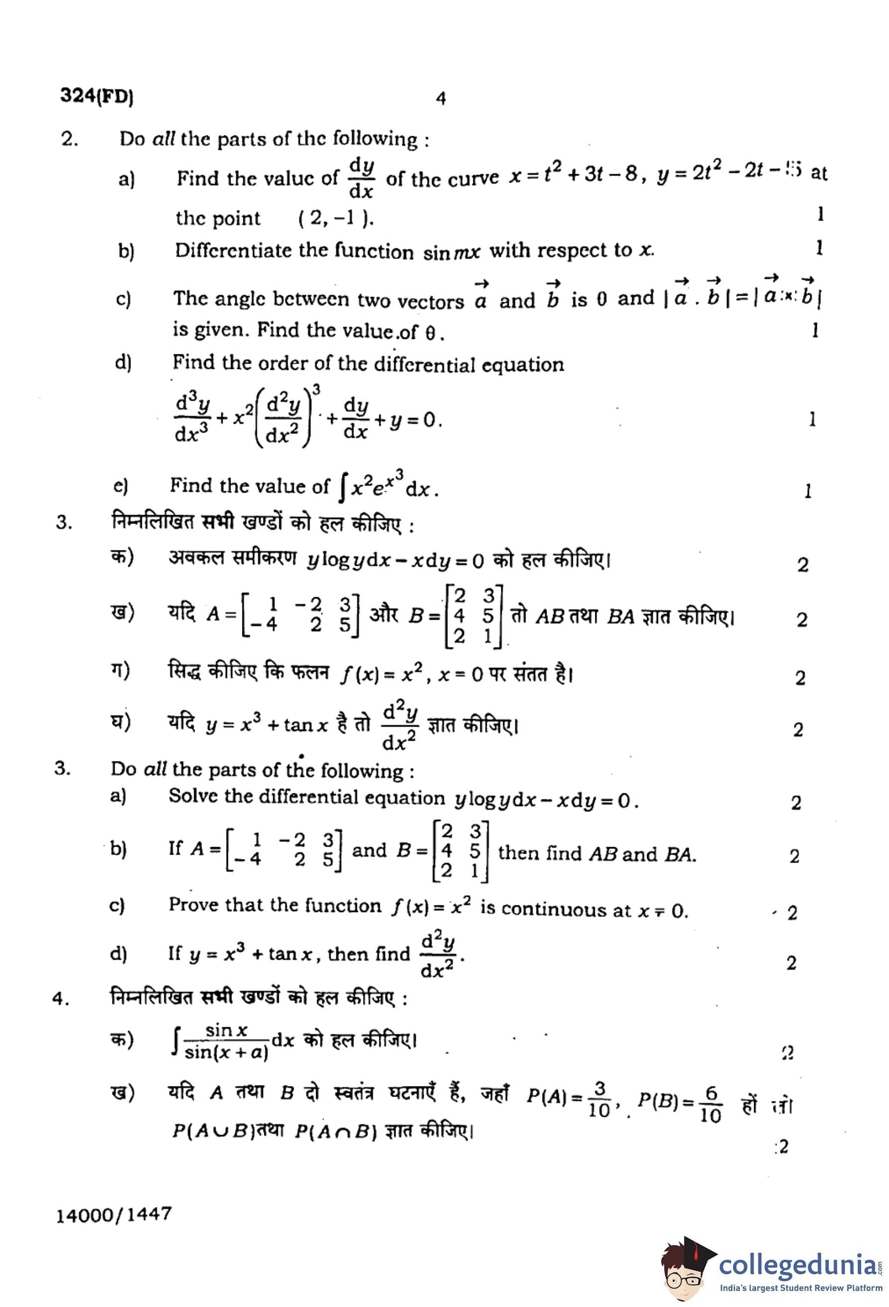 UP Board Class 12 Mathematics Question Paper 2024 (Code 324 FD) with Solutions