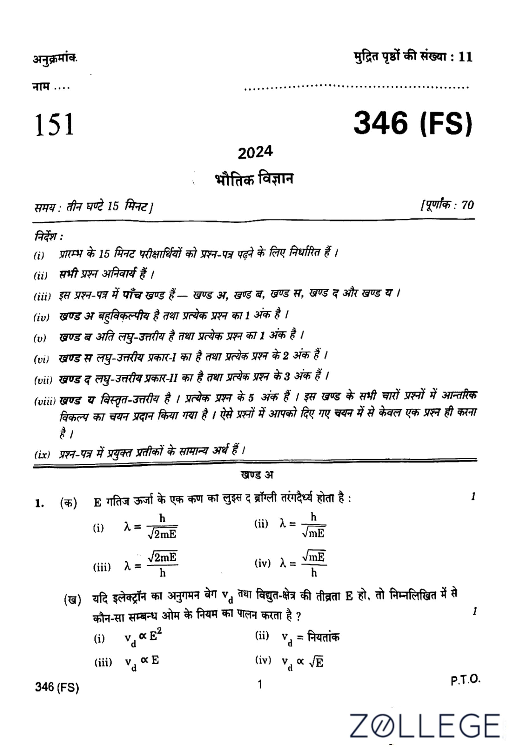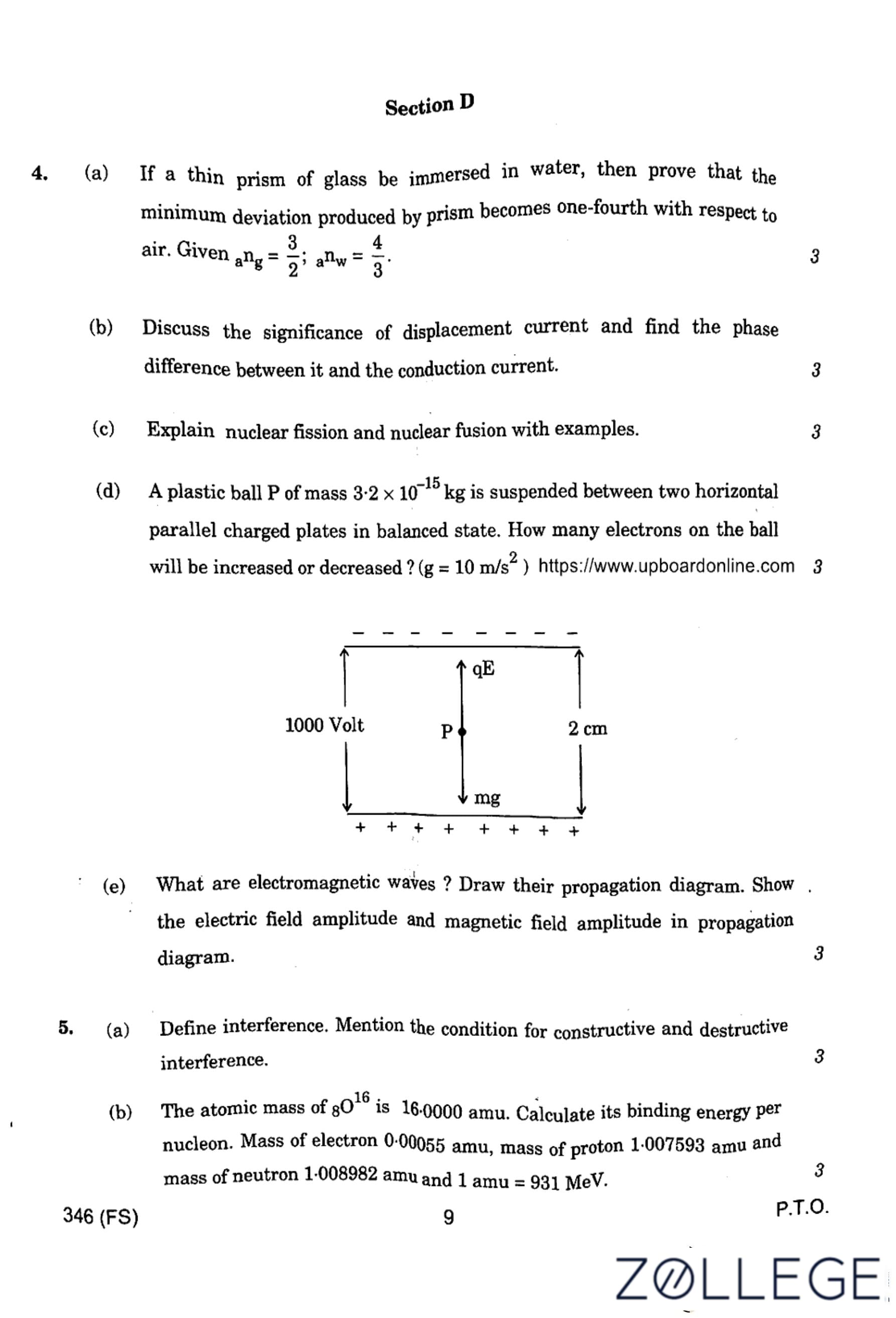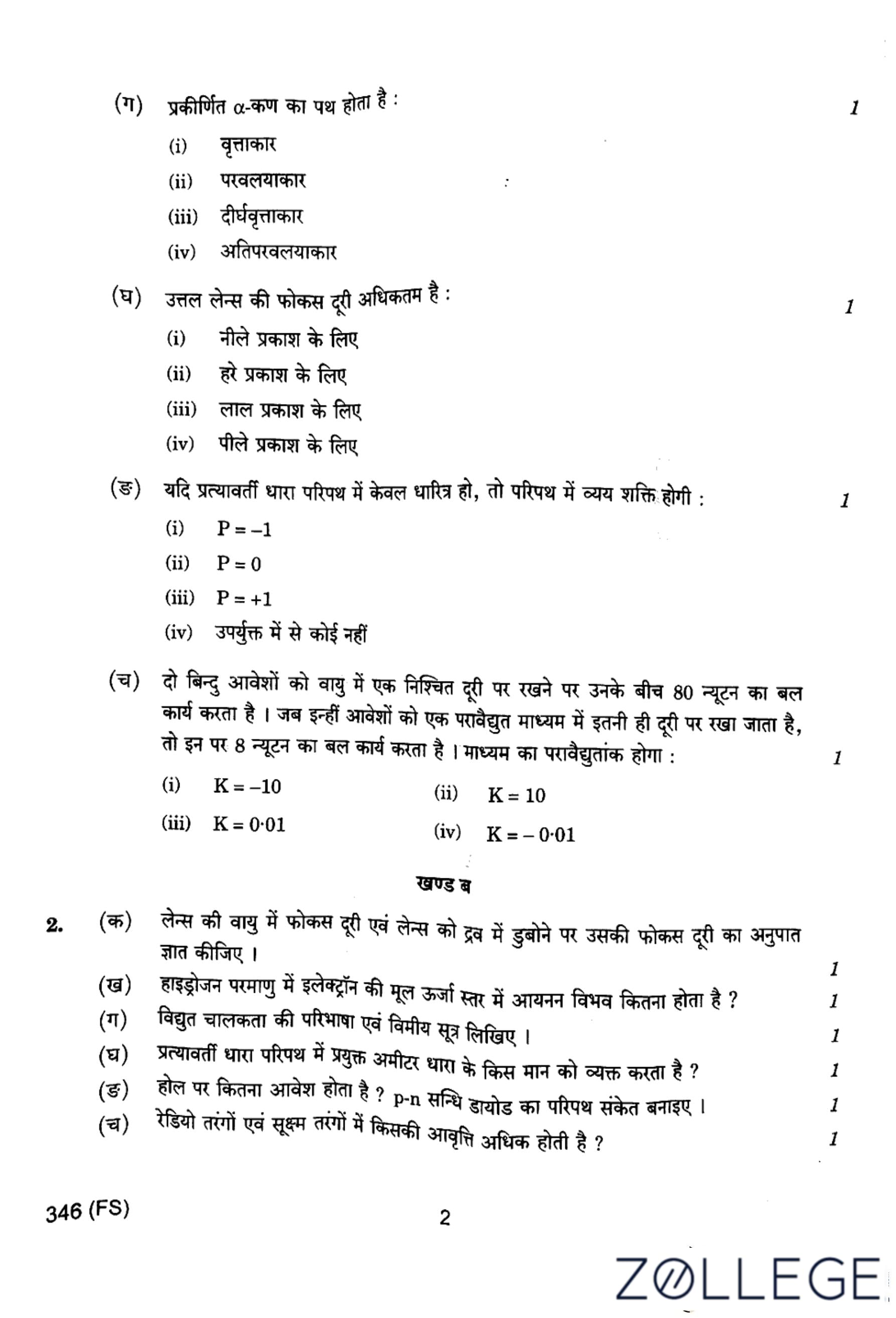 UP Board Class 12 Physics Question Paper 2024 (Code 346 FS) with Solutions