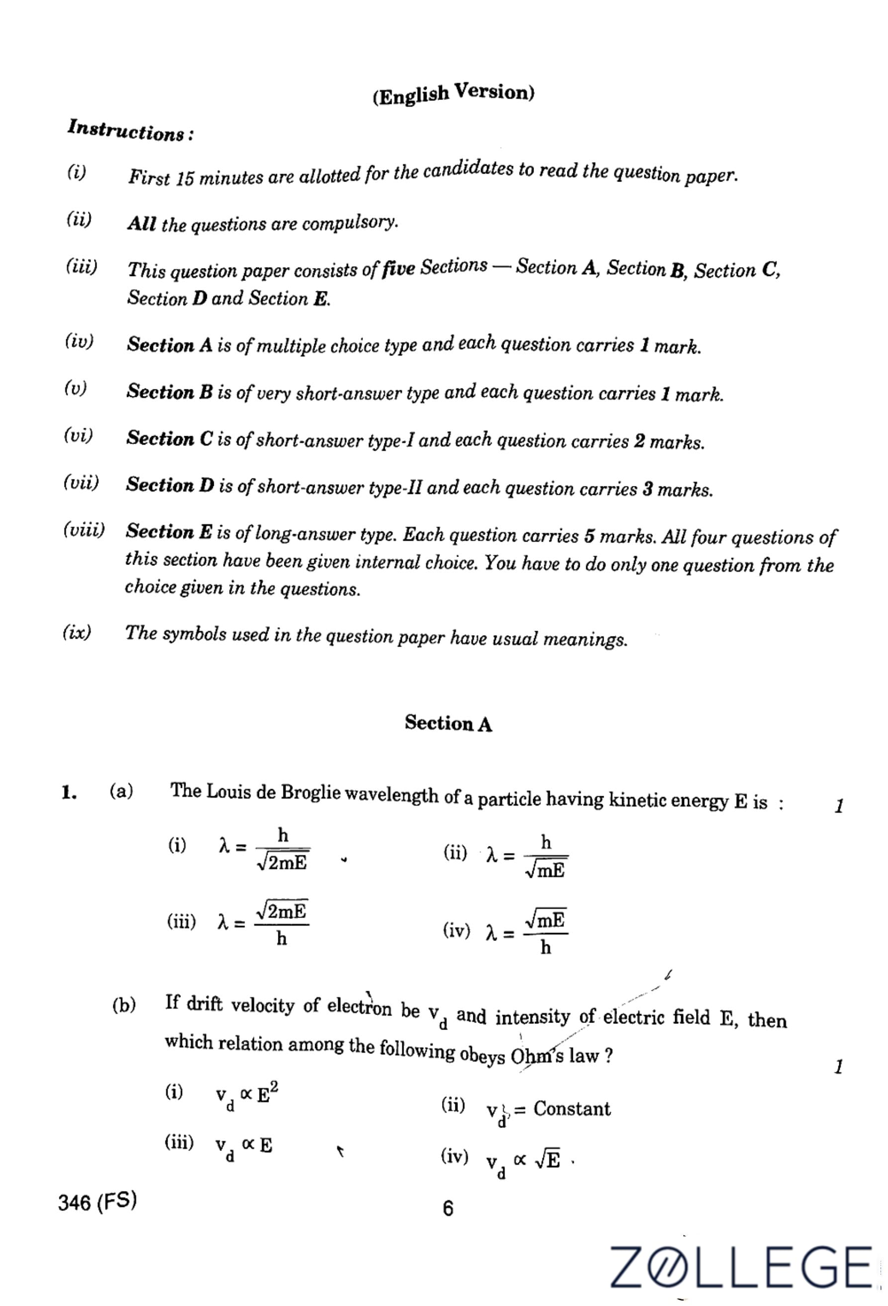 Correct Answer: (i) \( \lambda = \frac{h}{\sqrt{2mE}} \). Quick Tip: The de Broglie wavelength is inversely related to the square root of the particle’s kinetic energy and its mass.