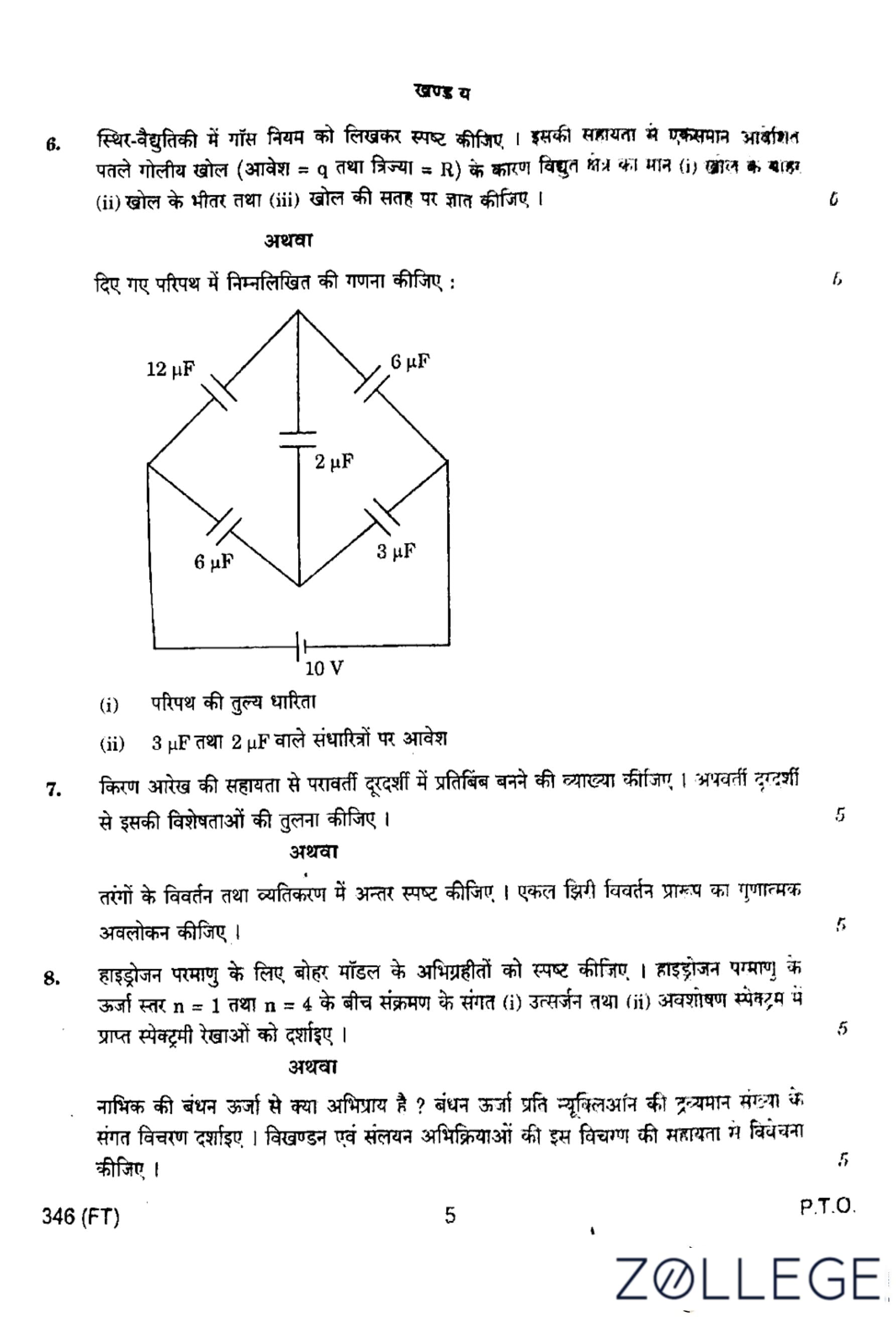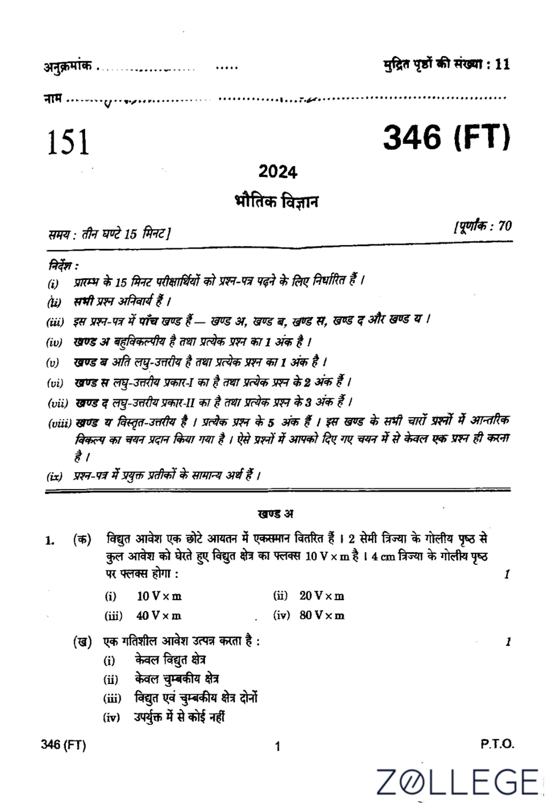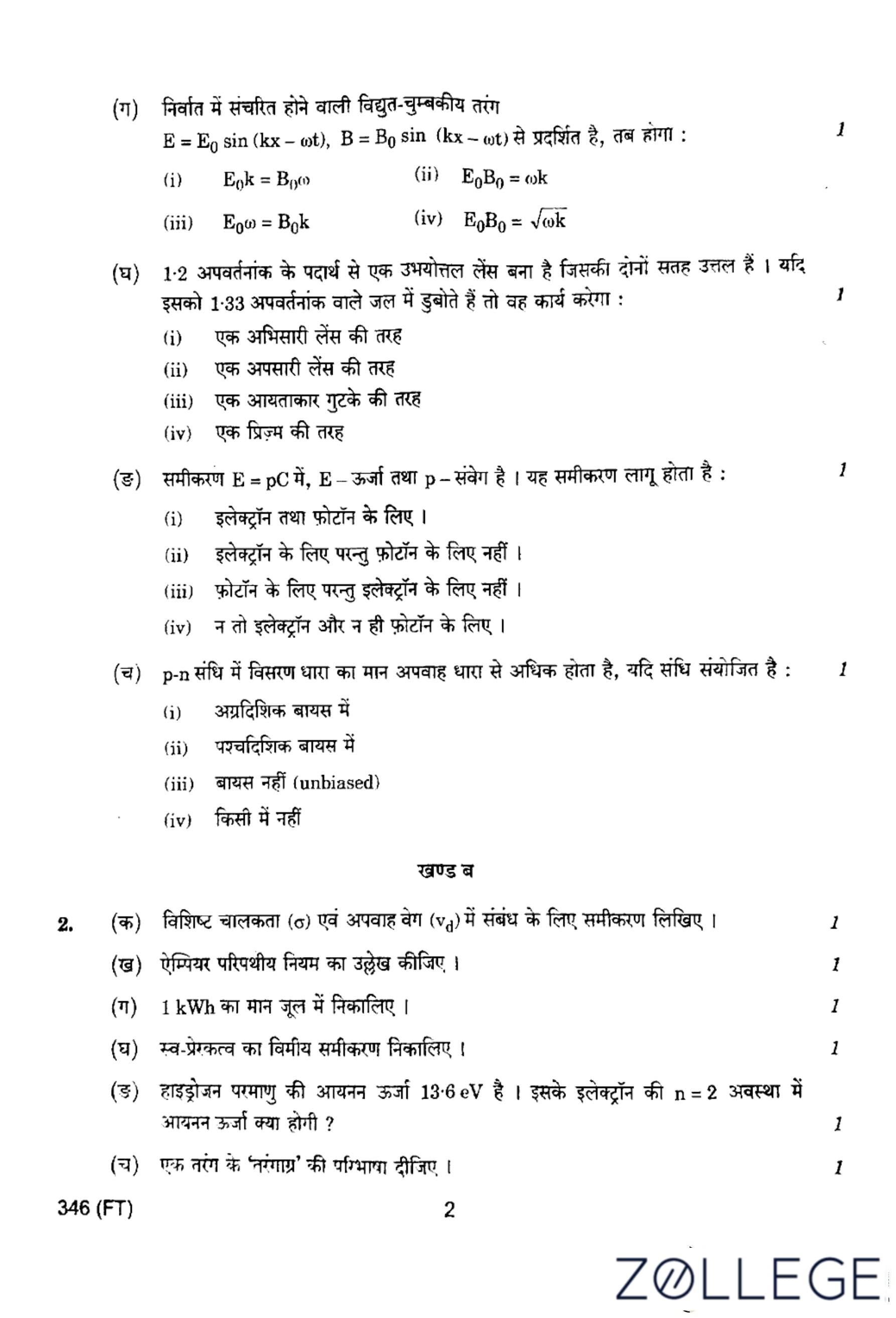 UP Board Class 12 Physics Question Paper 2024 (Code 346 FT) with Solutions