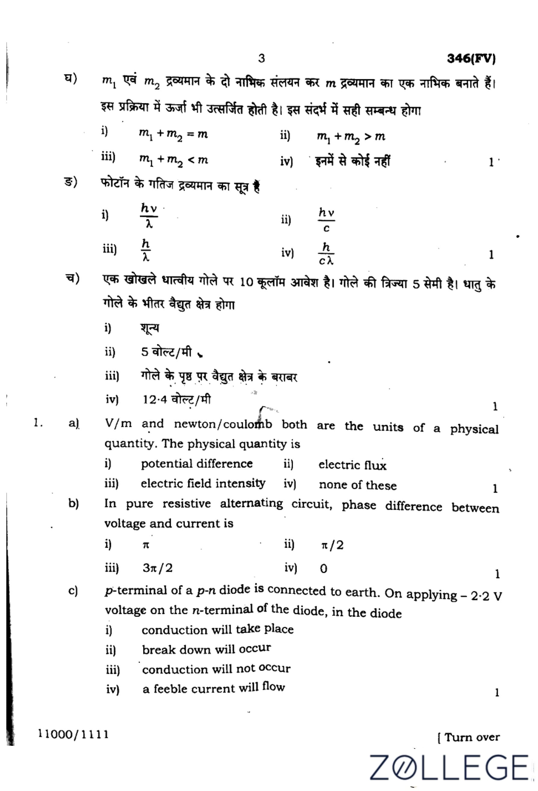 (b). In pure resistive alternating circuit, phase difference between voltage and current is: