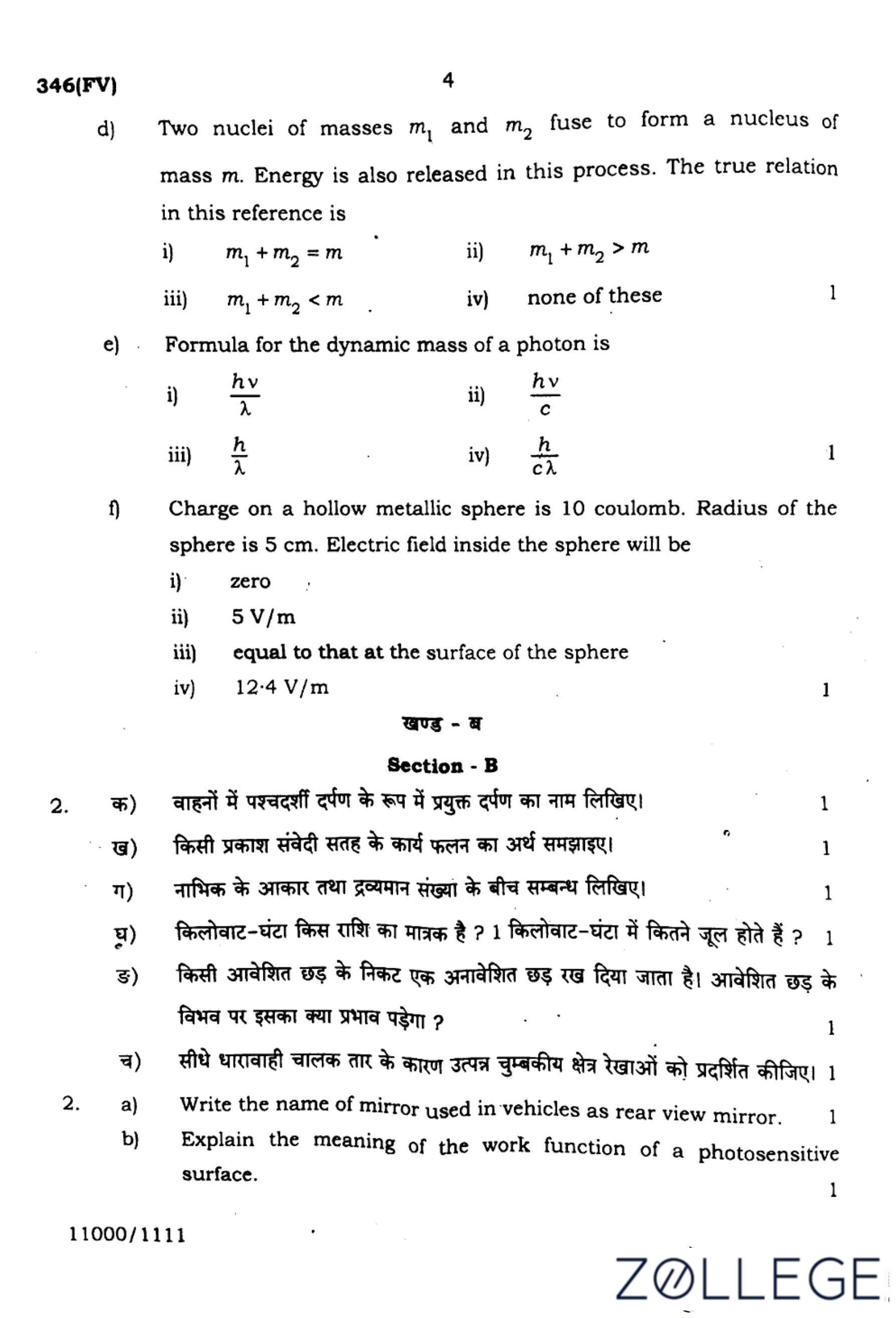 (f). Charge on a hollow metallic sphere is \(10\) coulomb. Radius of the sphere is \(5\) cm. Electric field inside the sphere will be: