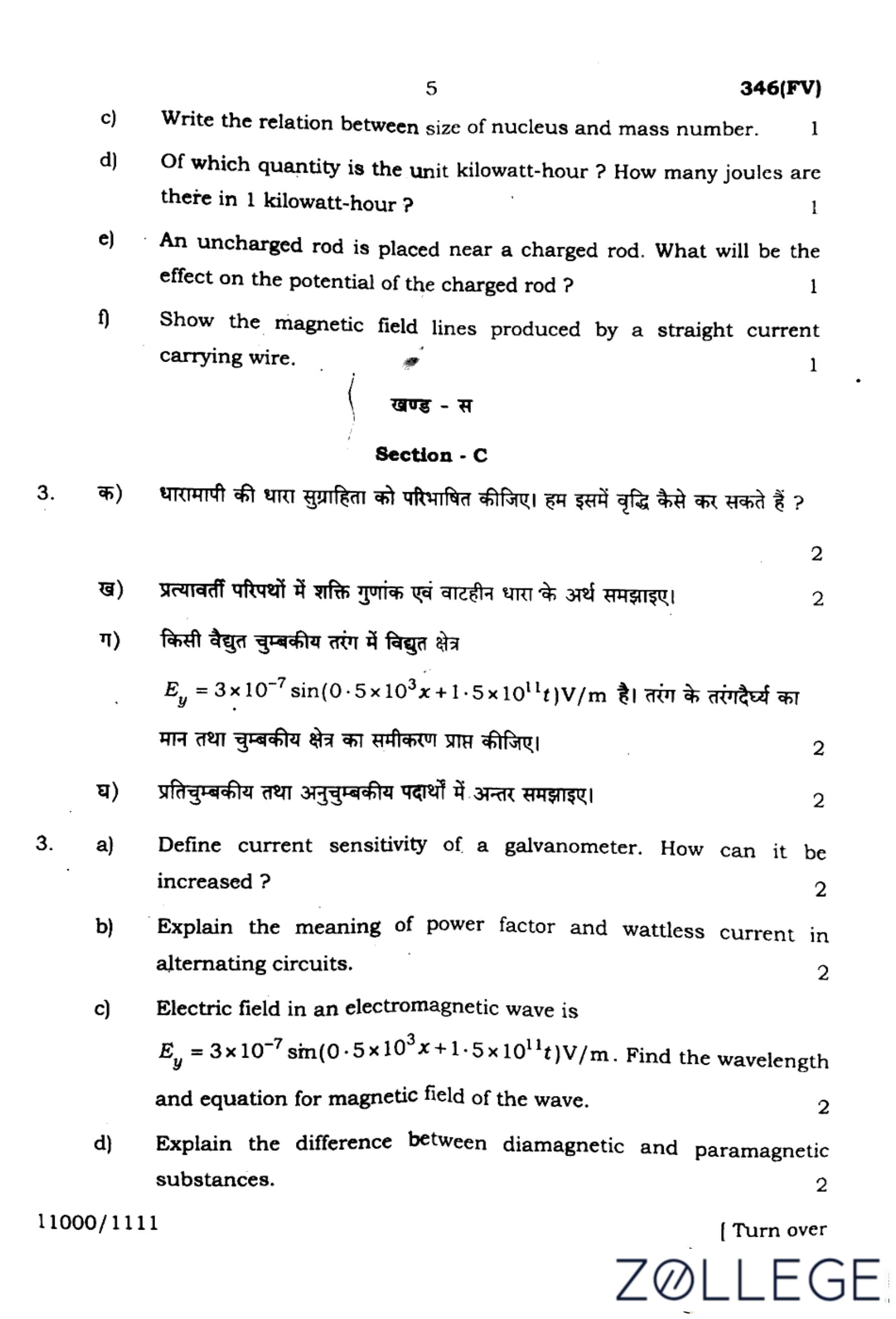 From the equation, the wave number $k = 0.5 \times 10^3 \, \text{m}^{-1}$. The wavelength is given by: \[ \lambda = \frac{2\pi}{k} = \frac{2\pi}{0.5 \times 10^3} = 12.57 \, \text{m}. \] 2. Magnetic Field ($B_z$):