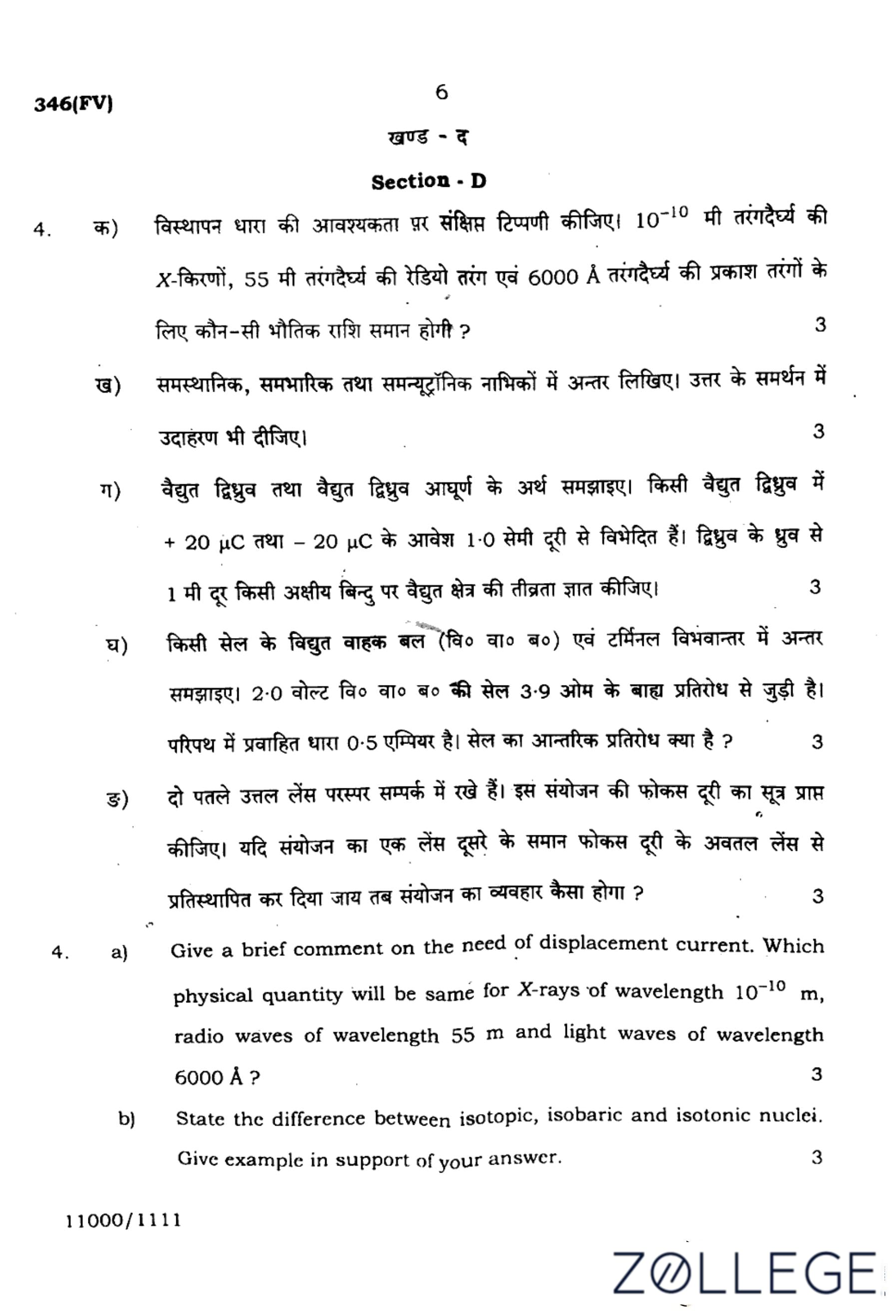 (a). Give a brief comment on the need of displacement current. Which physical quantity will be same for X-rays of wavelength $10^{-10}$ m, radio waves of wavelength 55 m, and light waves of wavelength 6000 Å?