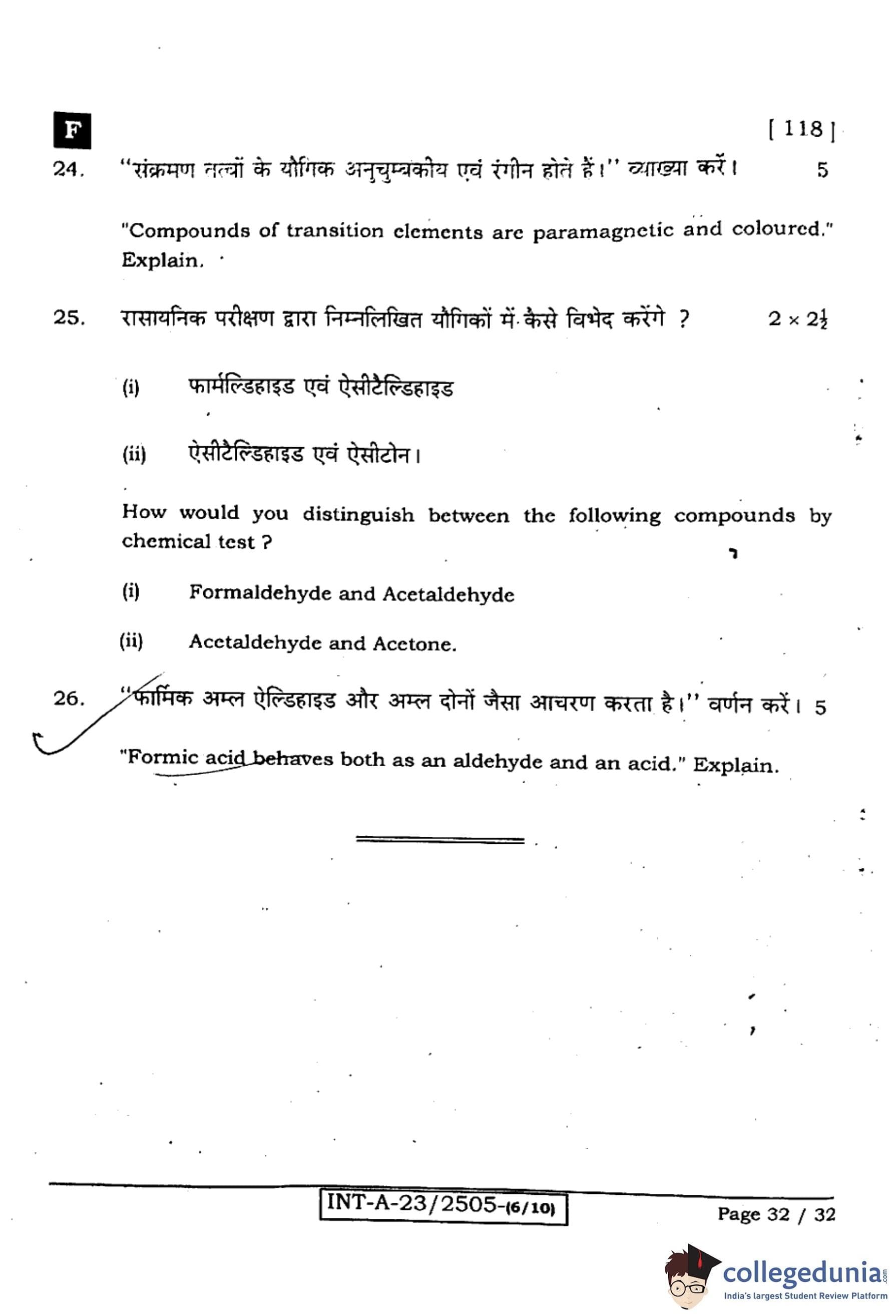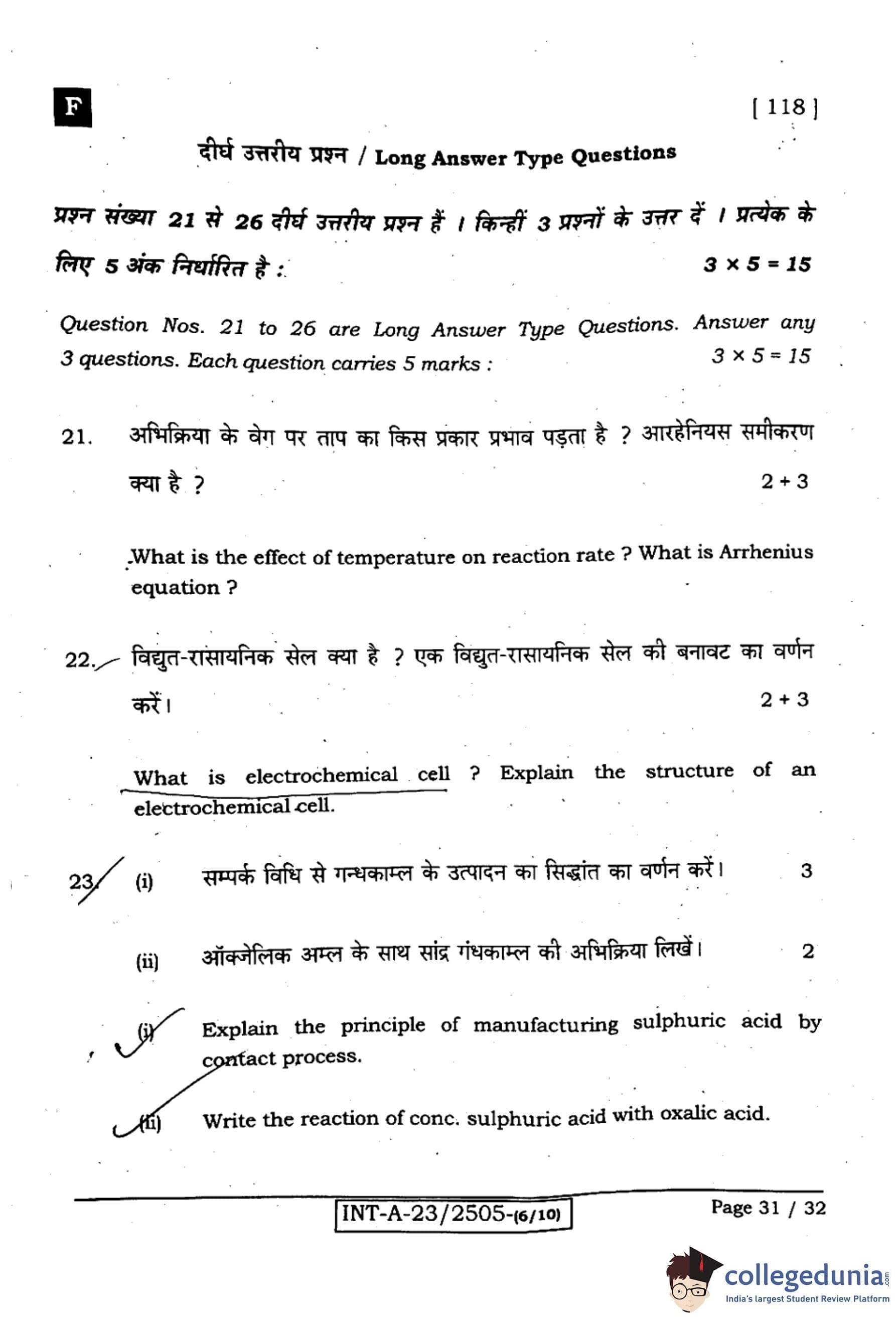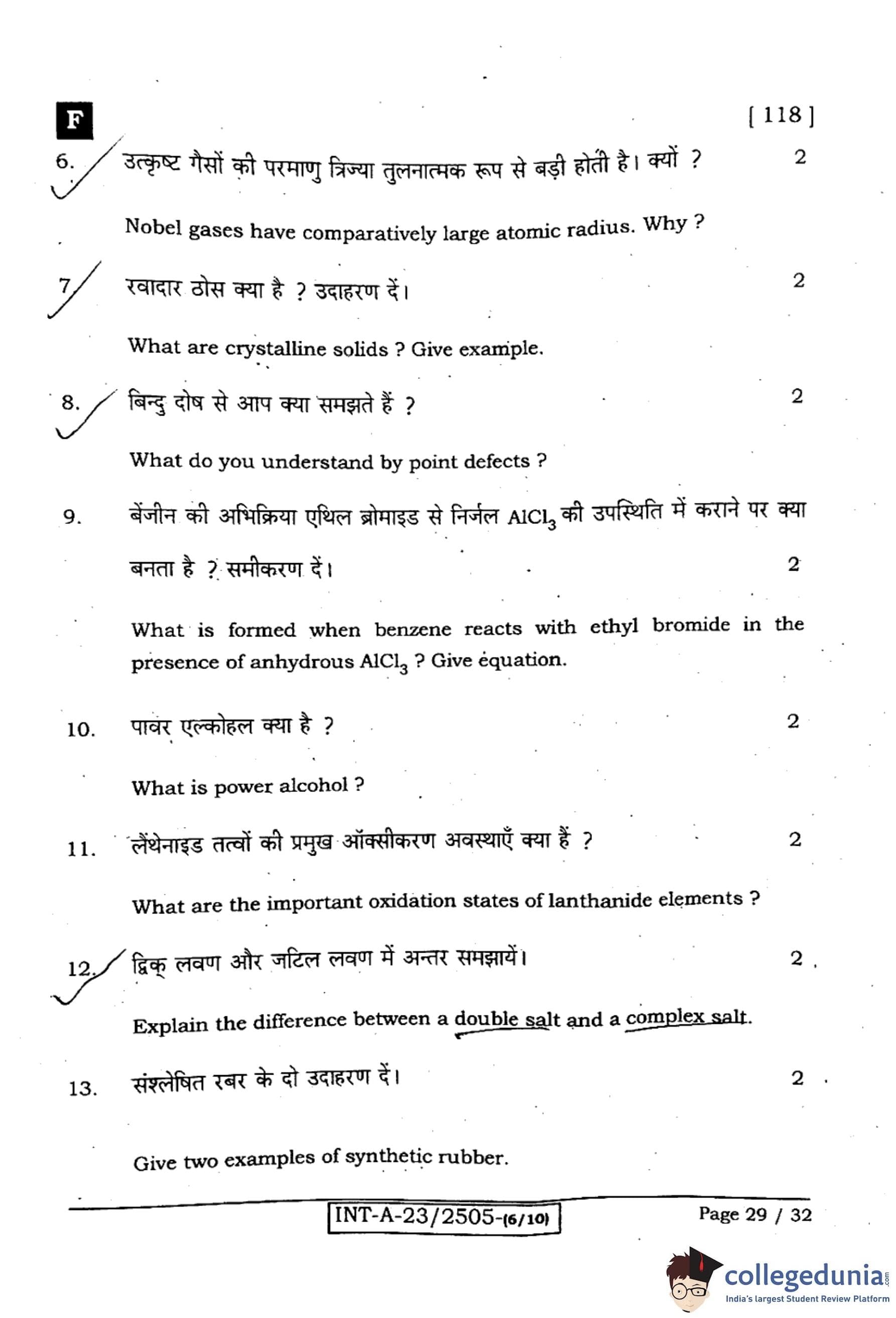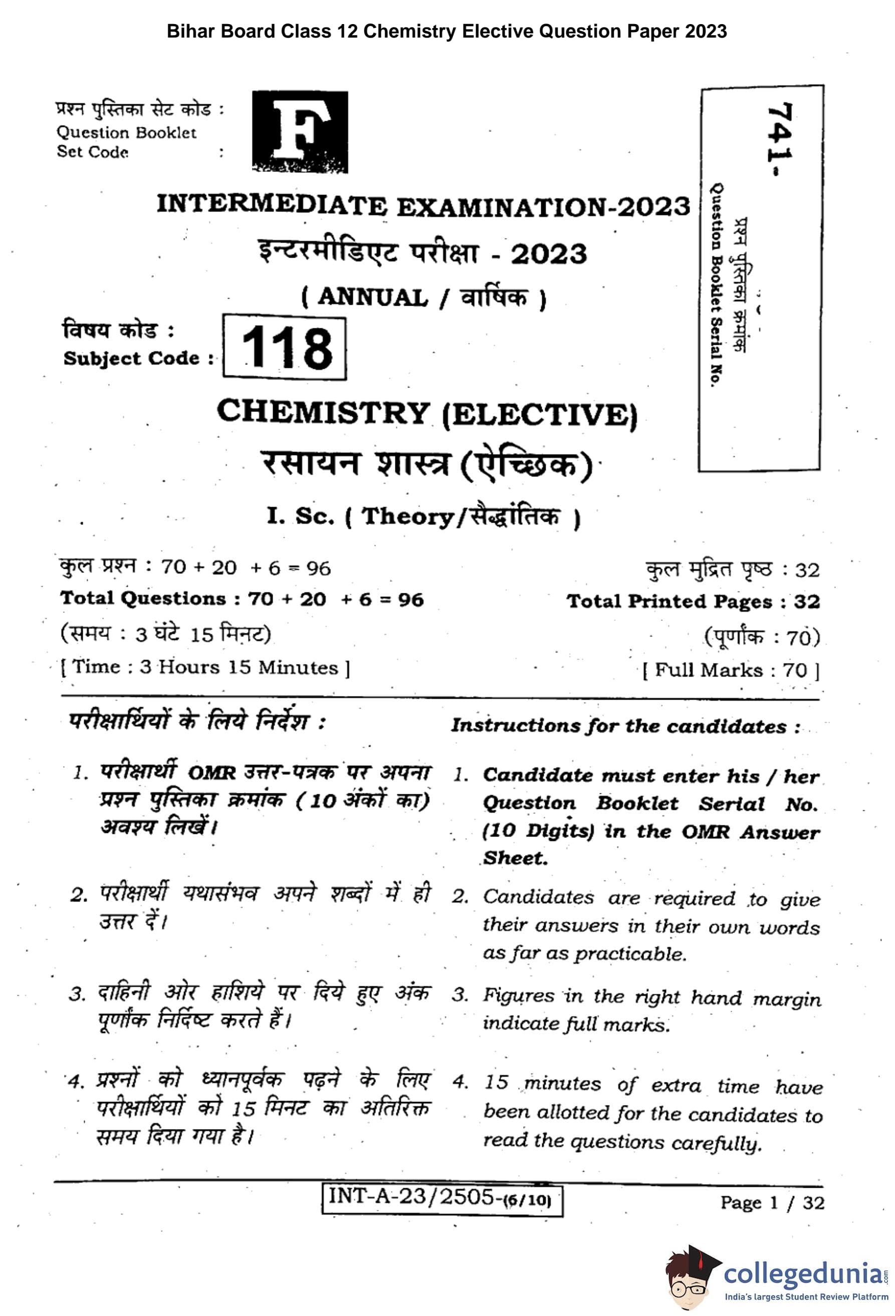 Bihar Board Class 12 Chemistry Question Paper 2023 (Code 118 Set – F) with Solutions