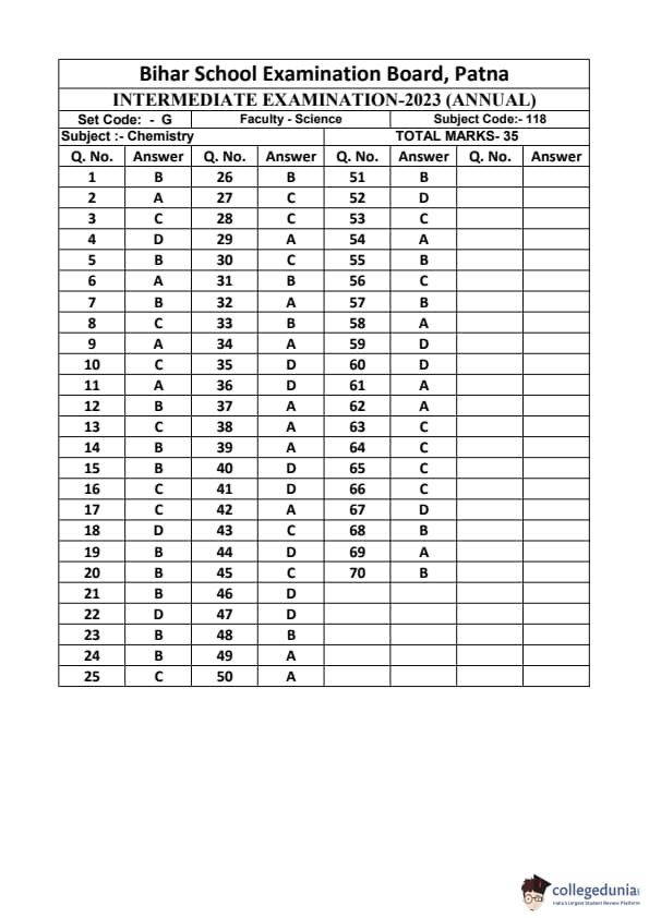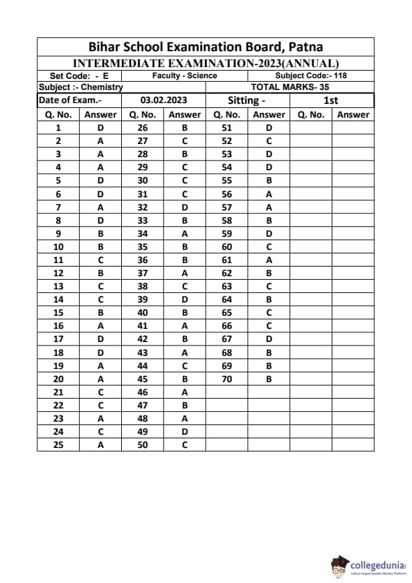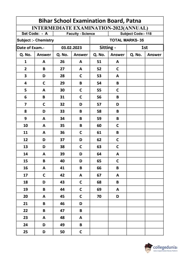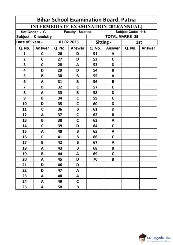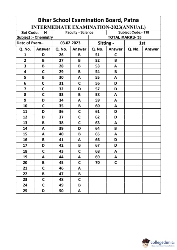 | Bihar Board Class 12 Chemistry Question Paper with Answer Key | Check Solutions |