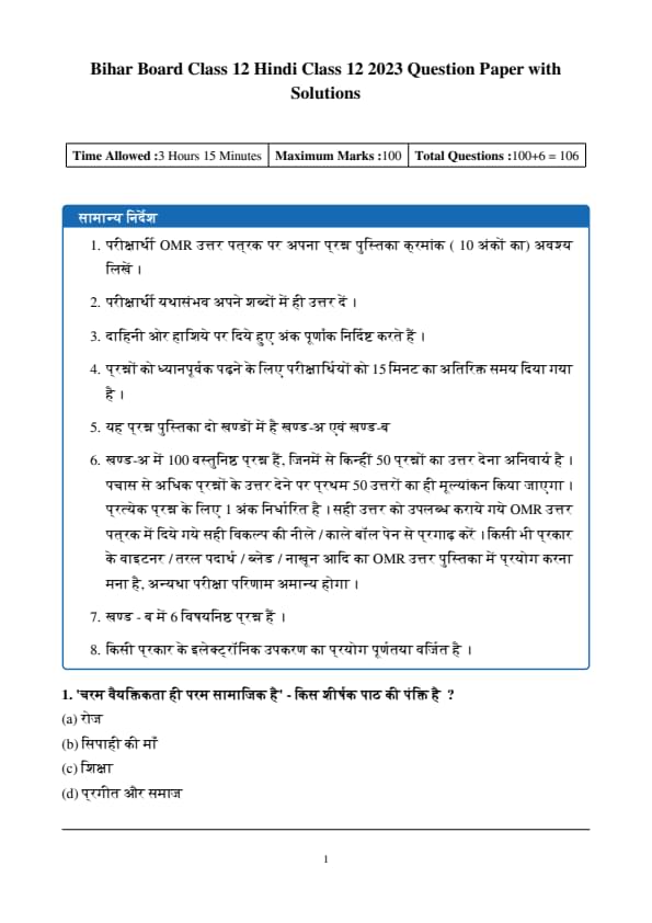 Bihar Board Class 12 English Question Paper PDF with Solutions is available for download. The Bihar School Examination Board (BSEB) conducted the Class 12 examination for a total duration of 3 hours 15 minutes, and the Bihar Board Class 12 English question paper was of a total of 100 marks.