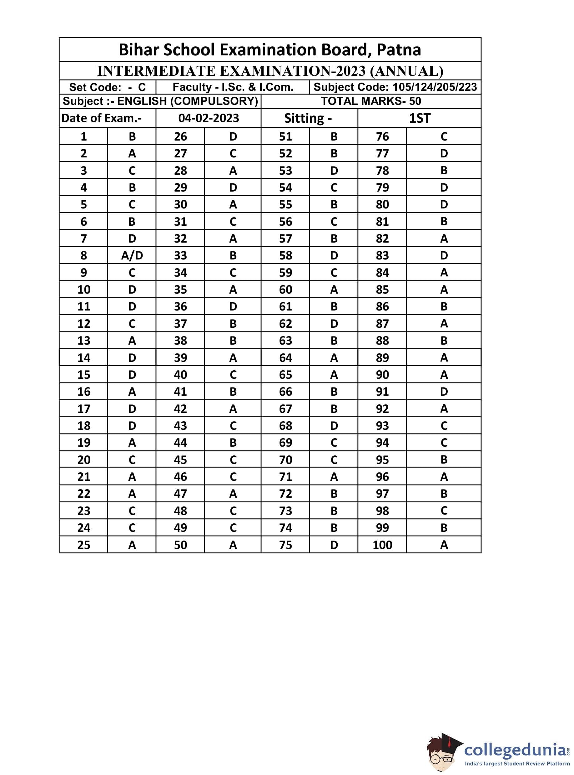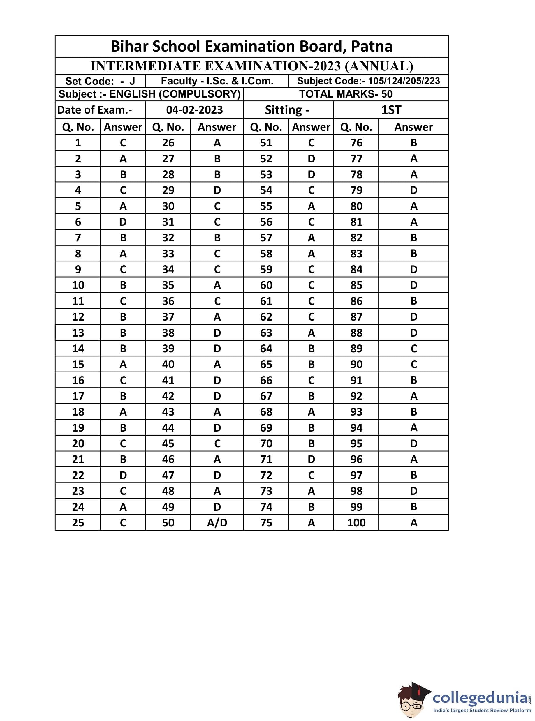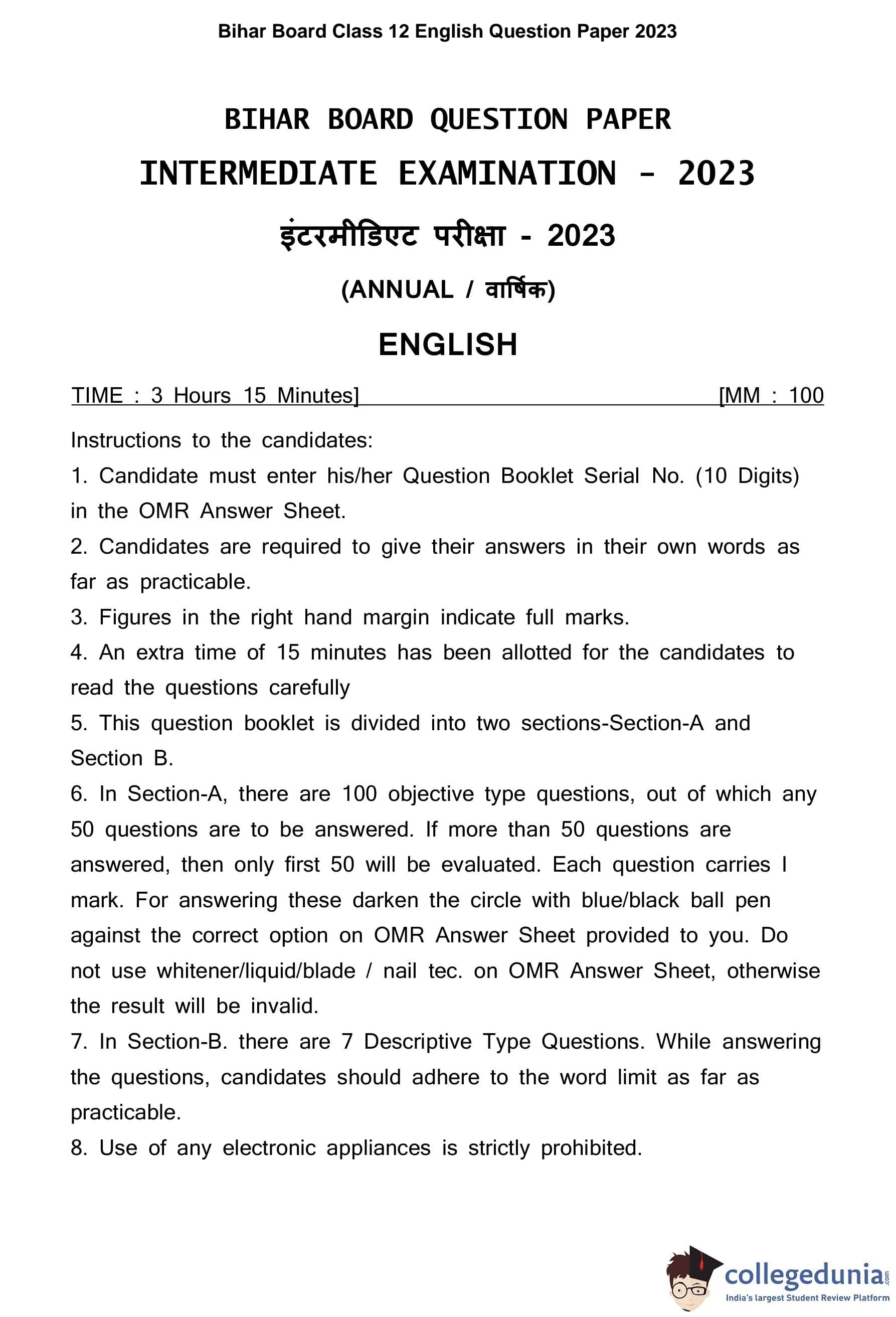 Bihar Board Class 12 English Question Paper 2023 with Answer Key pdf is available for download here. The exam was conducted by Bihar School Examination Board (BSEB). The question paper comprised a total of 107 questions divided among 2 sections.