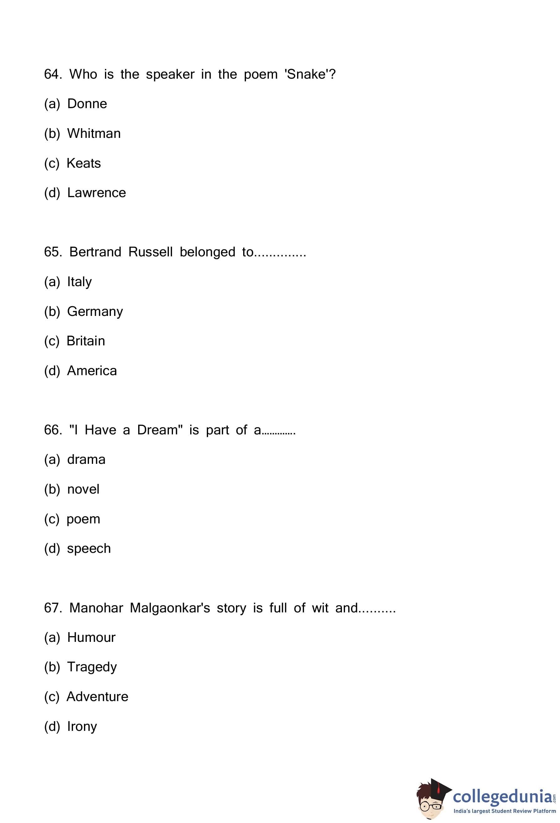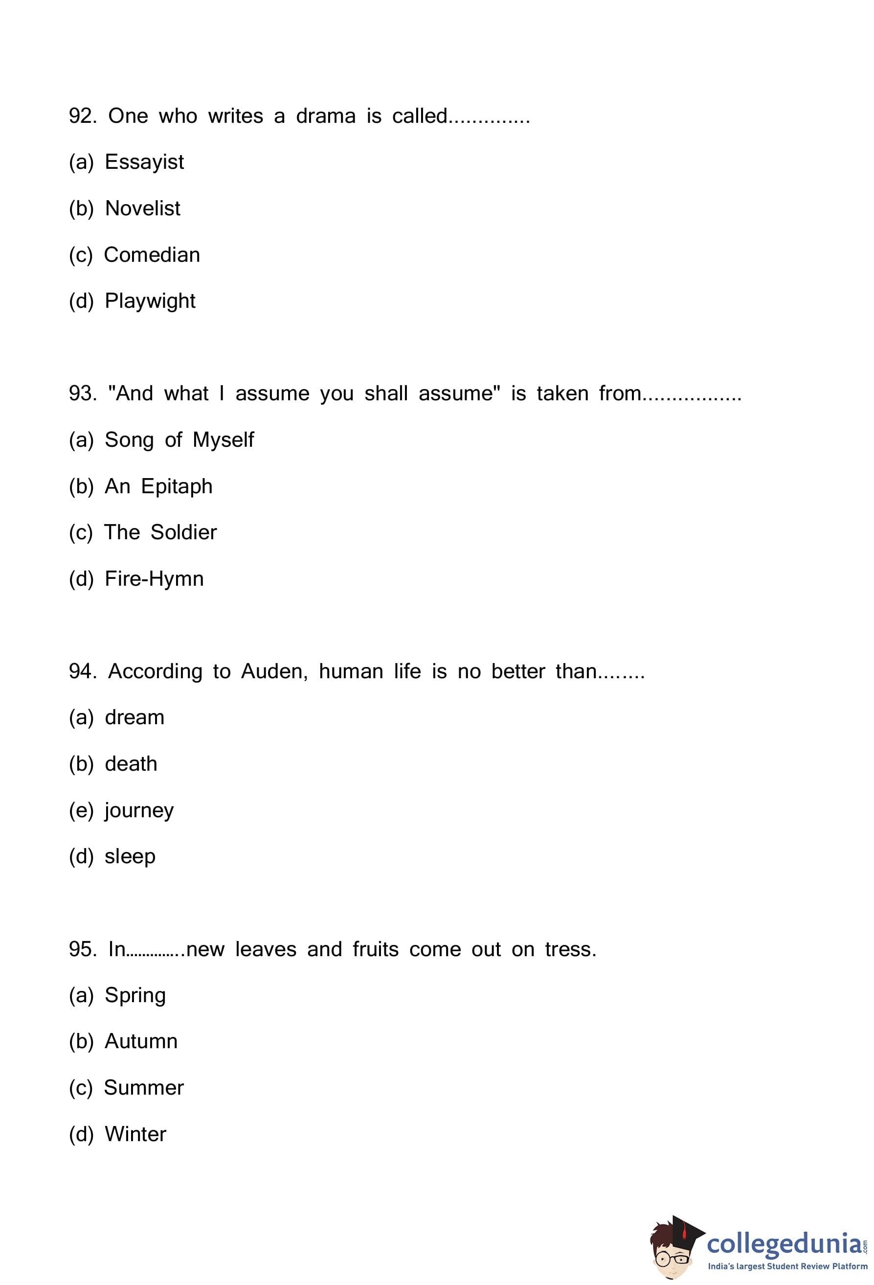 Thus, the correct matching highlights each poet’s distinct theme — from Whitman’s self-expression to Keats’s nature worship, Brooke’s patriotism, Das’s nostalgia, and de la Mare’s reflection on mortality.