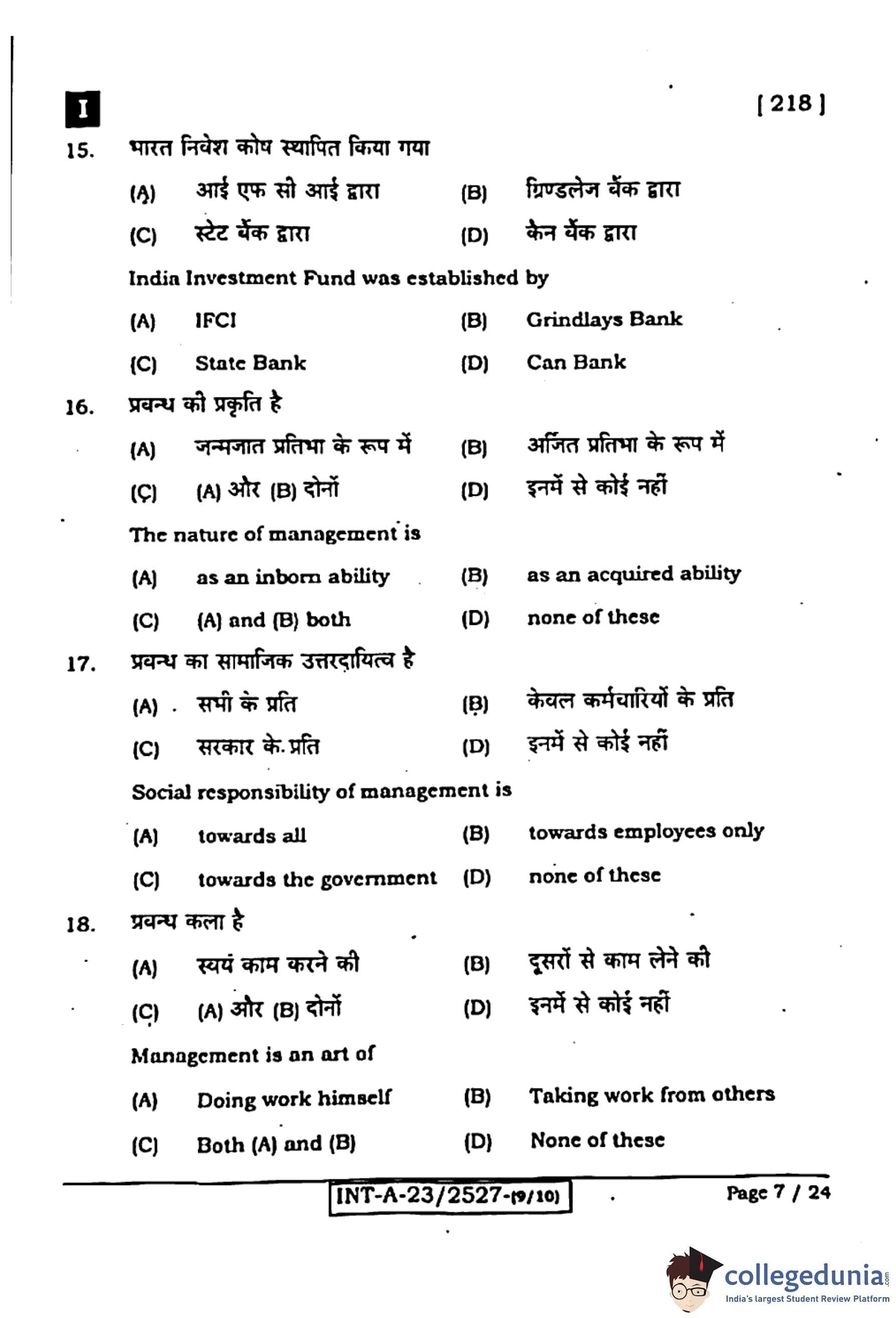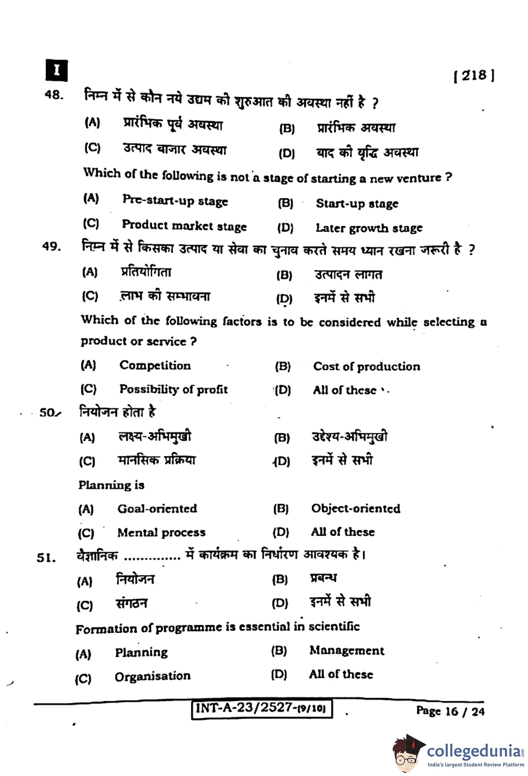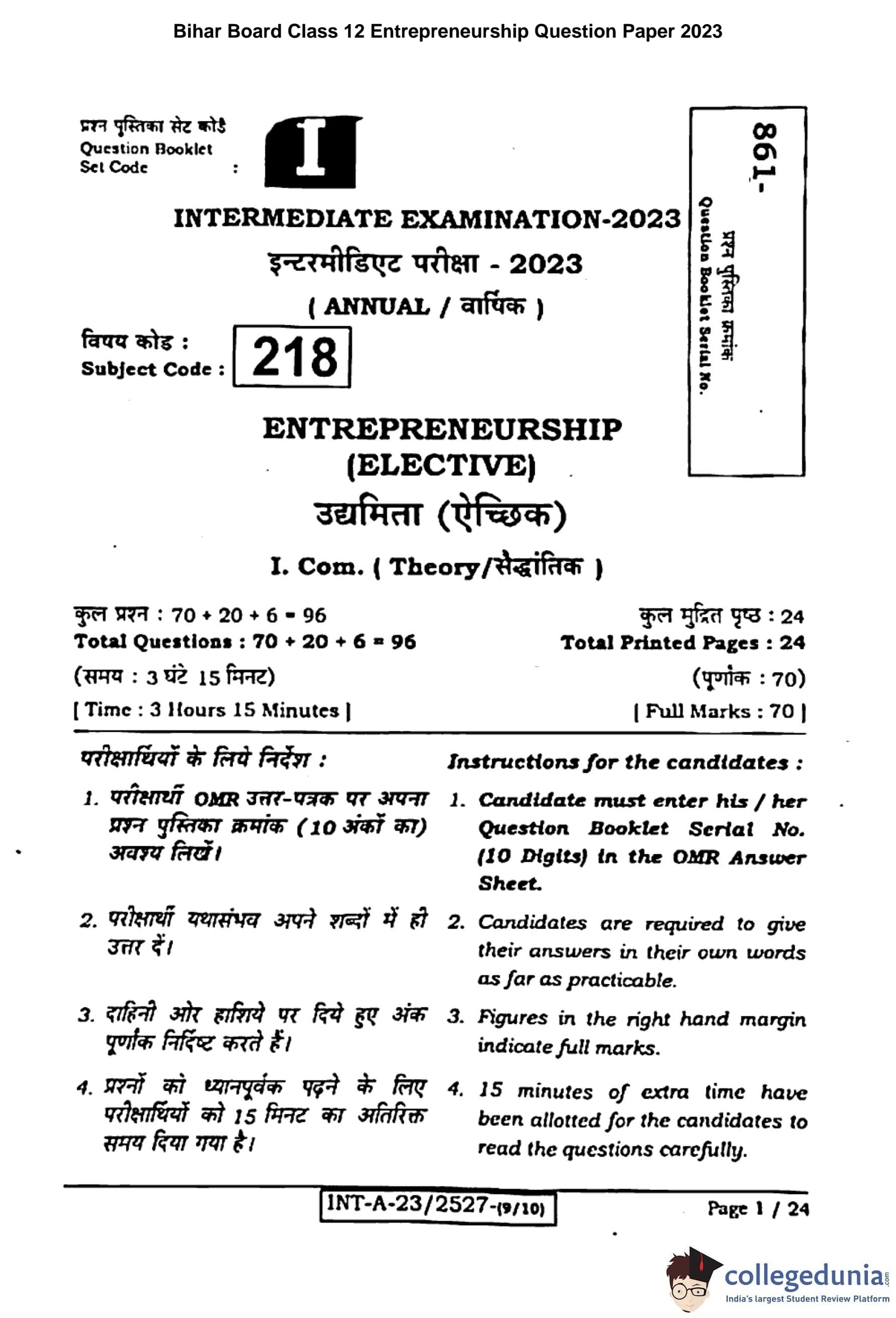 Bihar Board Class 12 Entrepreneurship Question Paper 2024 (Code 218 Set – I) with Solutions pdf is available for download here. The exam was conducted by Bihar School Examination Board (BSEB). The question paper comprised a total of 96 questions divided among 2 sections.