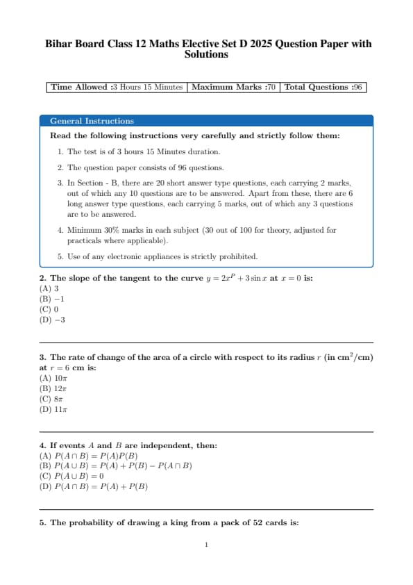 Bihar Board Class 12 Maths Set D Question Paper PDF with Solutions is available for download. The Bihar School Examination Board (BSEB) conducted the Class 12 examination for a total duration of 3 hours 15 minutes, and the Bihar Board Class 12 Maths Set D question paper was of a total of 100 marks.