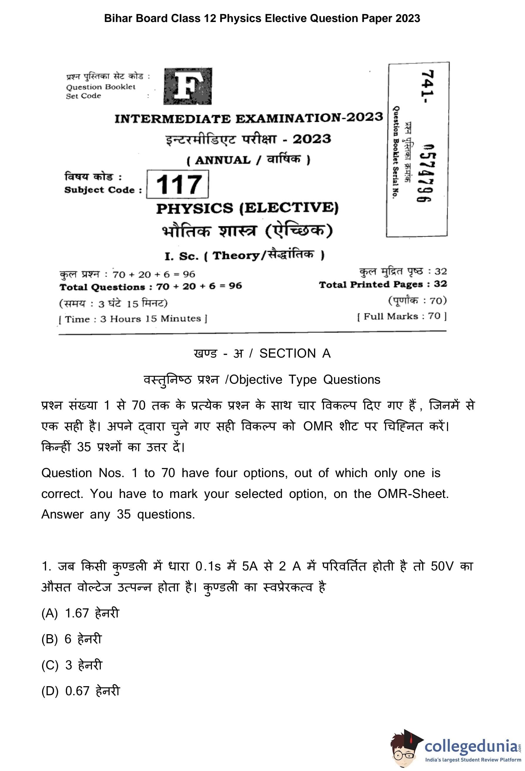 Bihar Board Class 12 Physics Elective Question Paper 2023 with Answer Key pdf is available for download here. The exam was conducted by Bihar School Examination Board (BSEB). The question paper comprised a total of 96 questions divided among 2 sections.