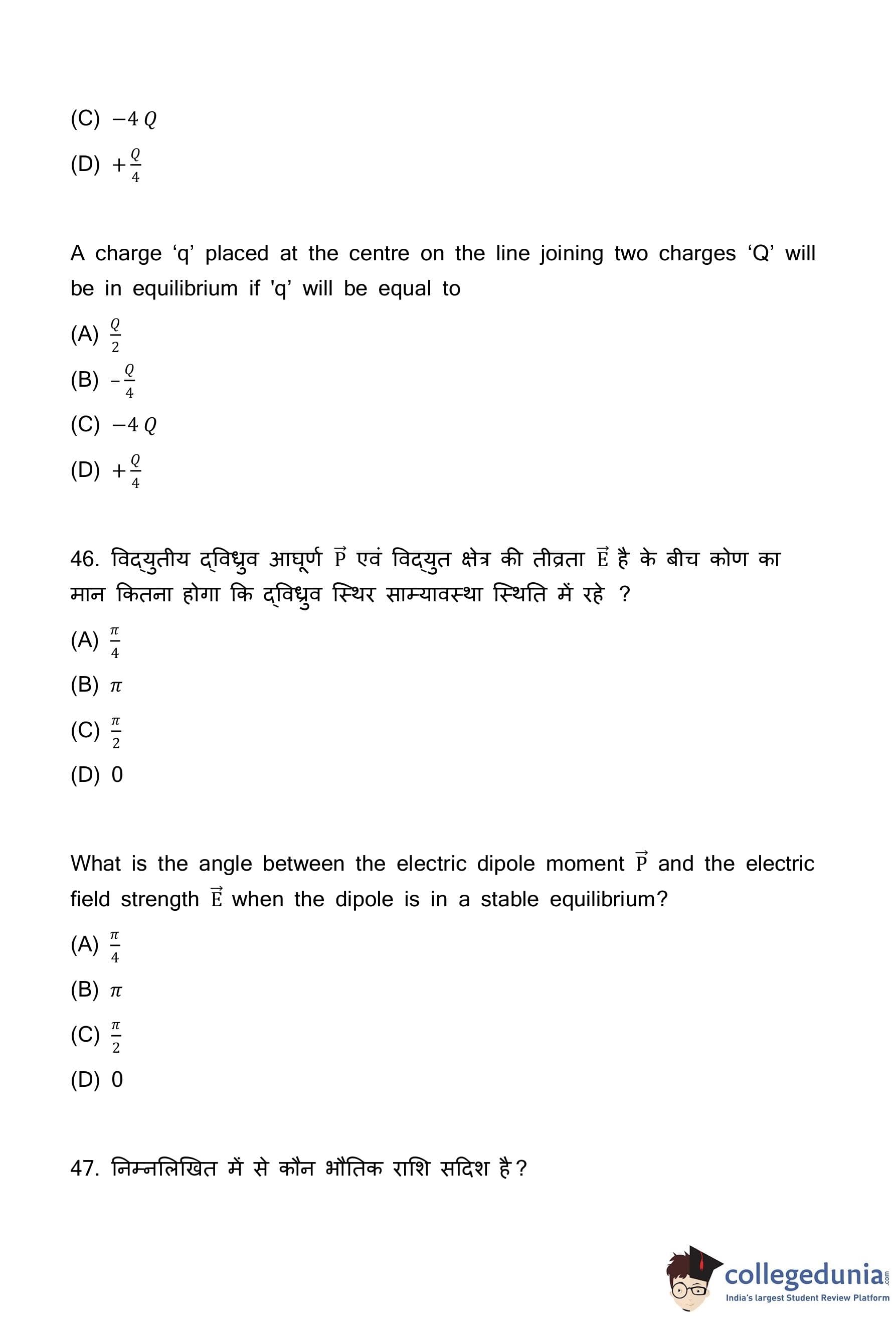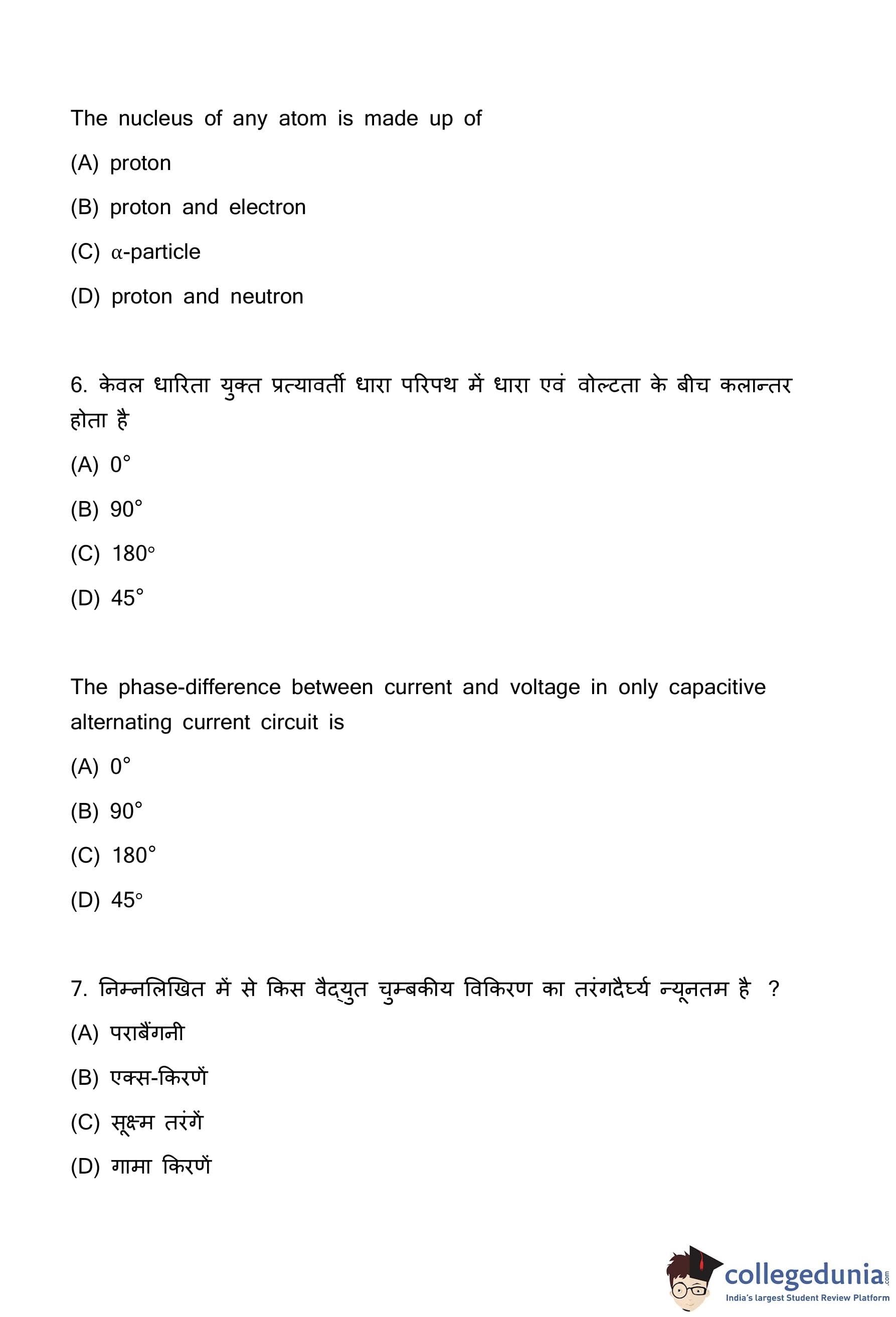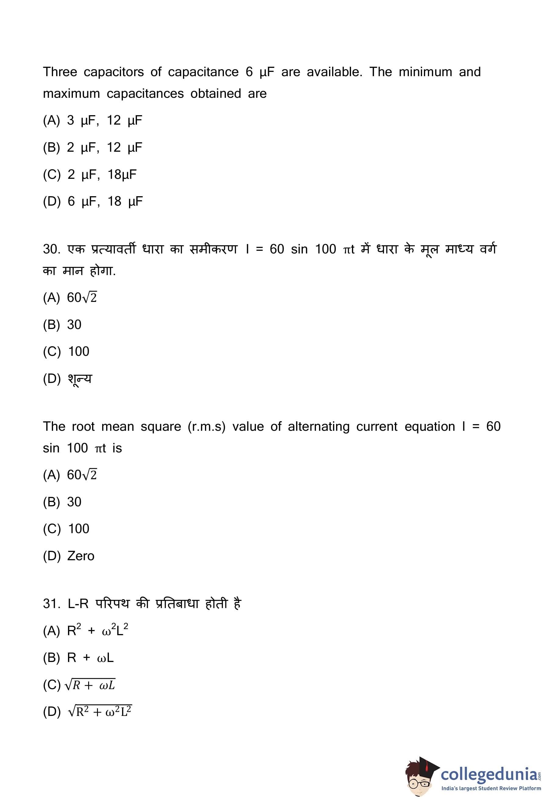 Quick Tip: A useful mnemonic to remember the phase relationship in AC circuits is "CIVIL": In a \textbf{C}apacitor (C), \textbf{I} (current) leads \textbf{V} (voltage). In an \textbf{I}nductor (L), \textbf{V} (voltage) leads \textbf{I} (current). This helps you quickly recall that for a capacitor, the phase difference is 90° with current ahead.