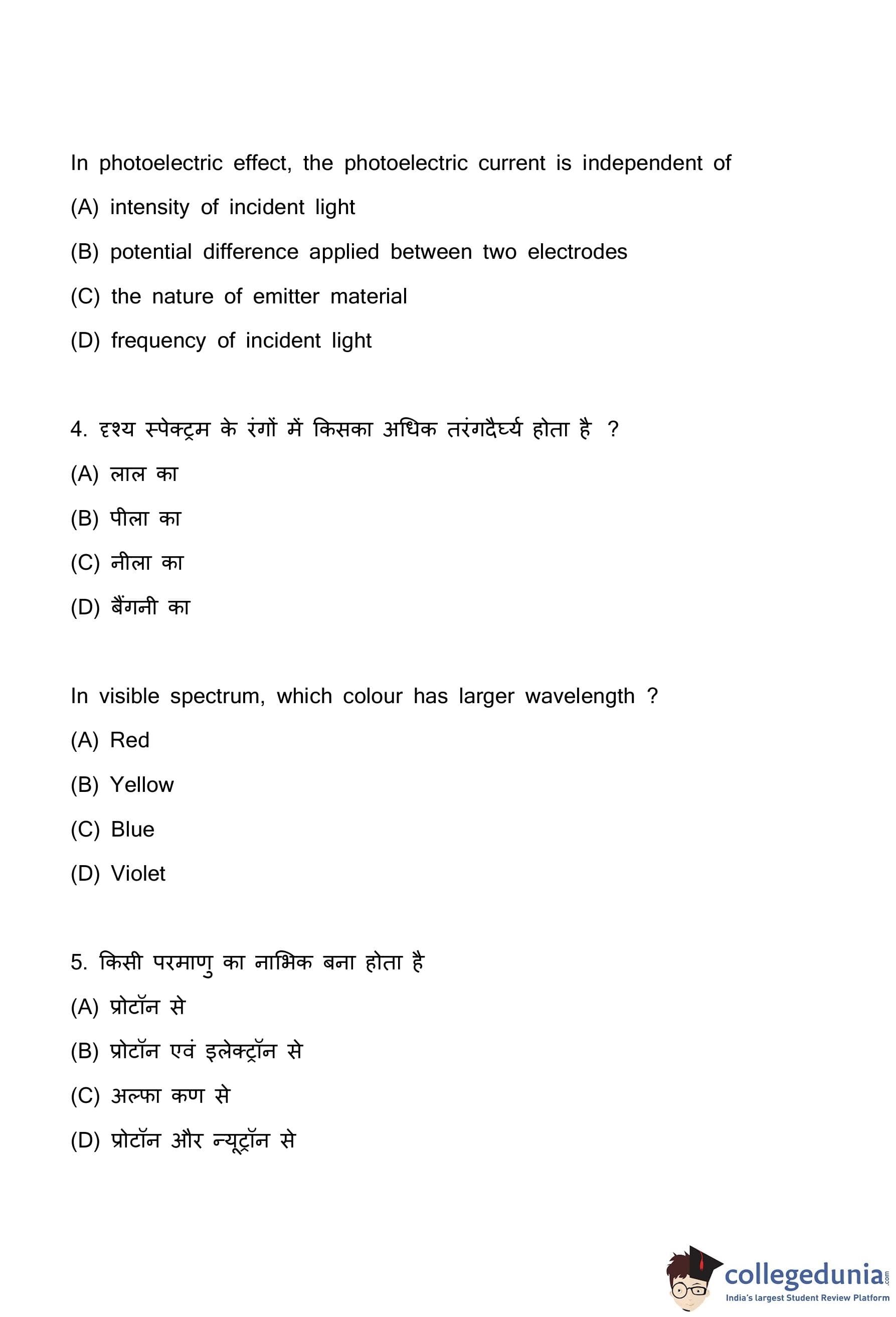 (A) Intensity of incident light: Photoelectric current is directly proportional to the intensity of the incident light (provided the frequency is above the threshold frequency). Higher intensity means more photons are striking the surface per unit time, which in turn ejects more electrons, leading to a larger current. So, the current is dependent on intensity.