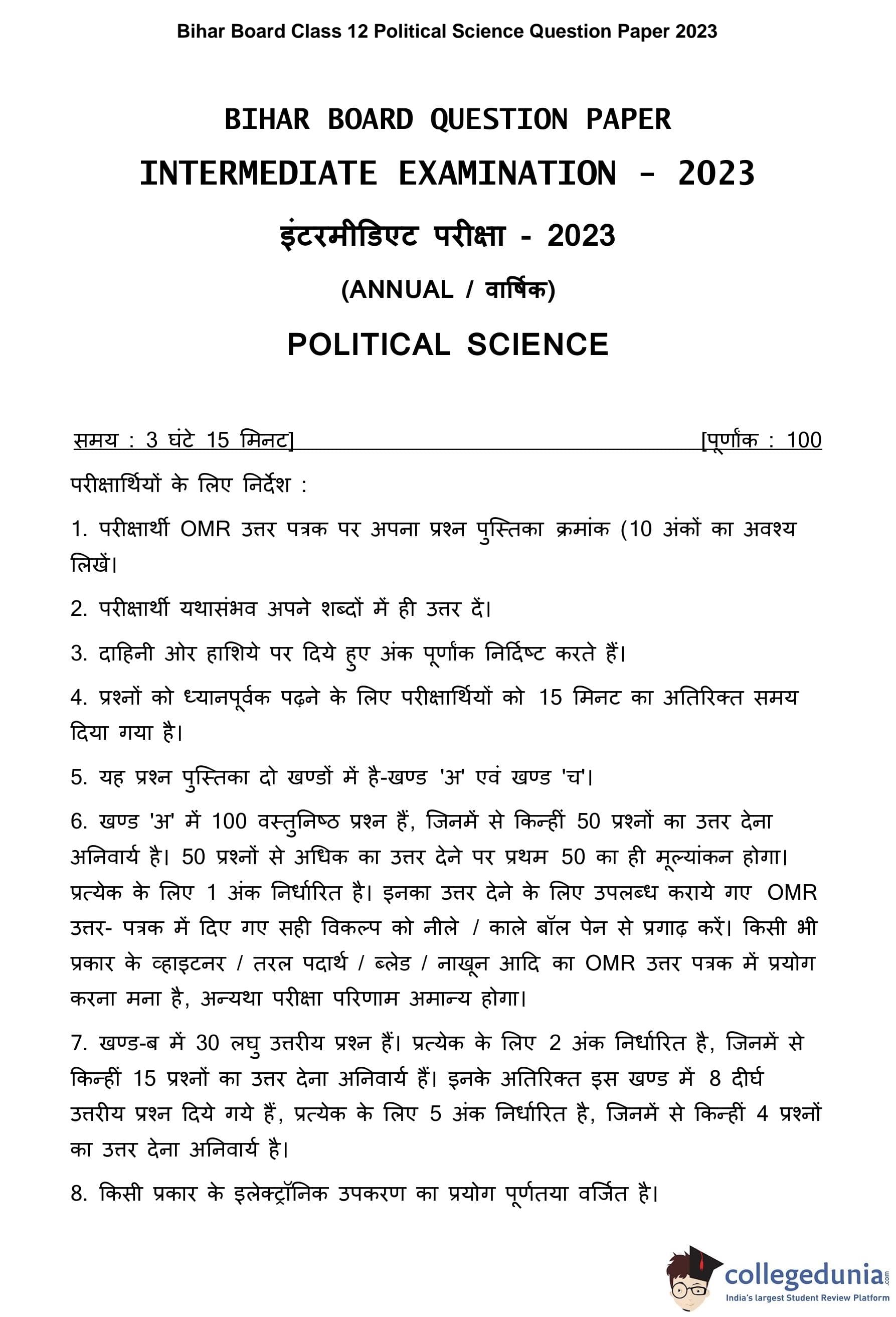 Bihar Board Class 12 Political Science Question Paper 2023 with Solutions