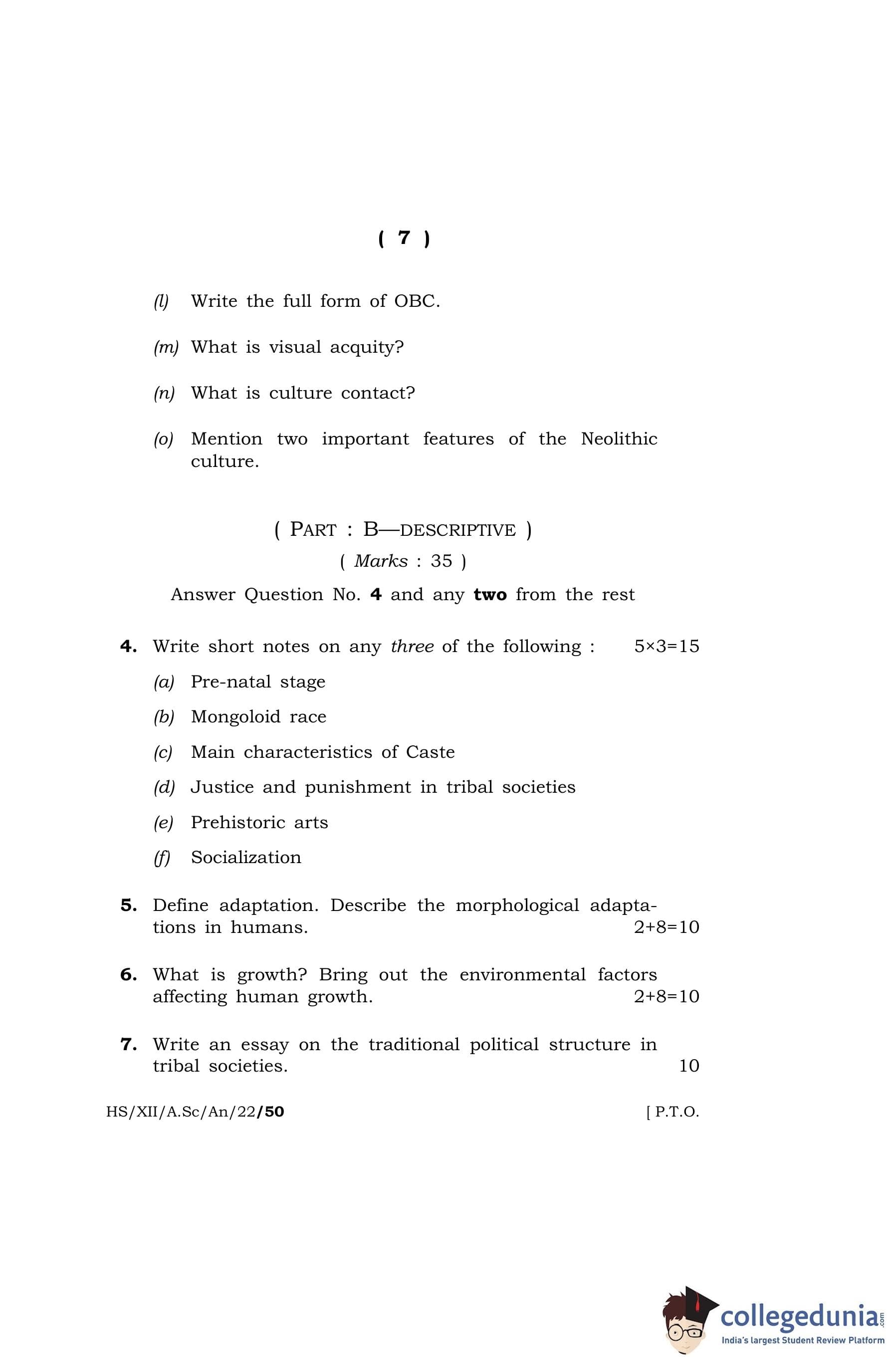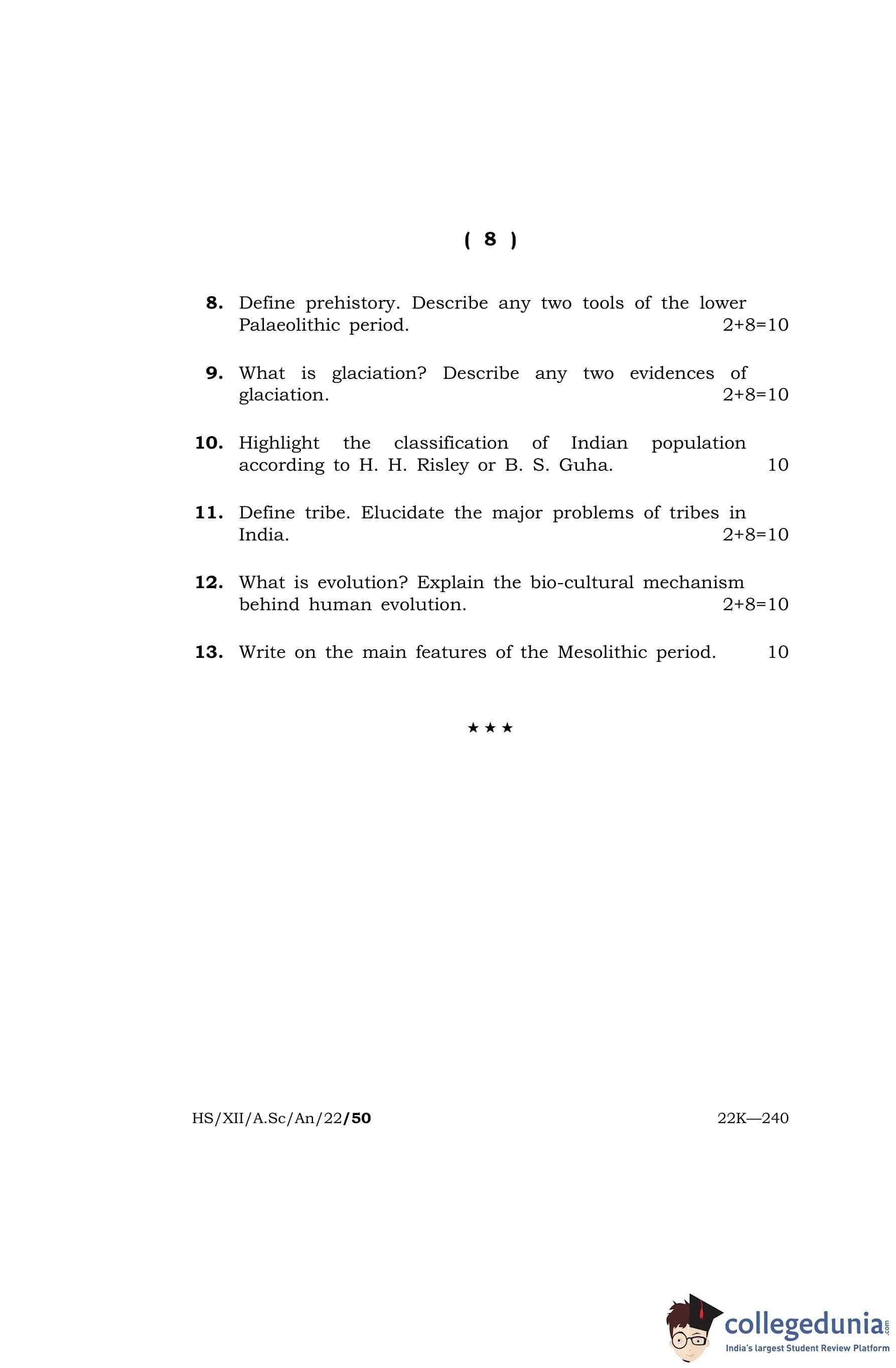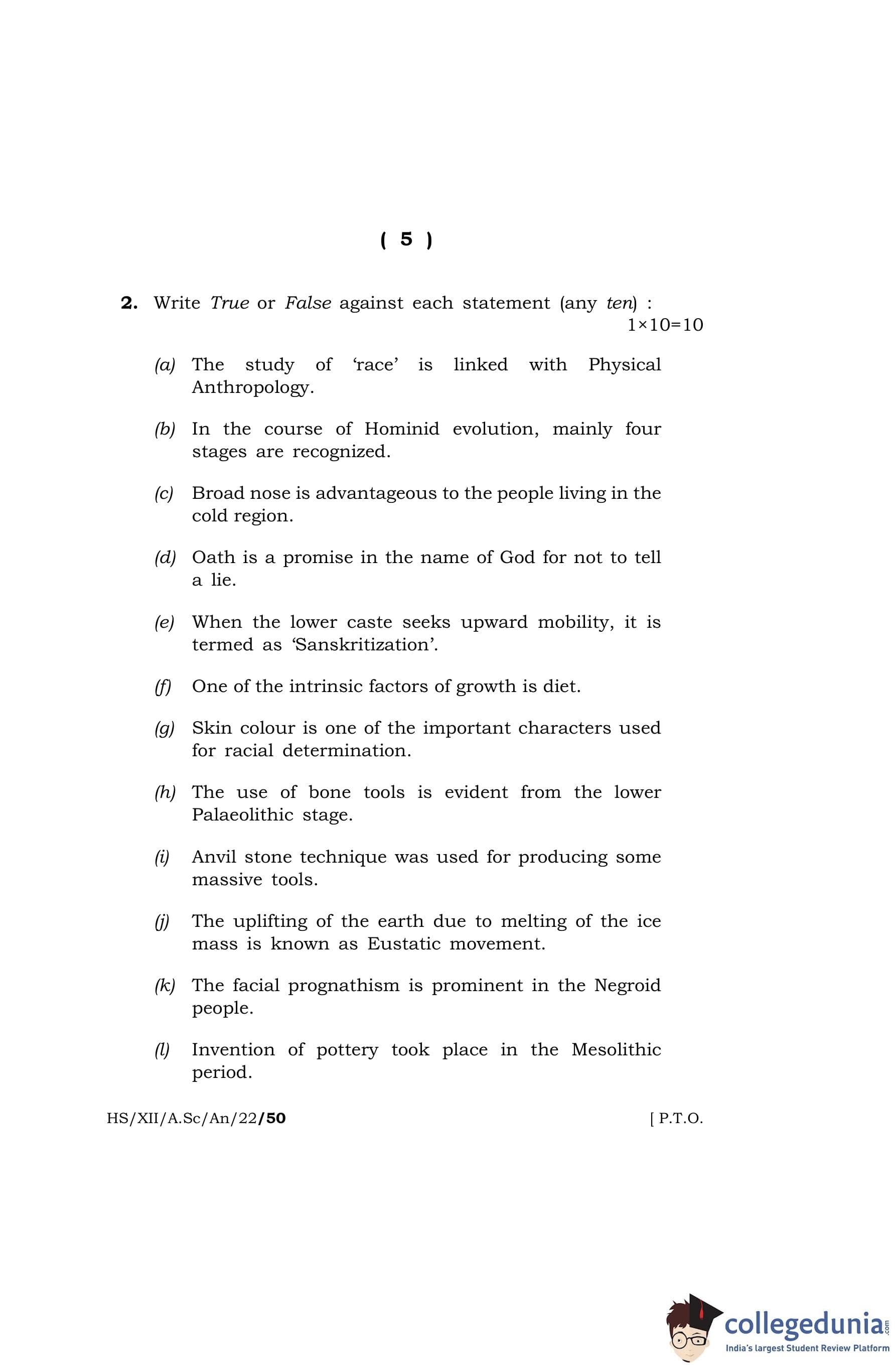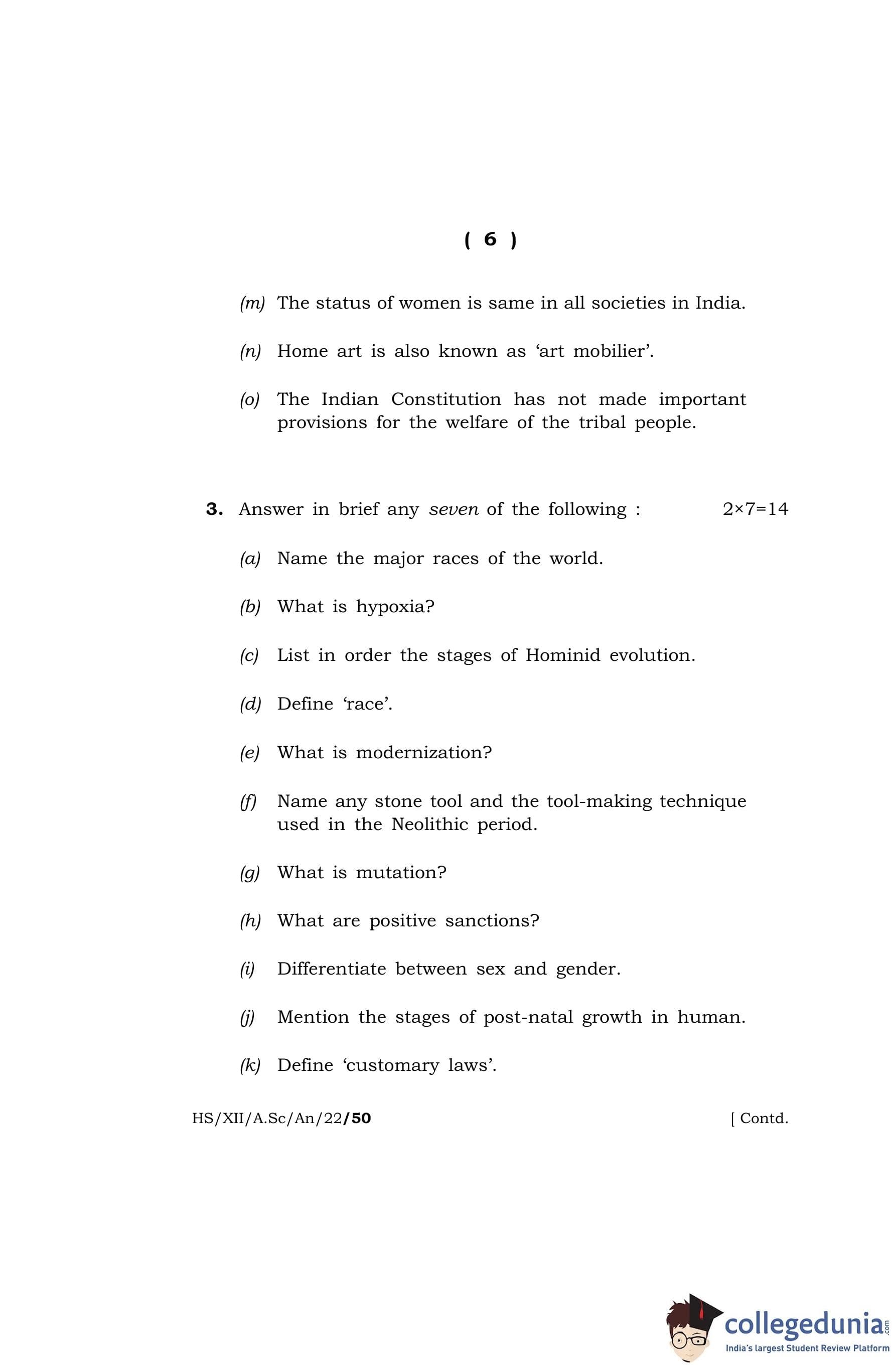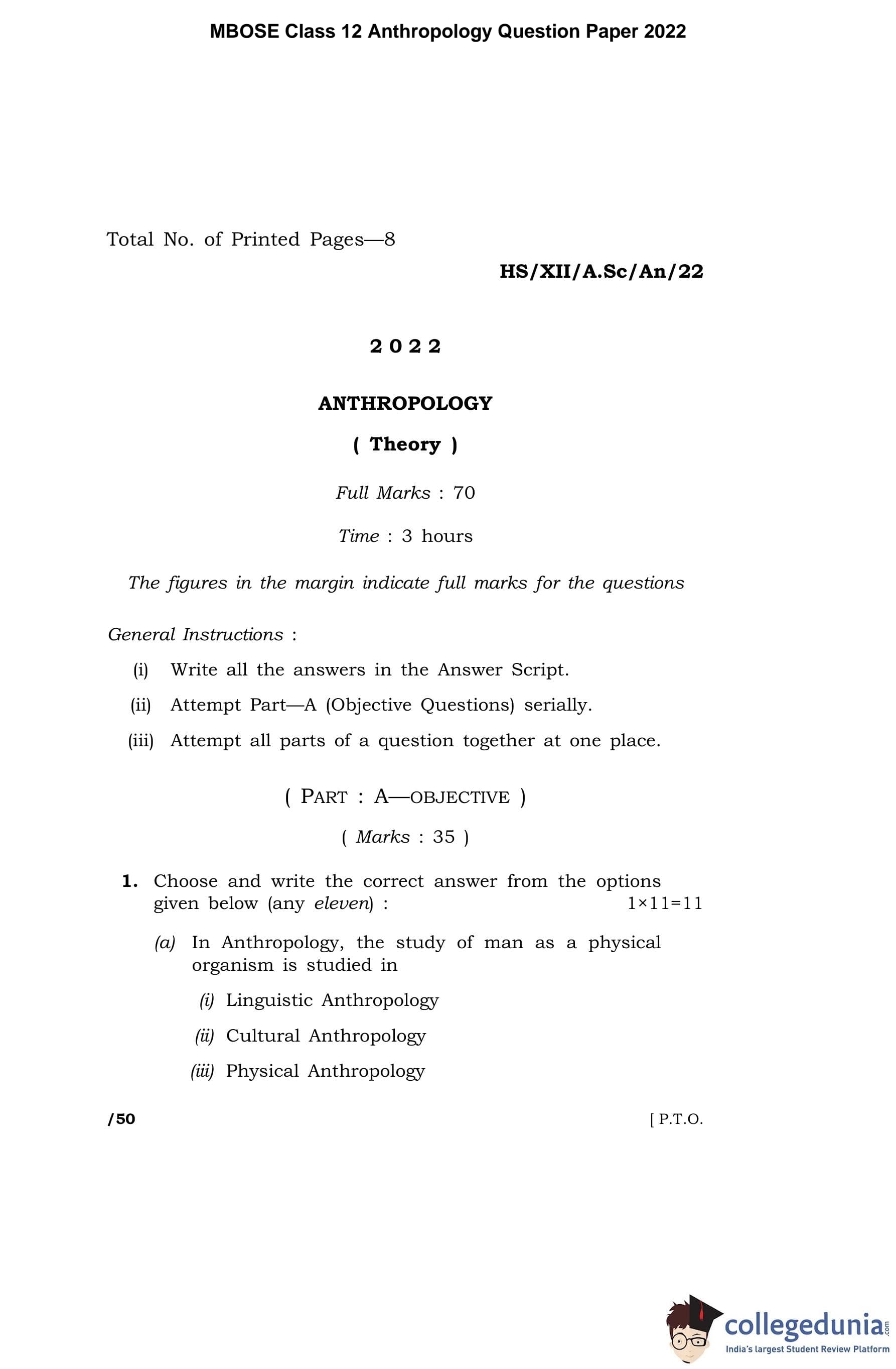 MBOSE Class 12 Anthropology Question Paper 2022 with Answer Key pdf is available for download here. The exam was conducted by Meghalaya Board of School Education on April 19, 2022 in the Morning Session 10 AM to 1 PM. The question paper comprised a total of 13 questions divided among 2 sections.