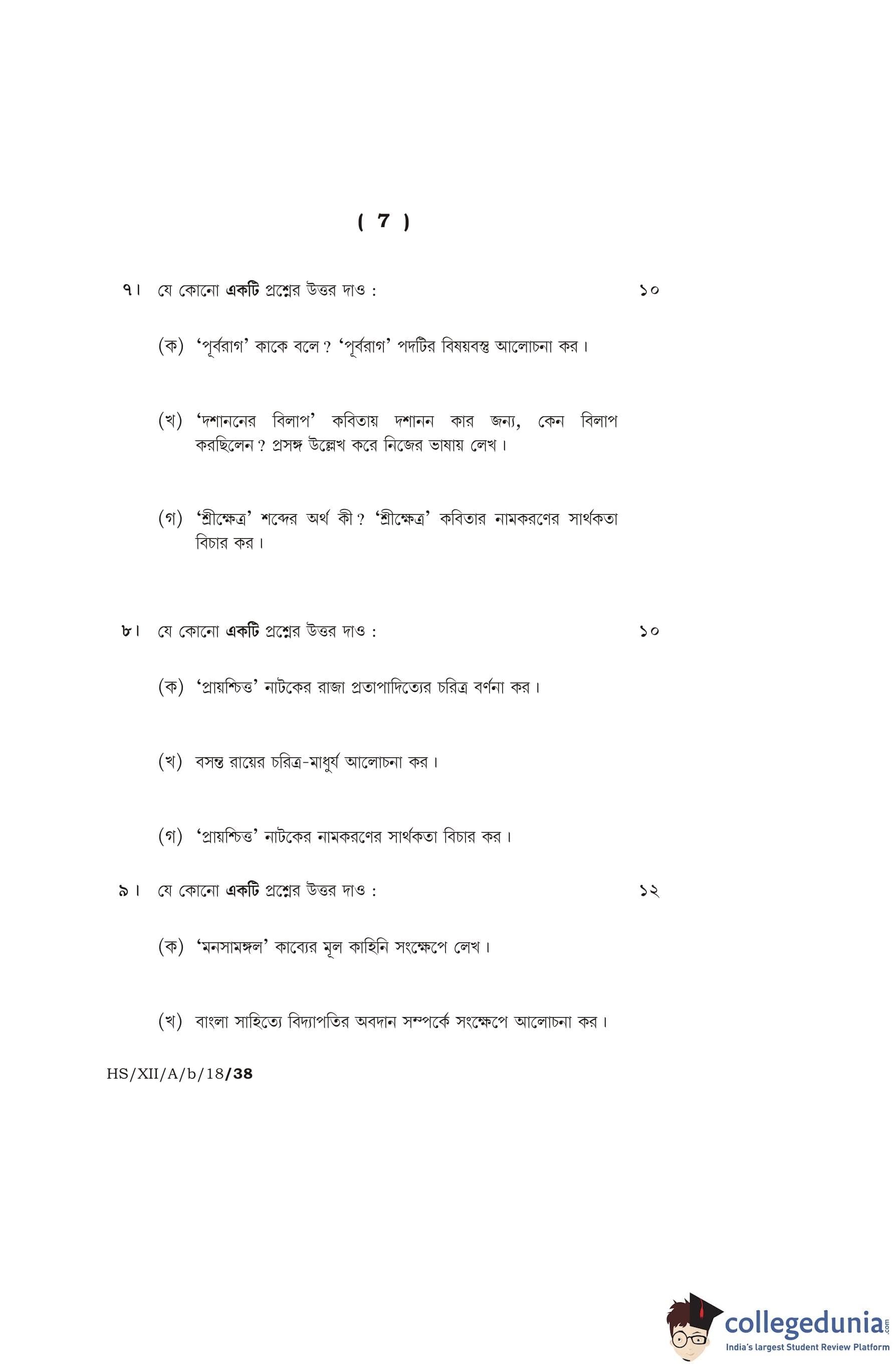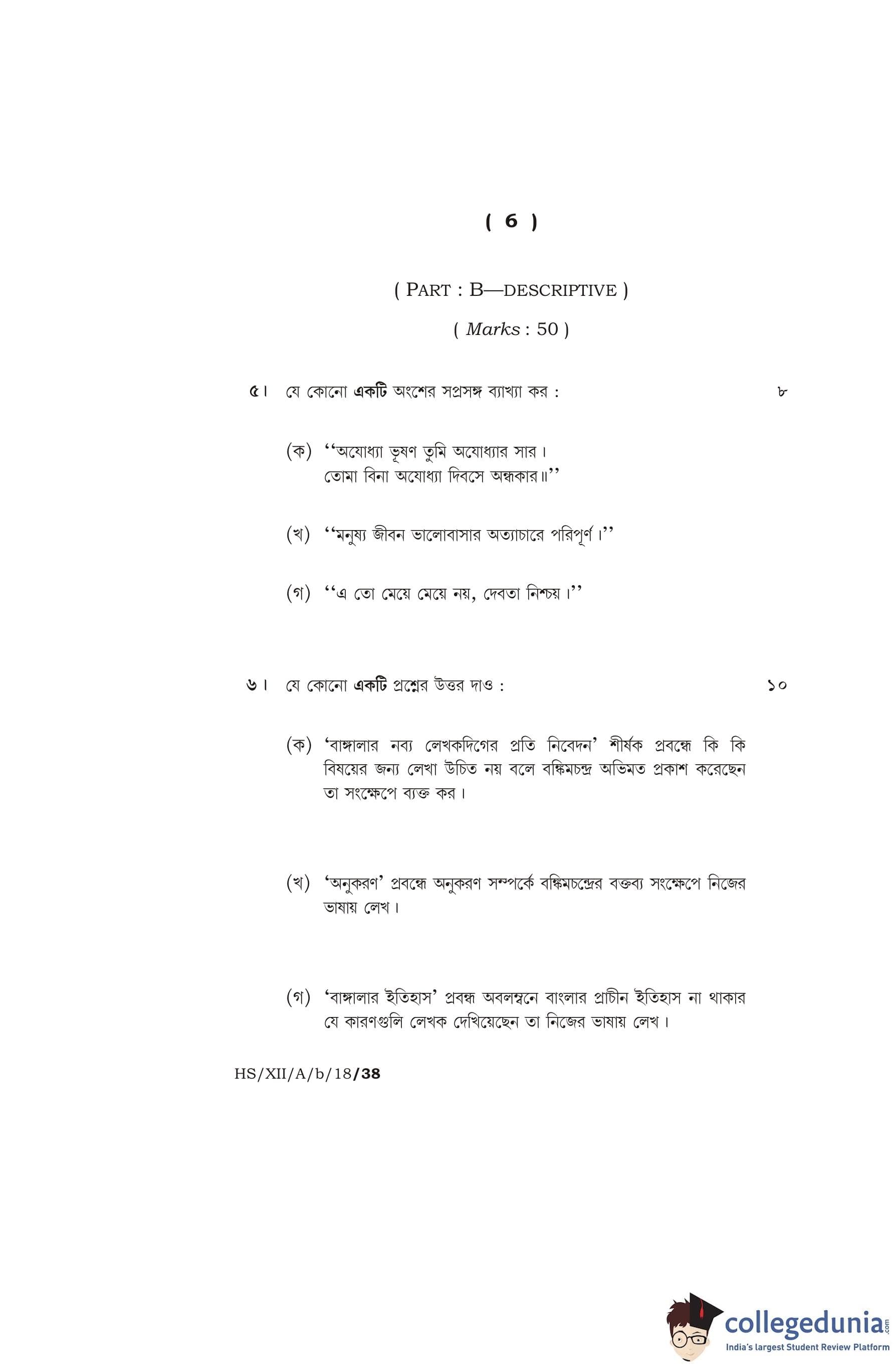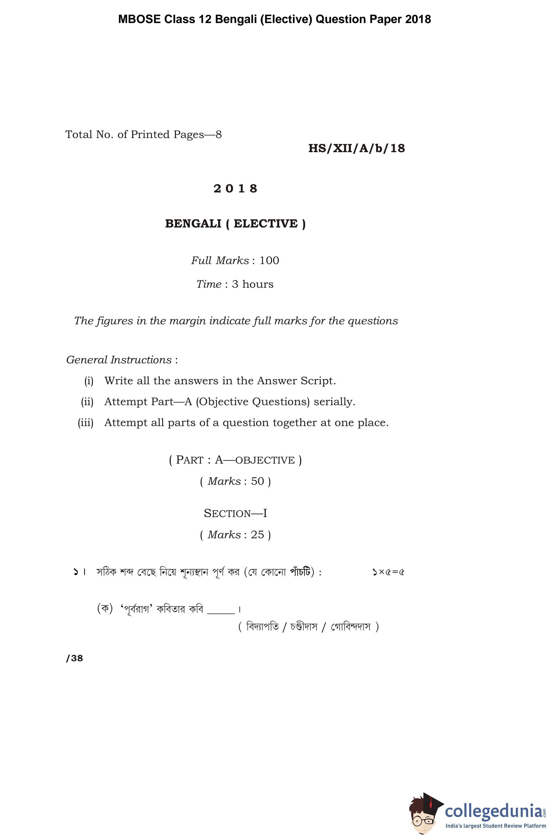 MBOSE Class 12 Bengali (Elective) Question Paper 2018