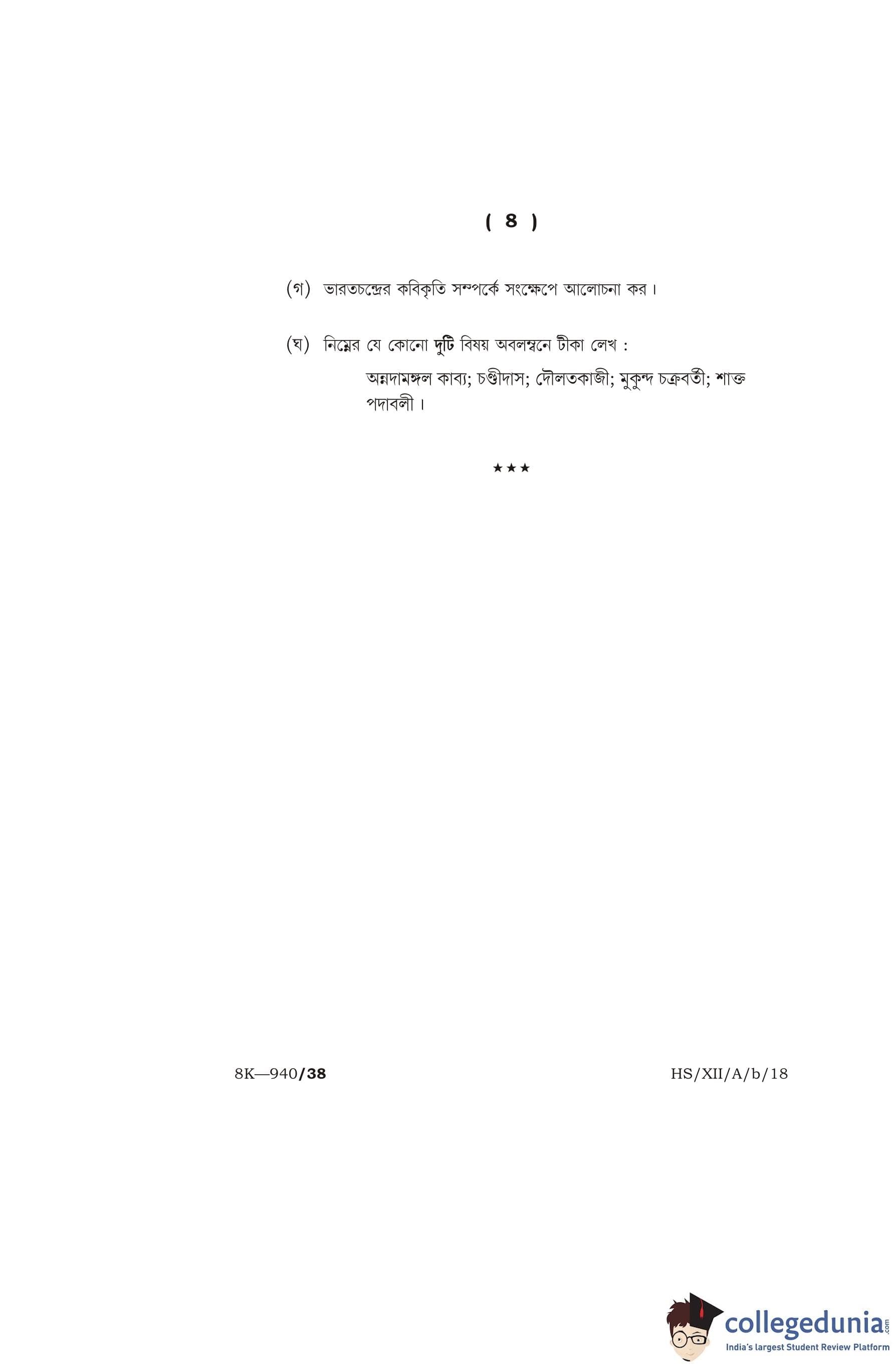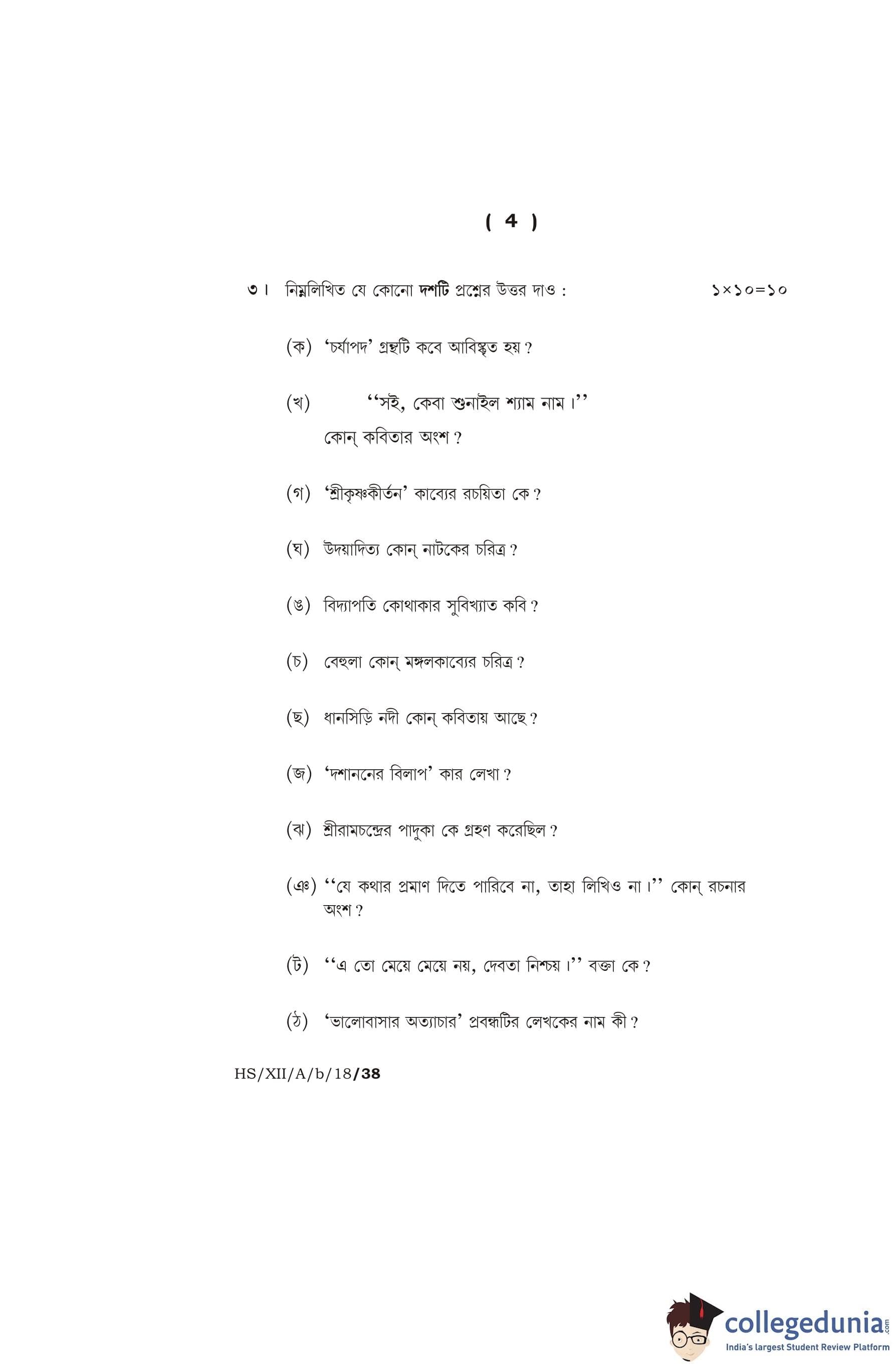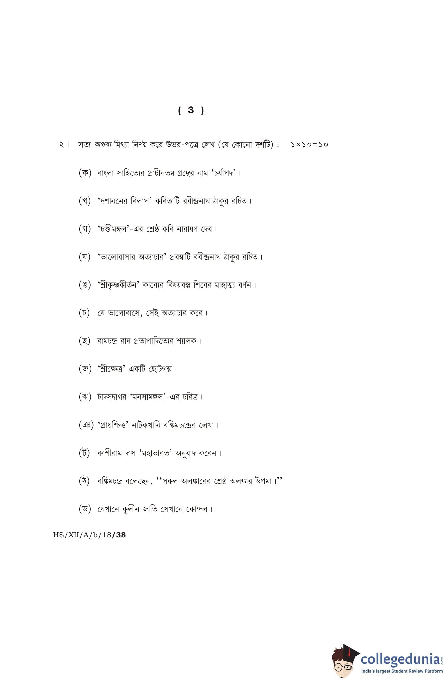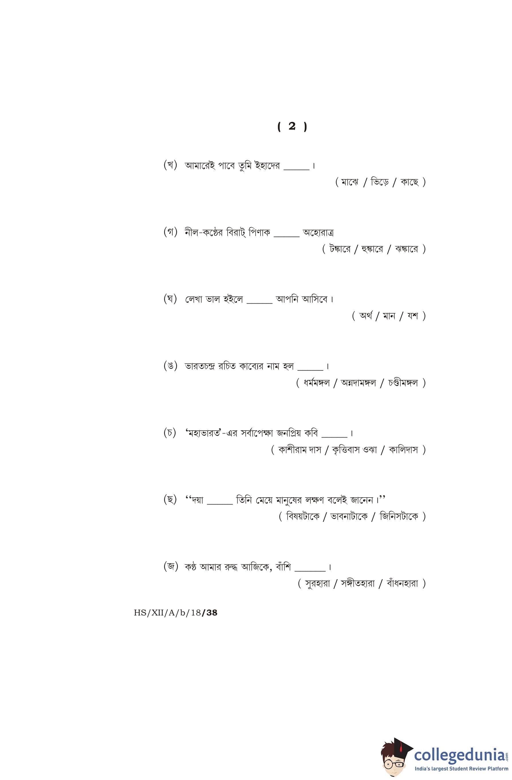 MBOSE Class 12 Bengali (Elective) Question Paper 2018
