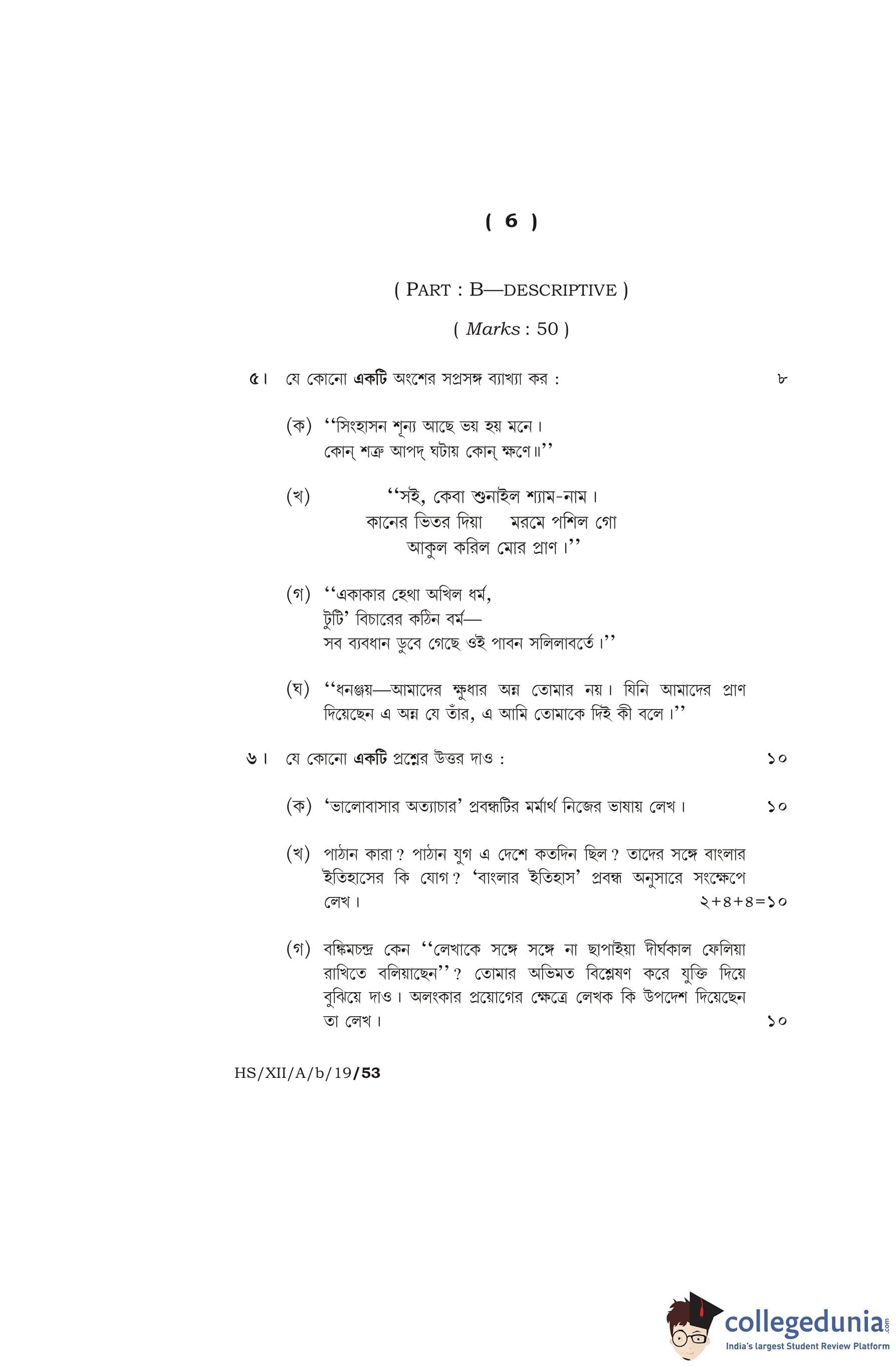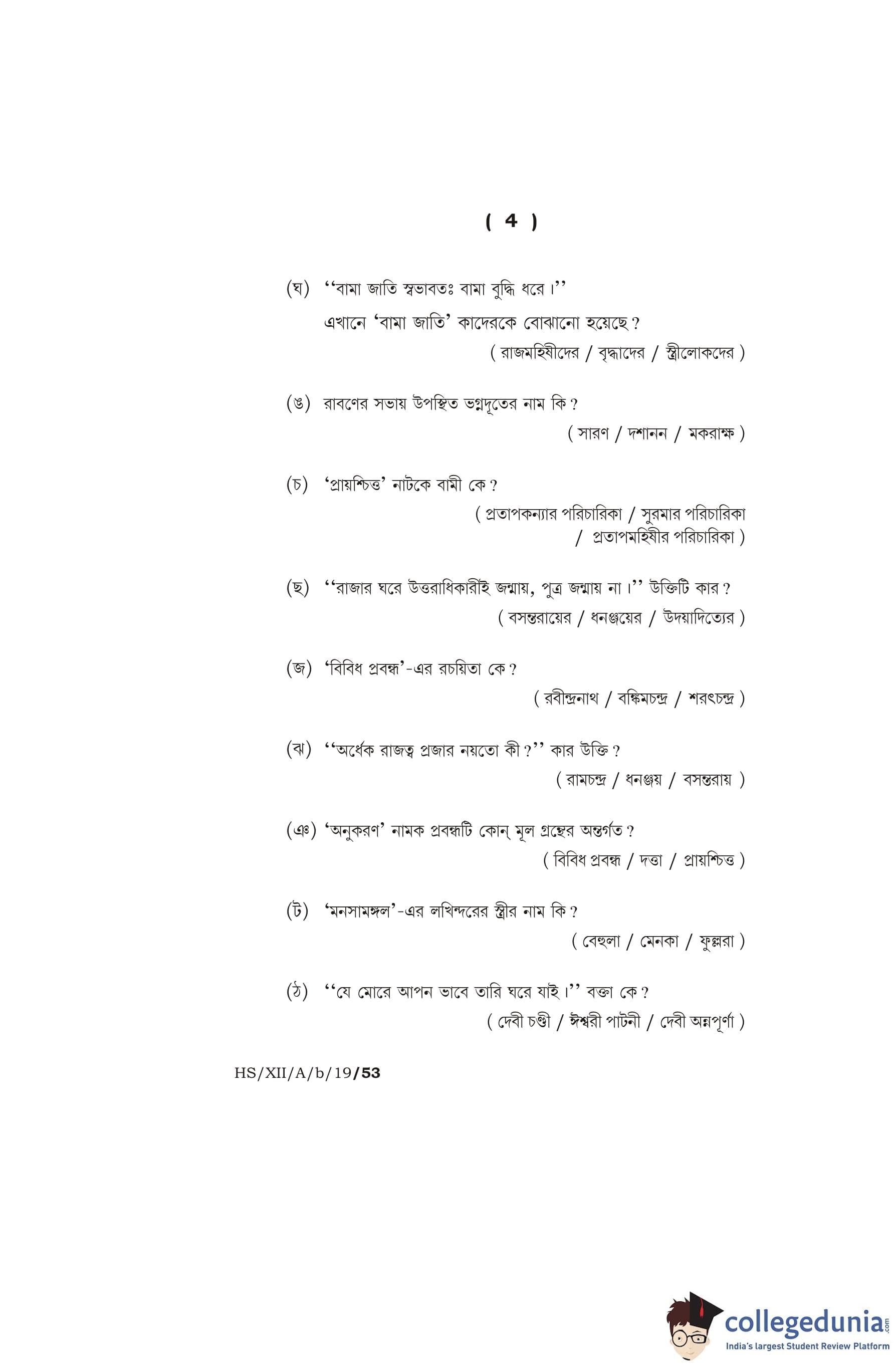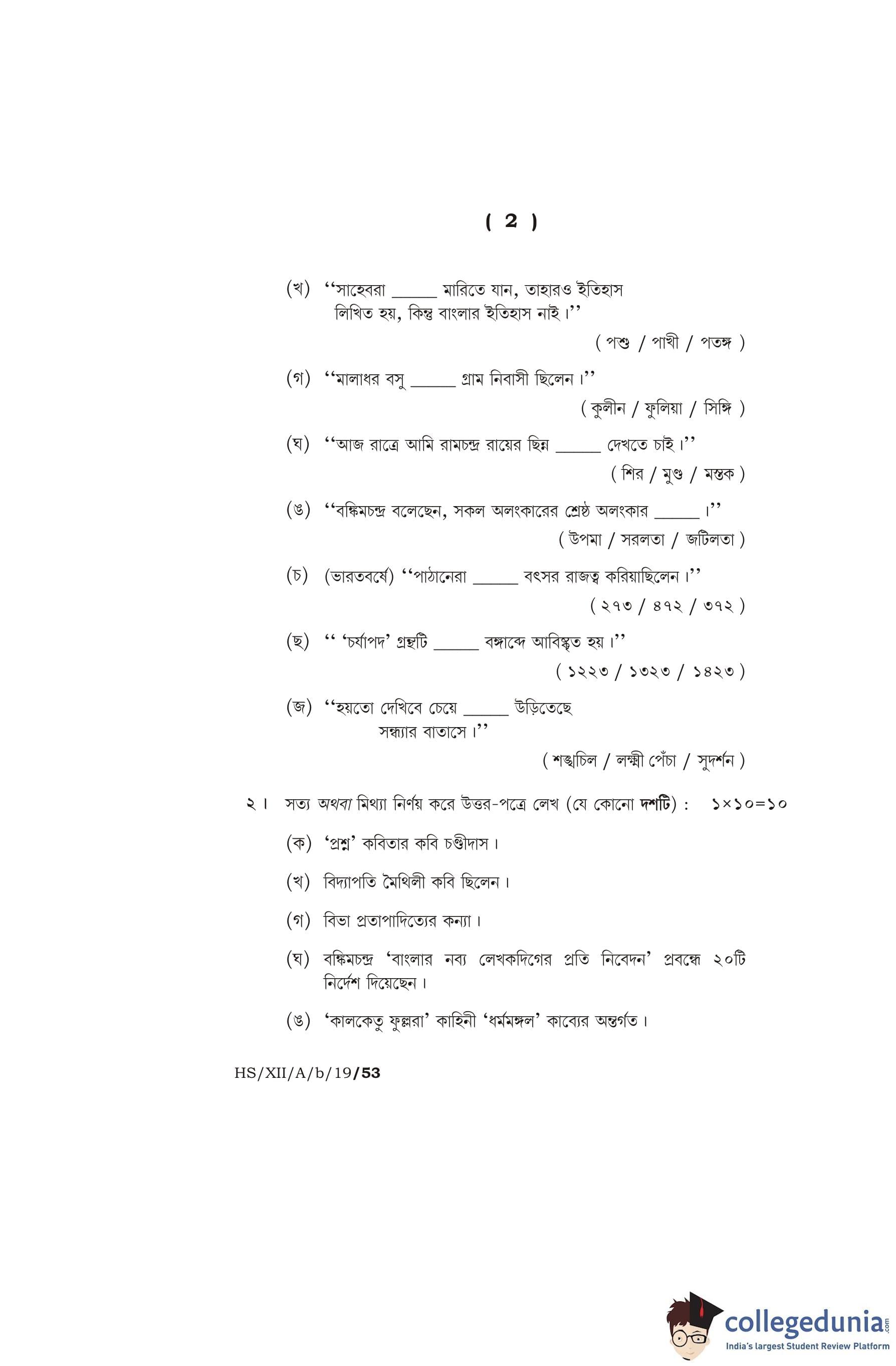 MBOSE Class 12 Bengali (Elective) Question Paper 2019