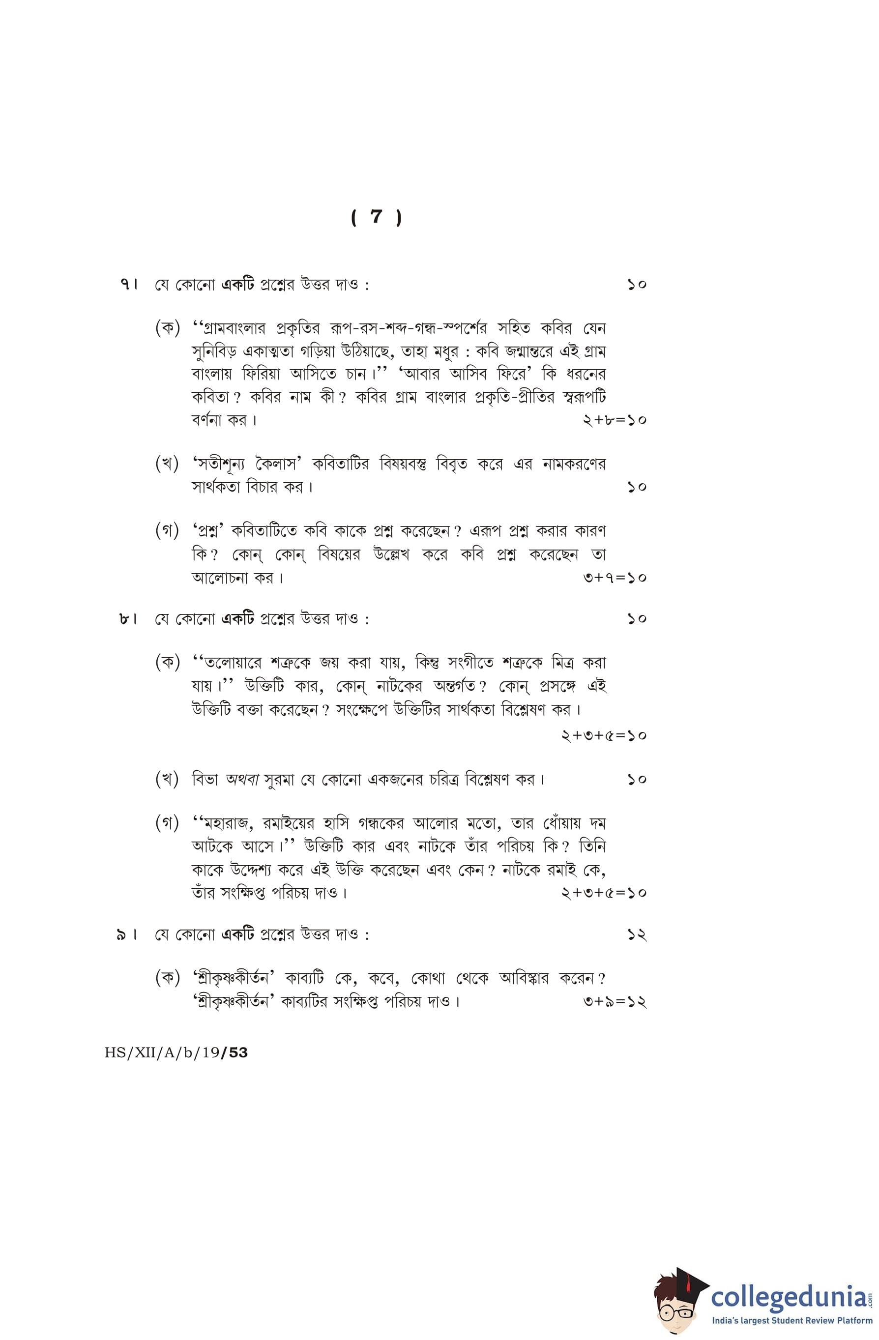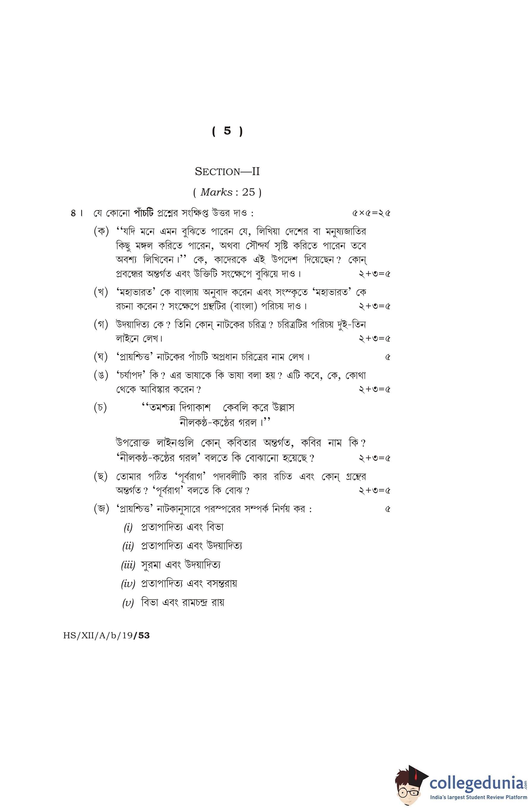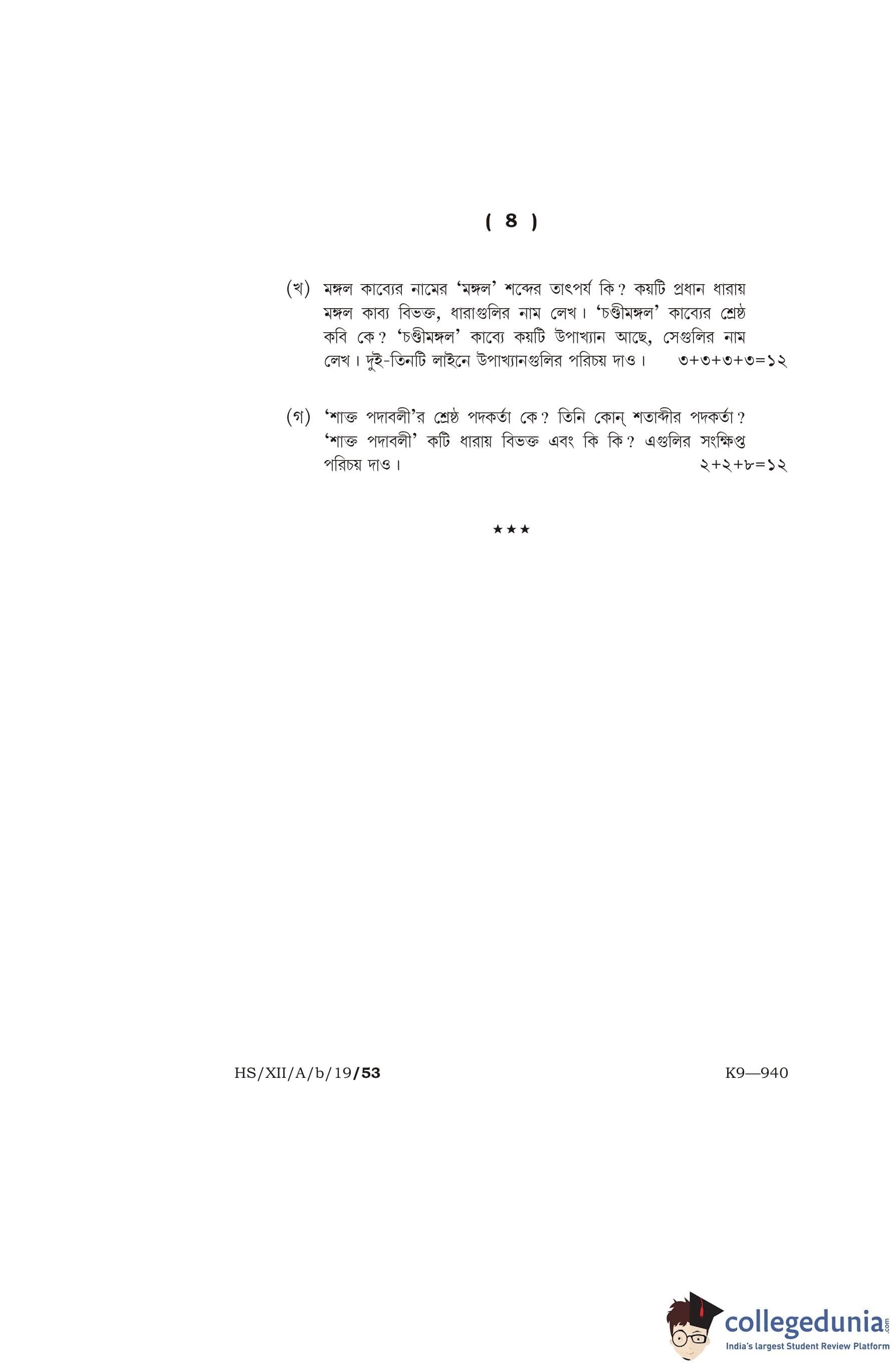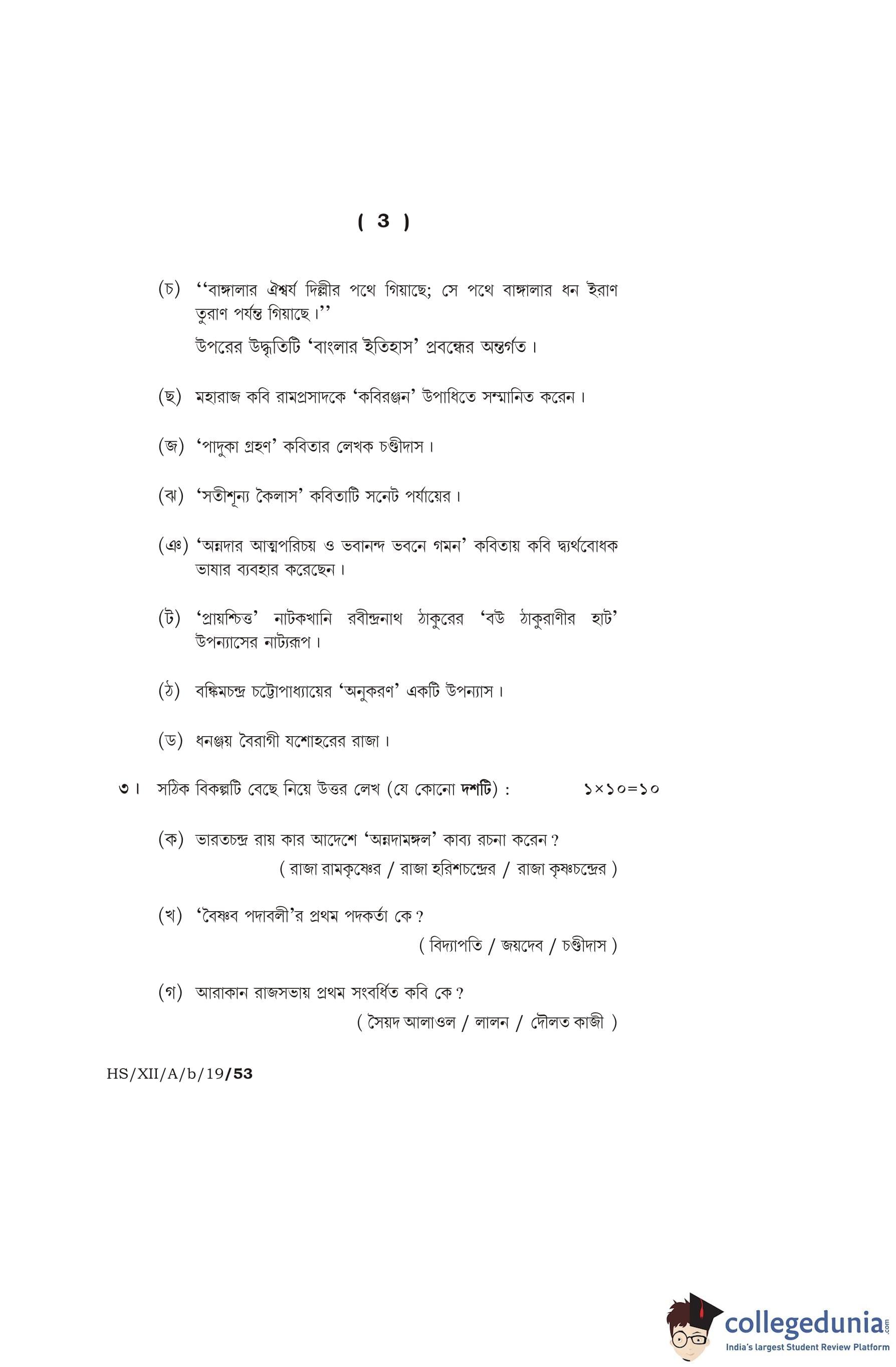 MBOSE Class 12 Bengali (Elective) Question Paper 2019