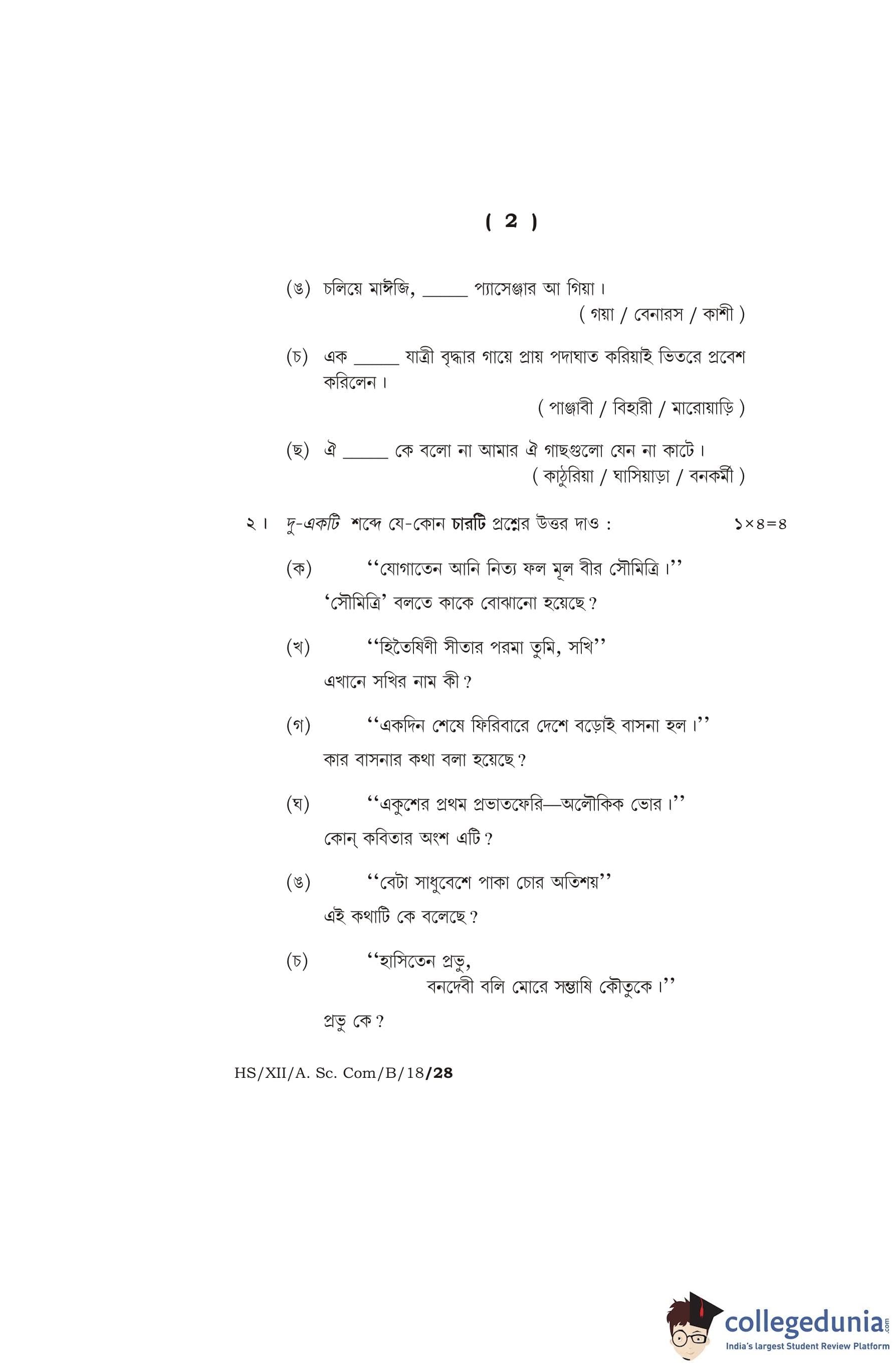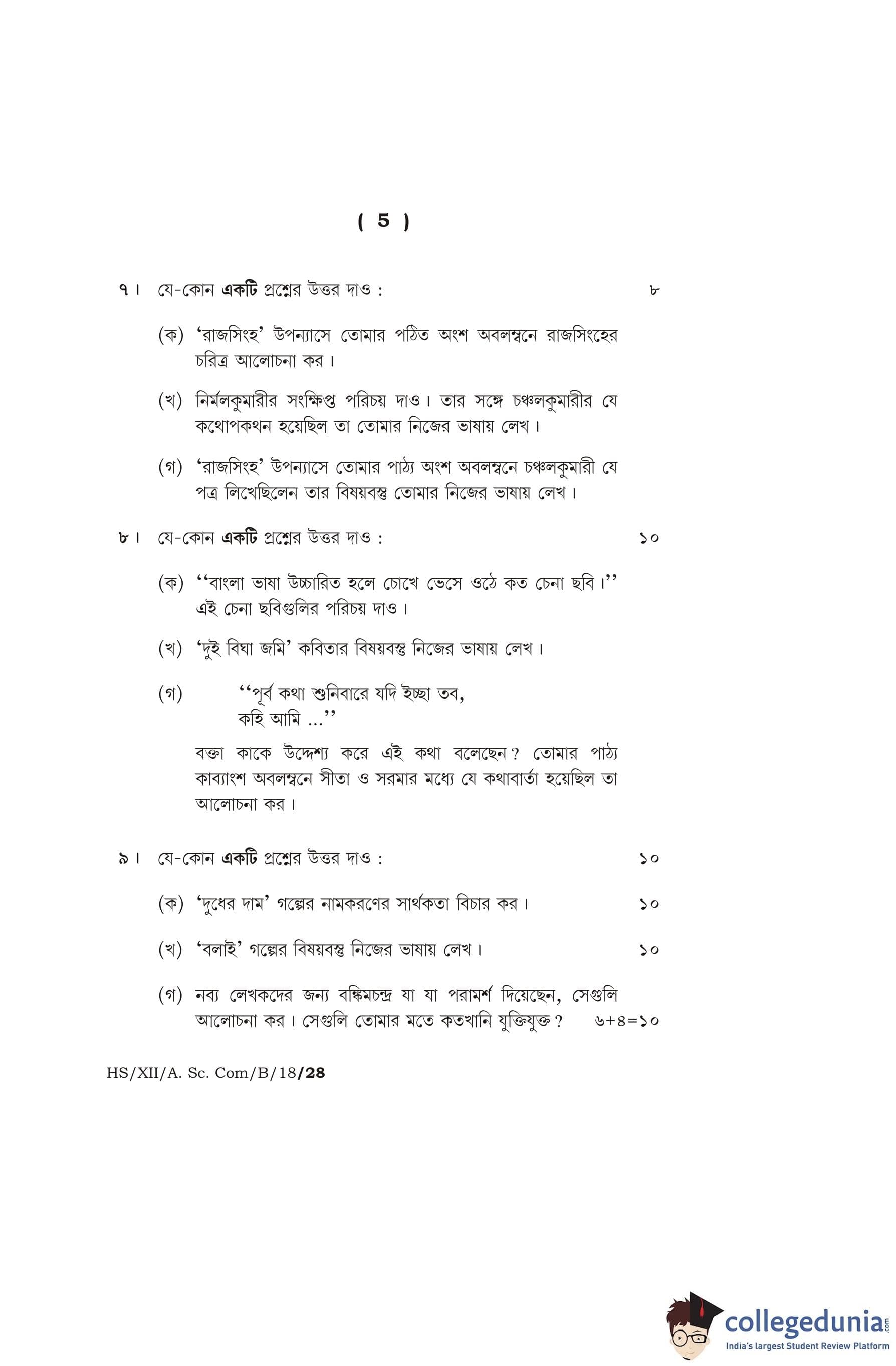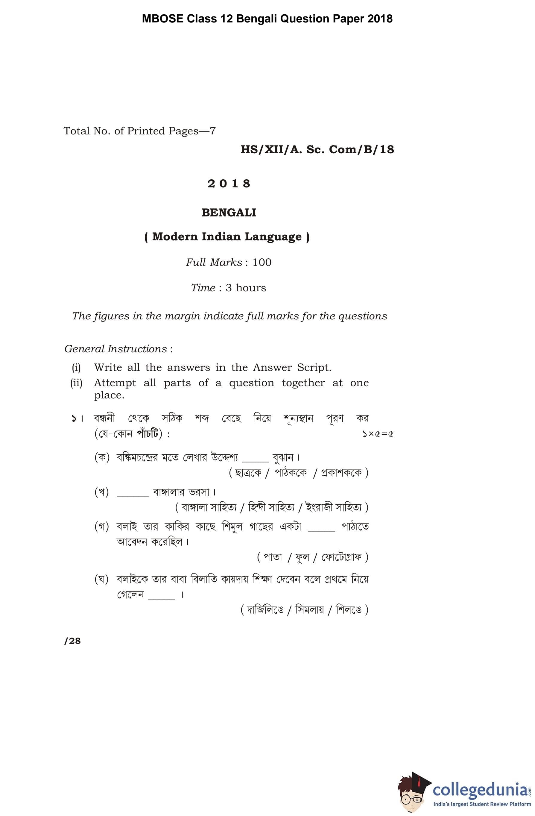 MBOSE Class 12 Bengali Question Paper 2018