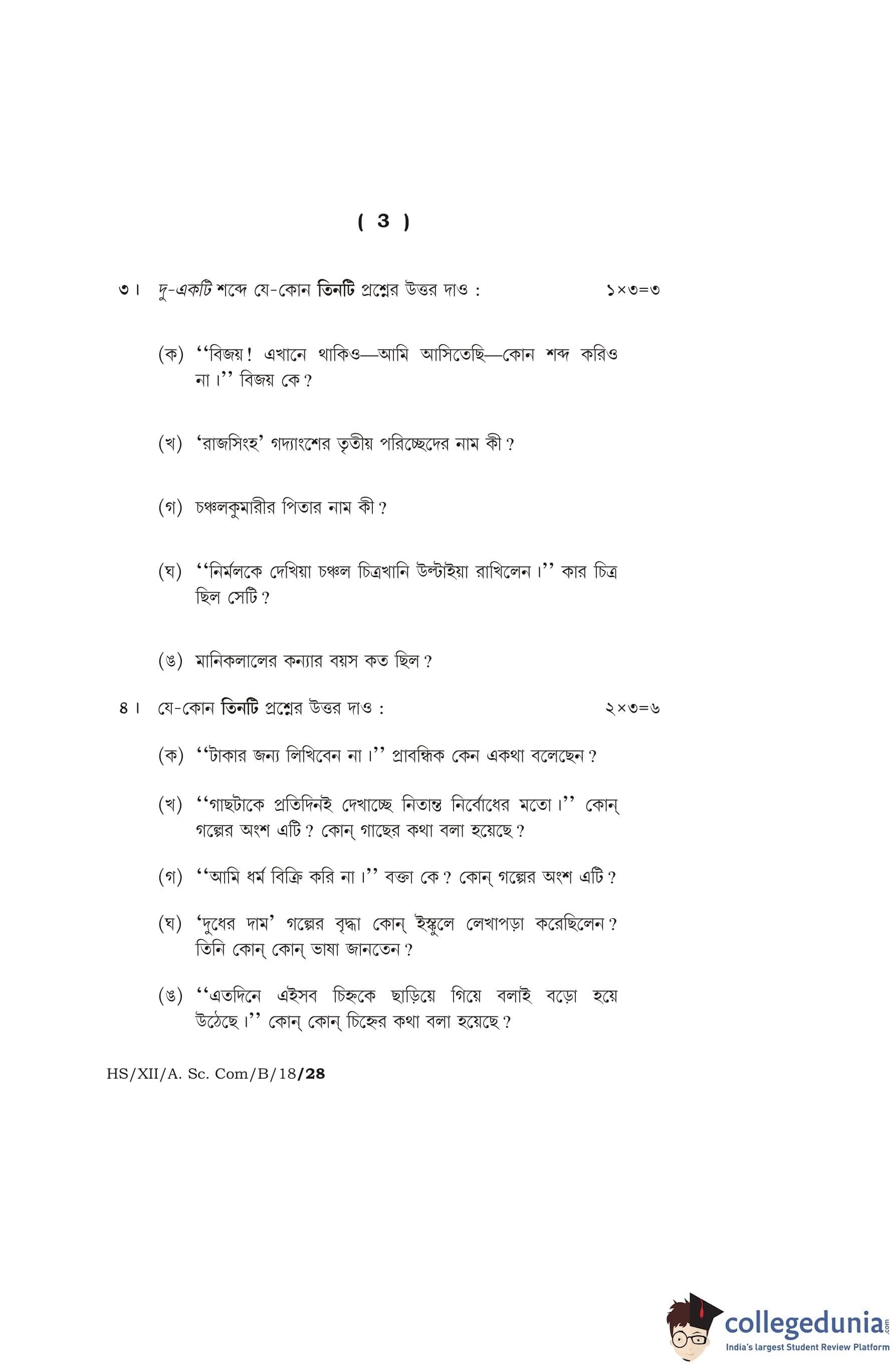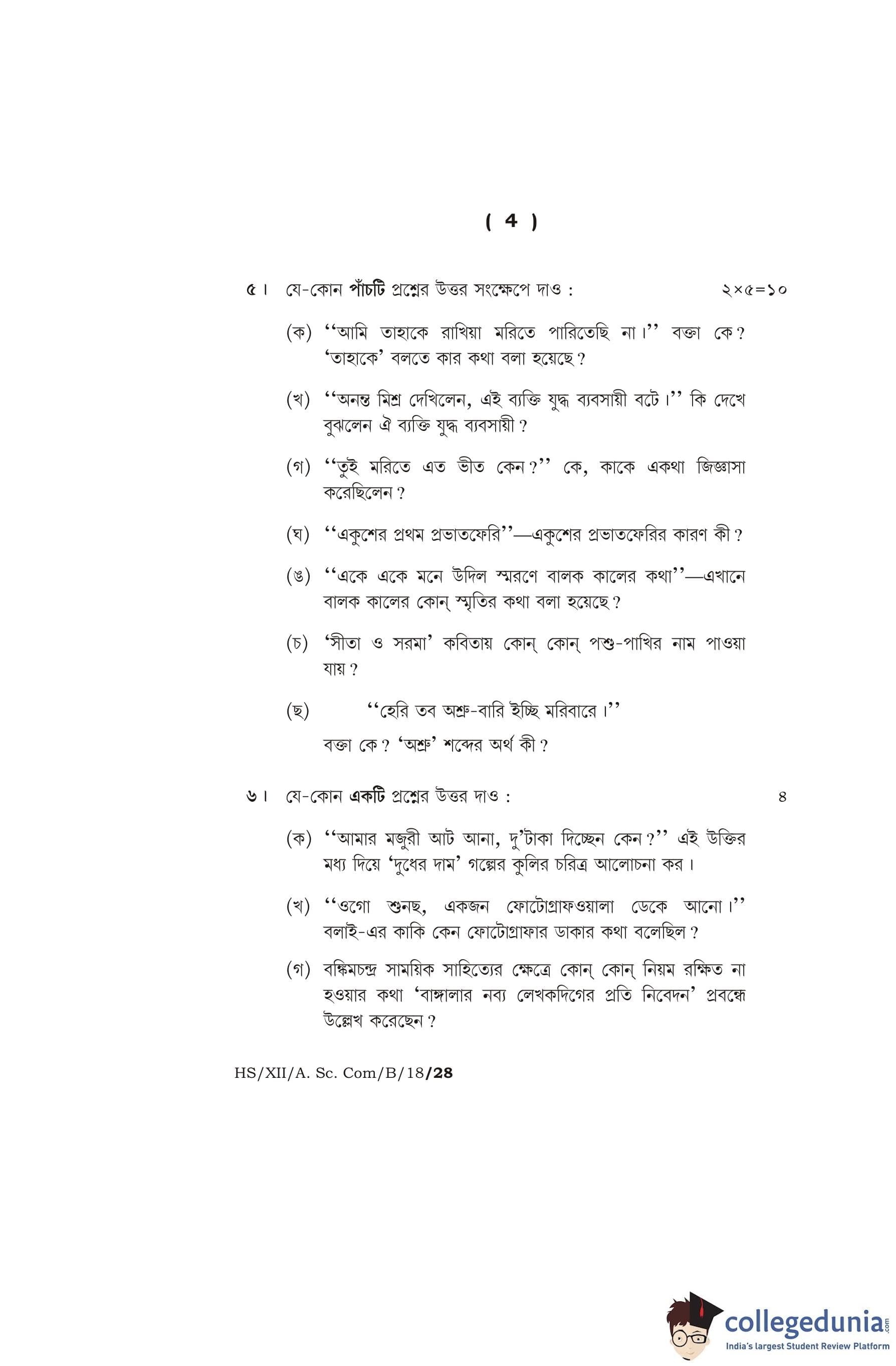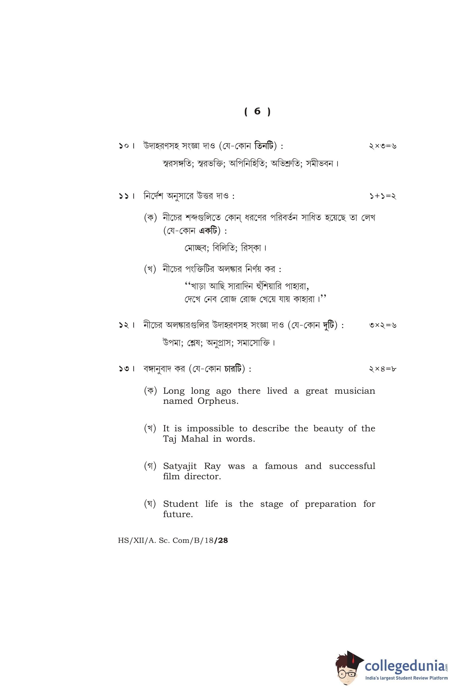 MBOSE Class 12 Bengali Question Paper 2018