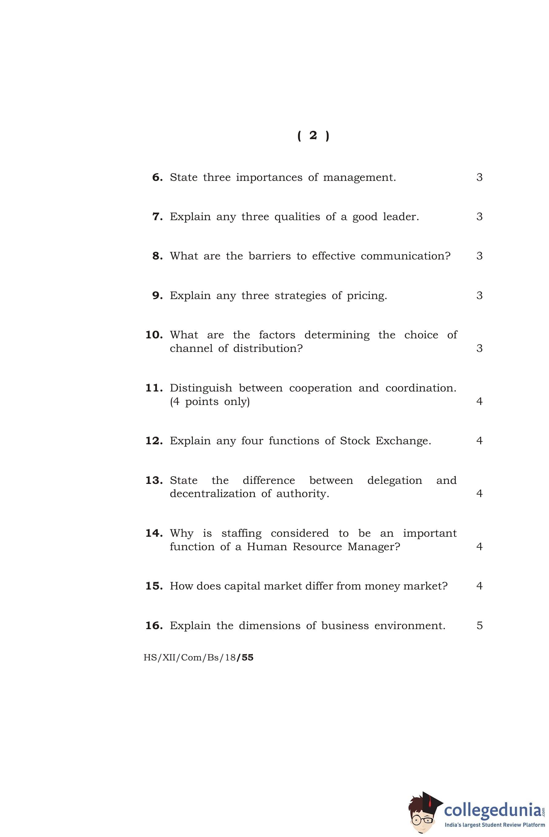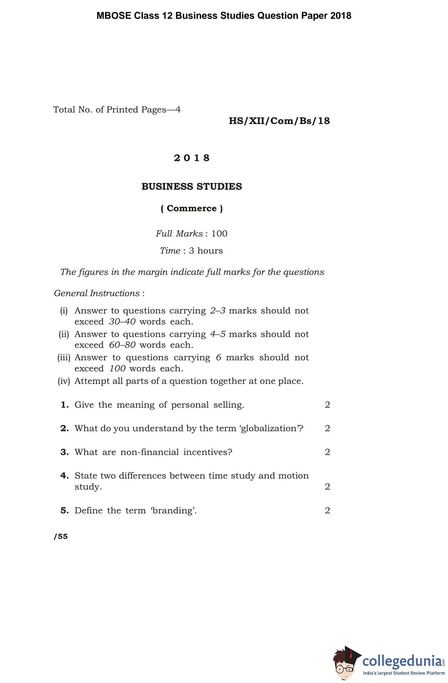 MBOSE Class 12 Business Studies Question Paper 2018 with Answer Key