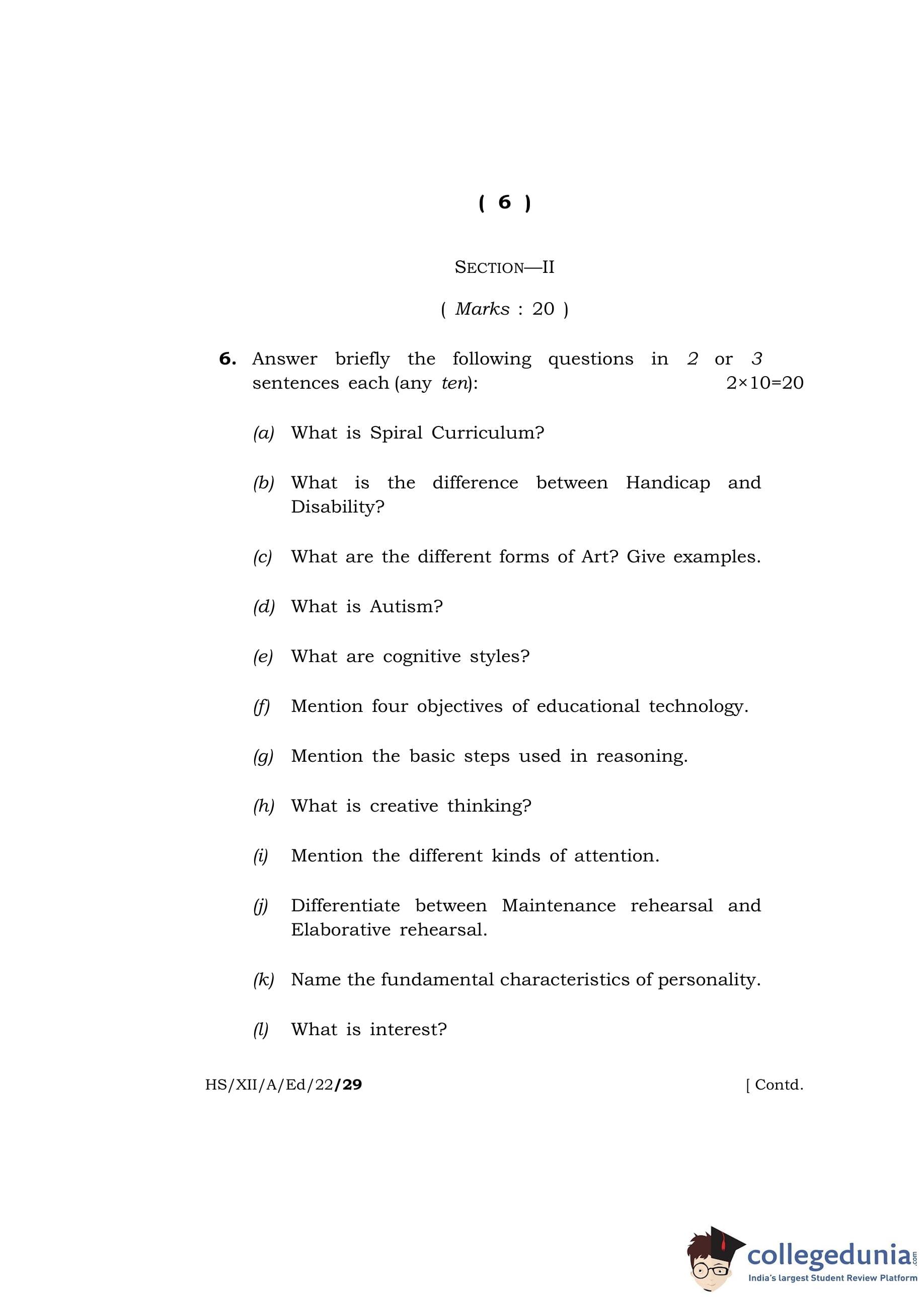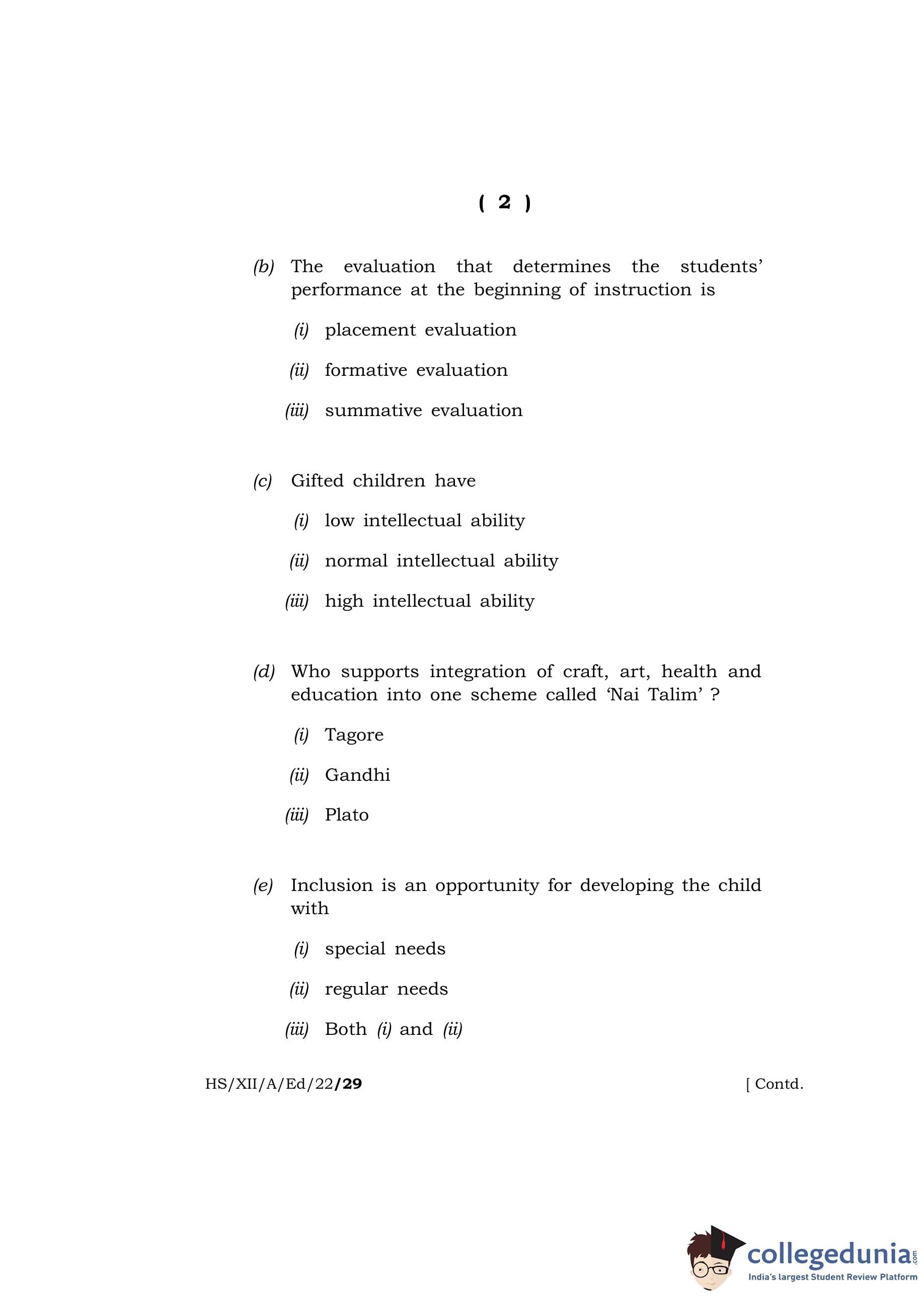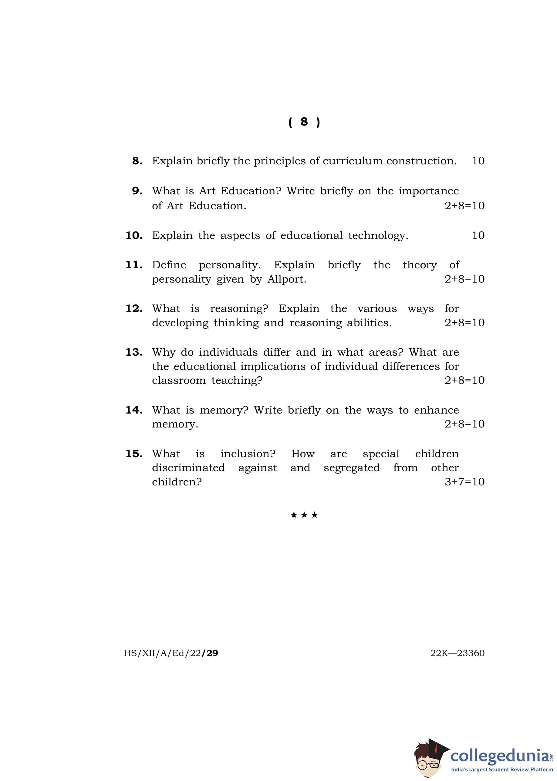 MBOSE Class 12 Education Question Paper 2022 with Answer Key pdf is available for download here. The exam was conducted by Meghalaya Board of School Education on April 12, 2022 in the Morning Session 10 AM to 1 PM. The question paper comprised a total of 15 questions divided among 2 sections.