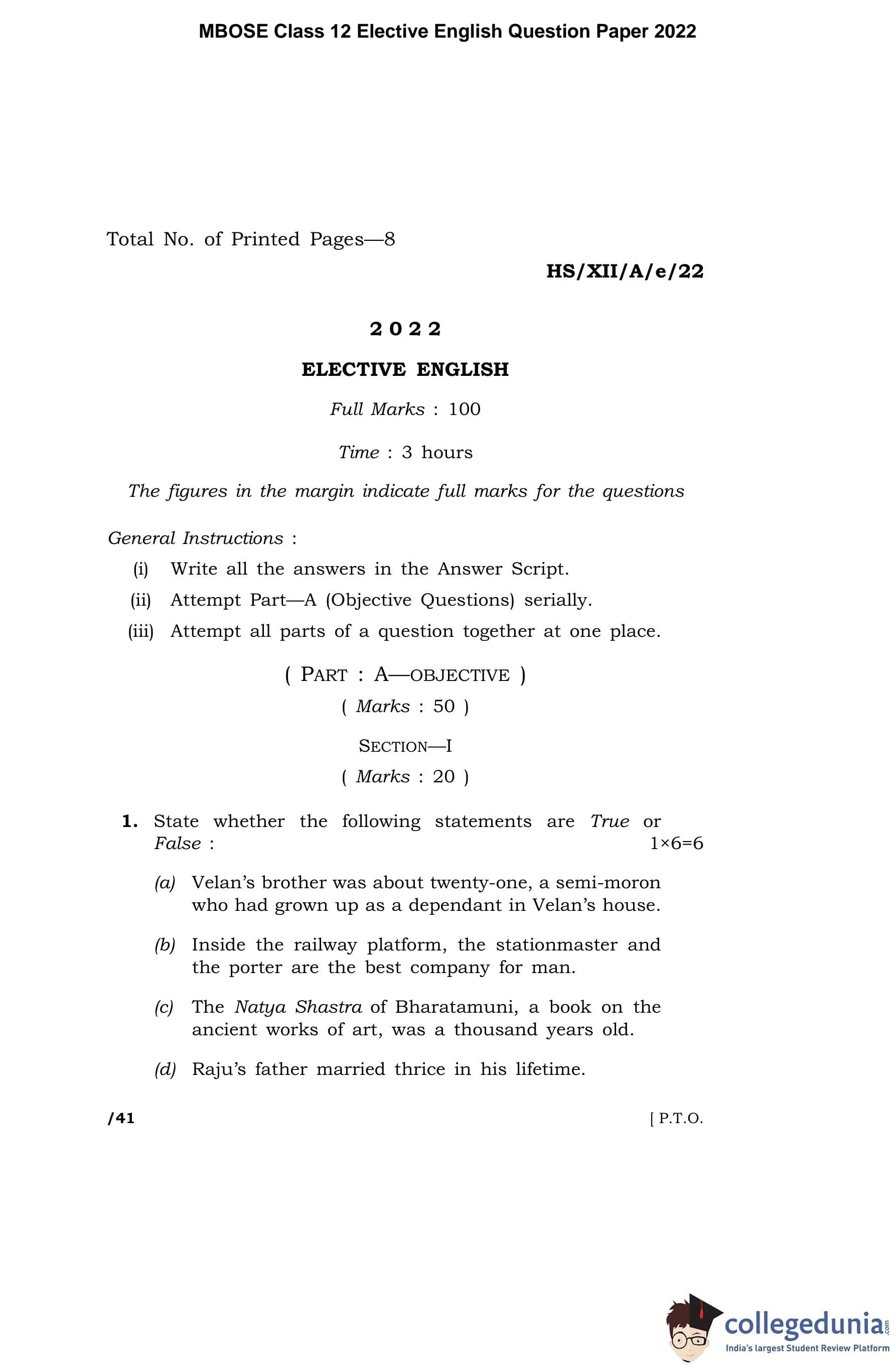 | MBOSE Class 12 Elective English Question Paper 2022 PDF | MBOSE Class 12 Elective English Answer Key 2022 PDF |