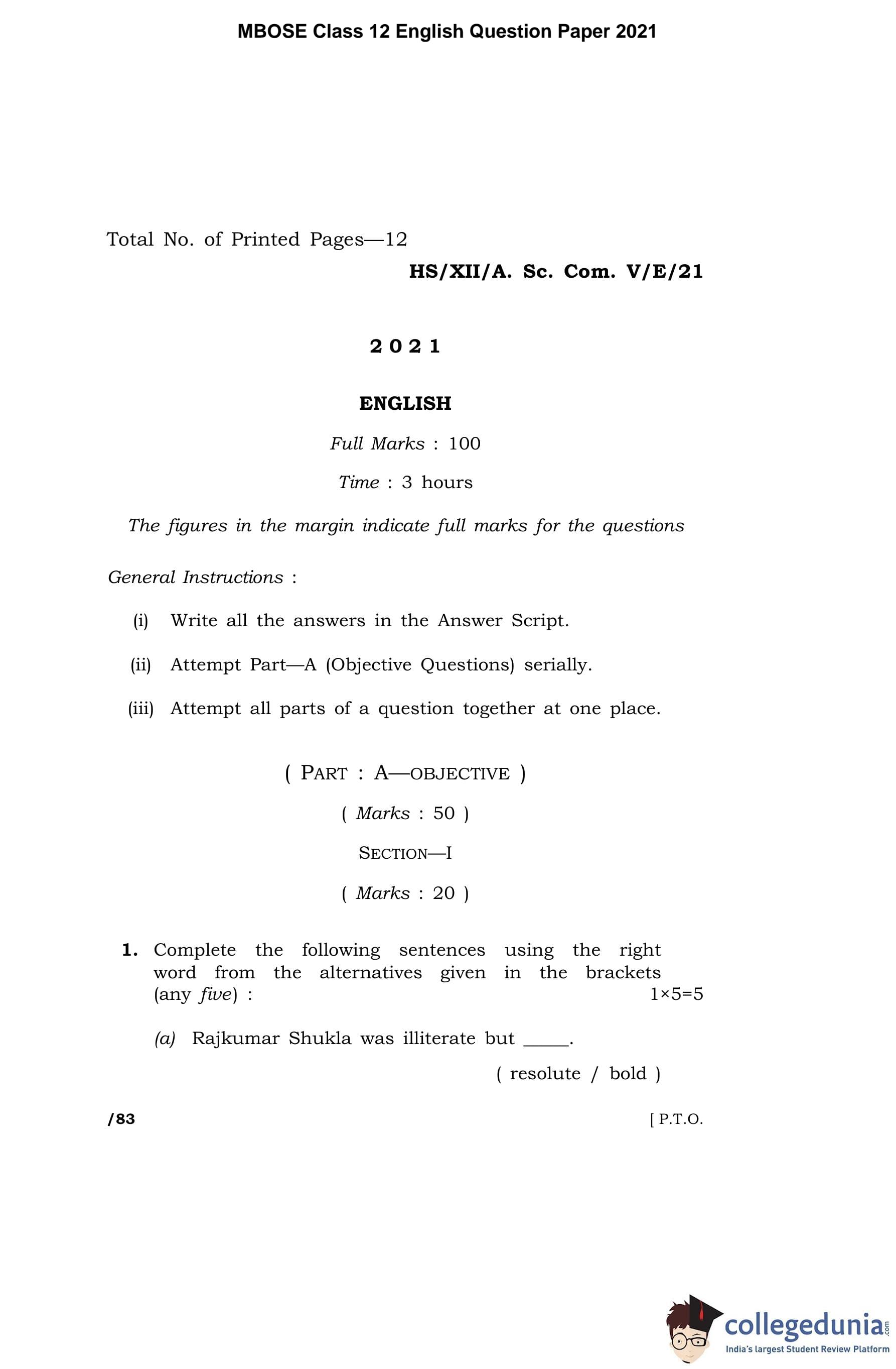 | MBOSE Class 12 English Question Paper 2021 PDF | MBOSE Class 12 English Answer Key 2021 PDF |